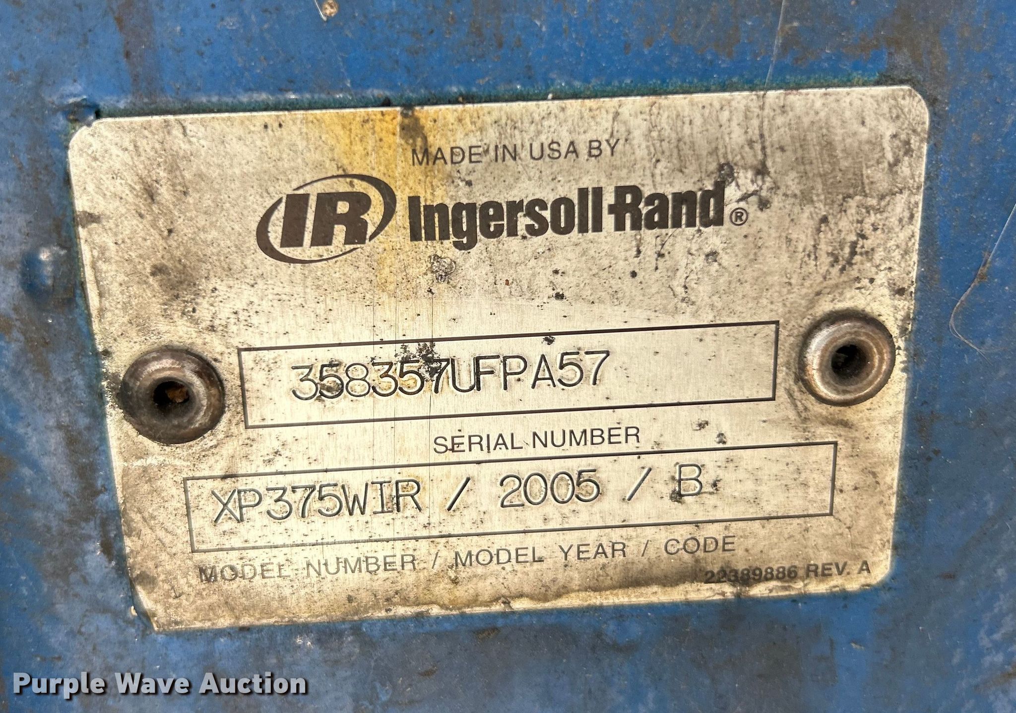 Purple Wave is selling a used Air Compressor in Missouri. This item is a 2005 Ingersoll Rand XP375WIR air compressor with the following: Serial: 358357UFPA57