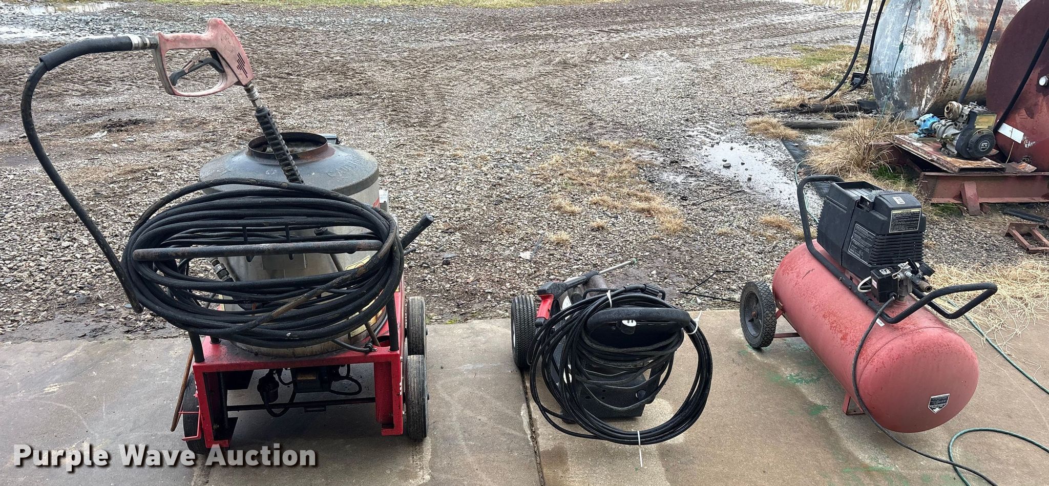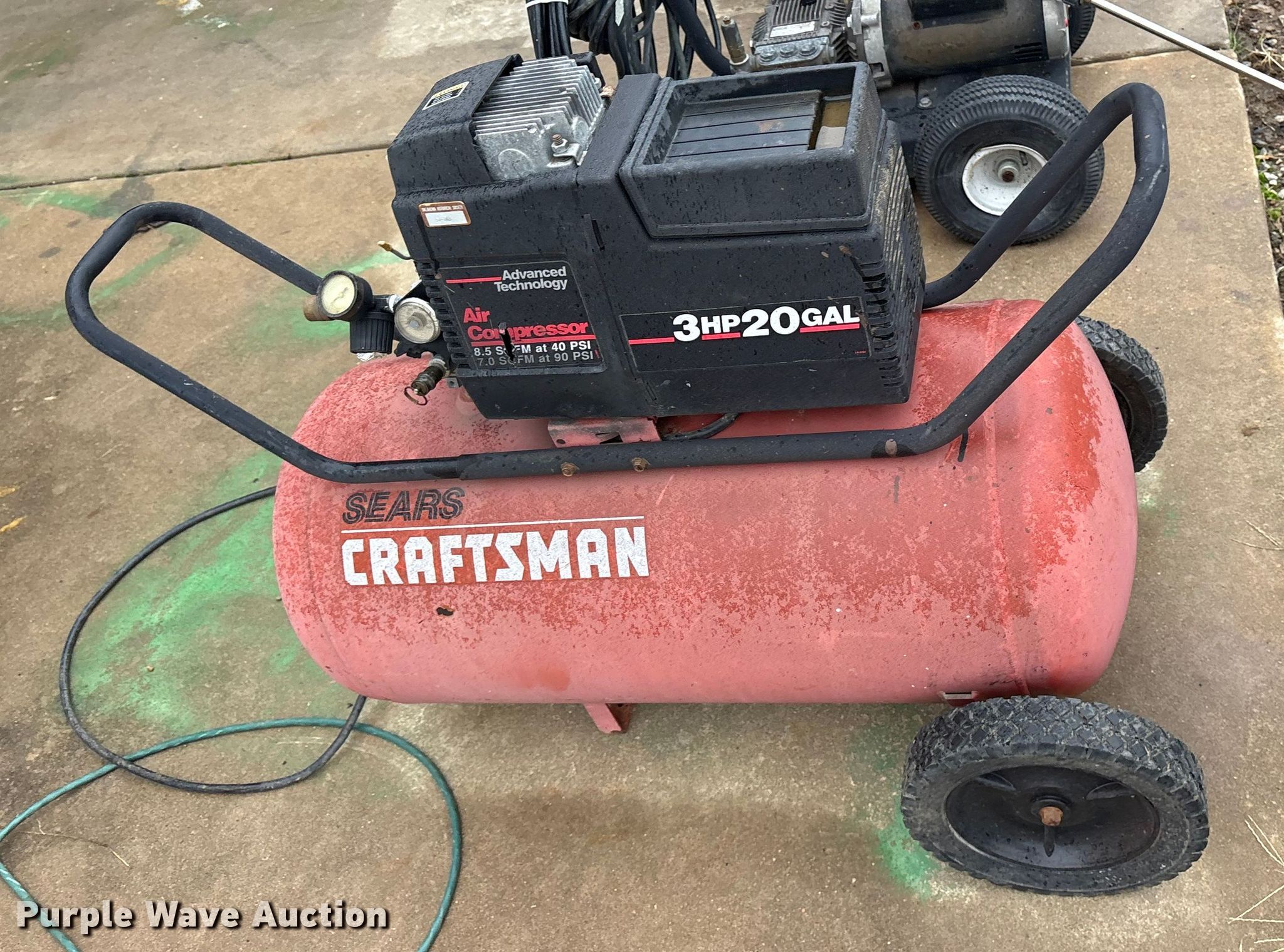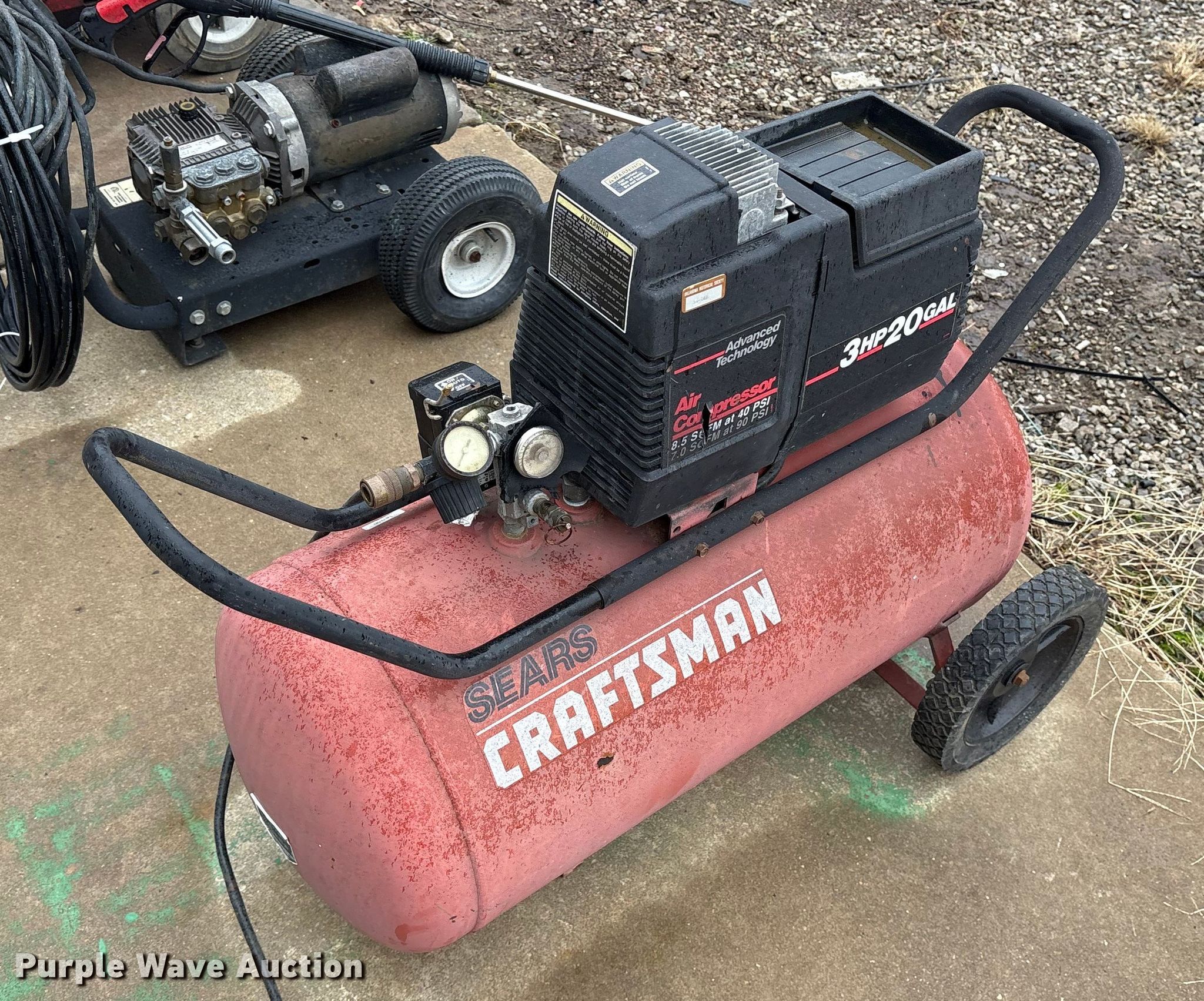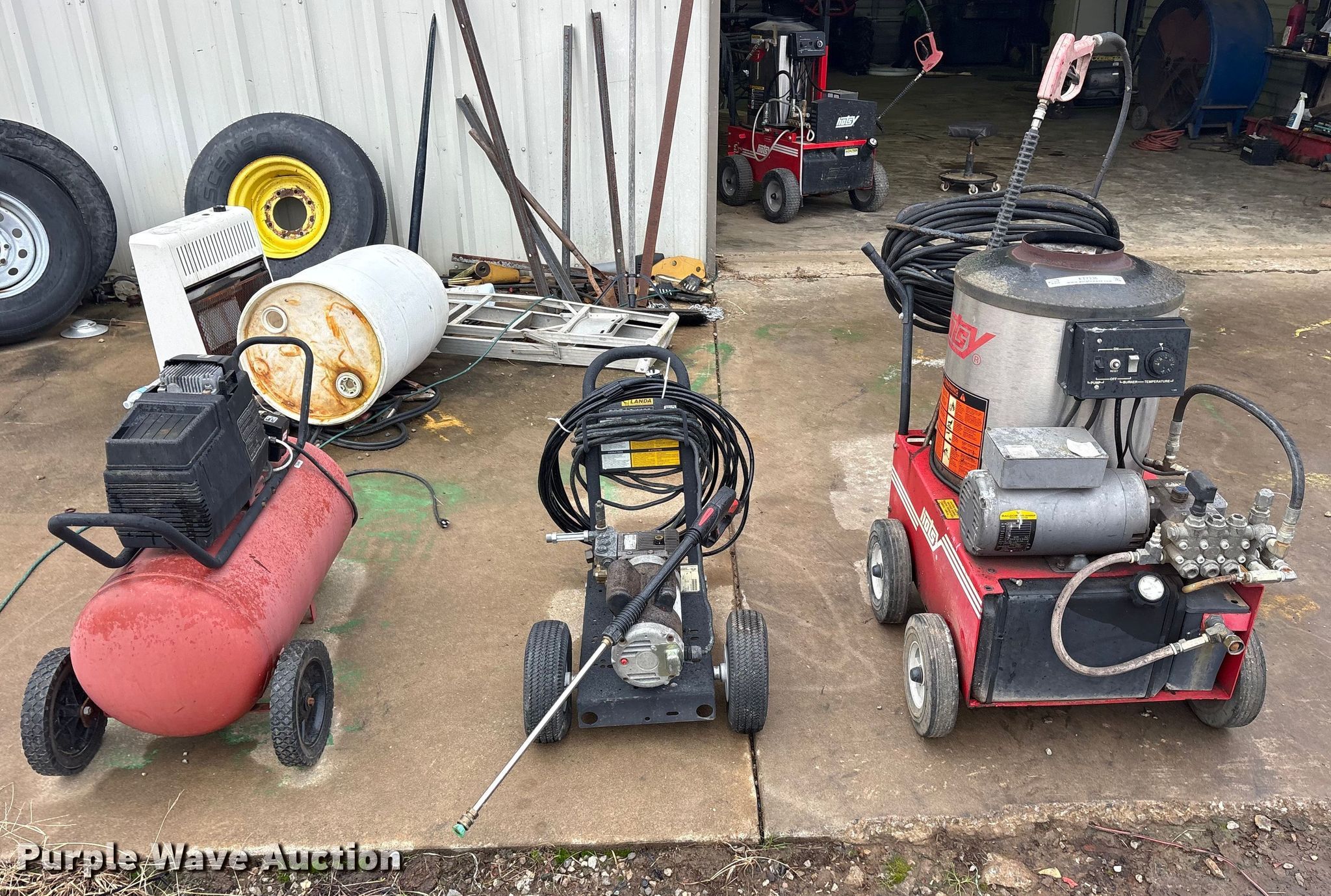 Purple Wave is selling a used Tools in Oklahoma. This item is a Shop equipment with the following: Hotsy hot pressure washer, Diesel burner, Hose issues, leaks, Landa PDE 2-1100 pressure washer, Craftsman air compressor, Capacity: 20 gallons, HP: 3