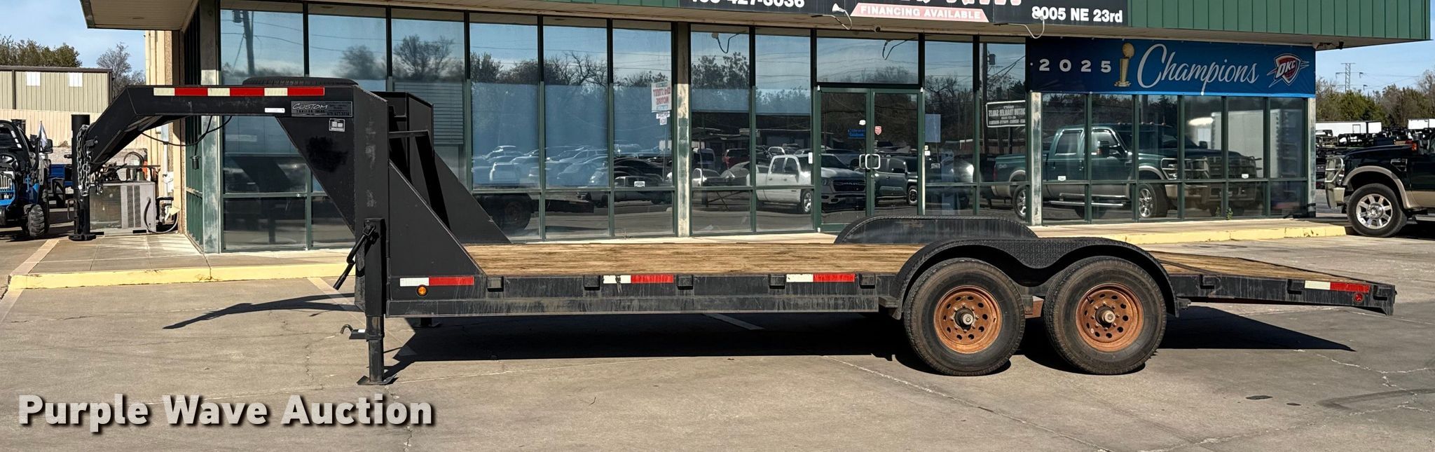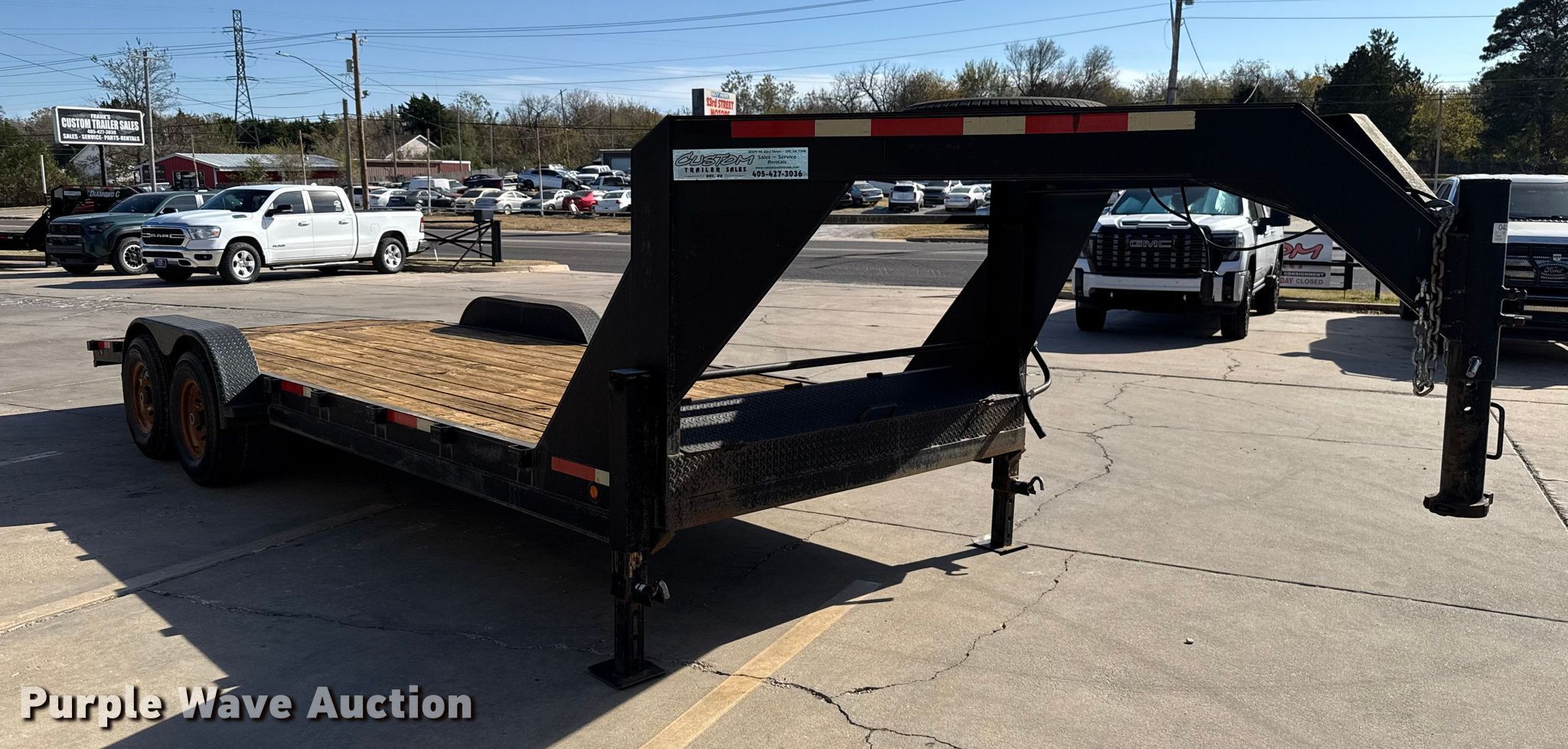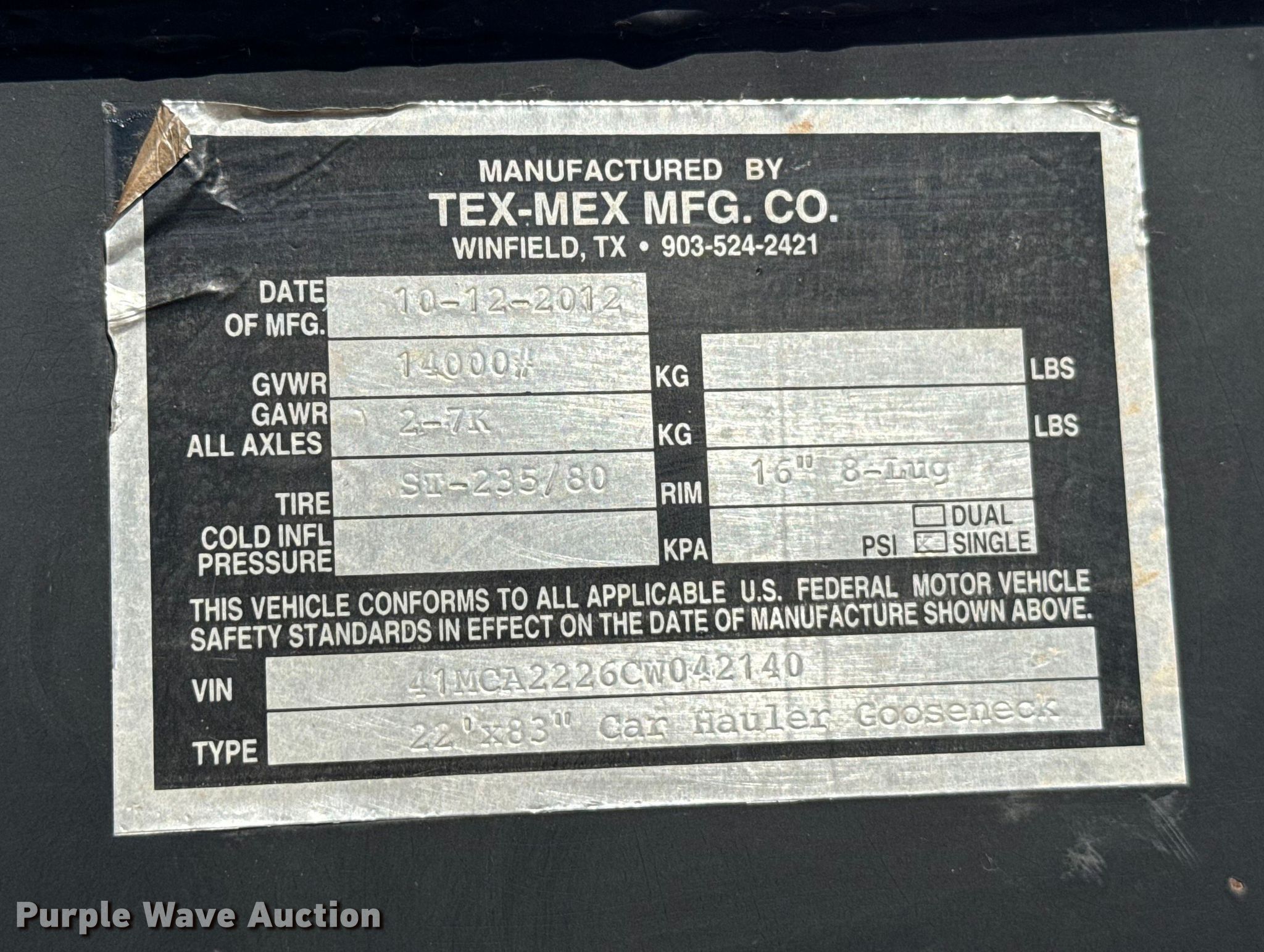 2012 Tex-Mex Mfg. Co. equipment trailer. VIN: 41MCA2226CW042140. Dimensions Overall Length: 28', Width: 101", Deck Length: 22', Width: 83", Tail length: 4', Ramps: Manual Length: 60". Features Deck type: Wood. Chassis Hitch: Gooseneck, Landing gear: Dual, Suspension: Spring, Brakes: Electric, Axles: Tandem, GVWR: 14,000 lbs, GAWR: 7,000 lbs. Tires Steel wheels, Size: ST235/80R16. Oklahoma title. Transfer of ownership documentation will be a bill of sale. Seller is an Oklahoma licensed motor vehicle dealer. Buyers may be required to provide identification to the licensed dealer to comply with state laws. Title will be assigned and distributed by the dealer. Please contact the seller for distribution questions. Custom Trailer Sales. Oklahoma City, OK 73141