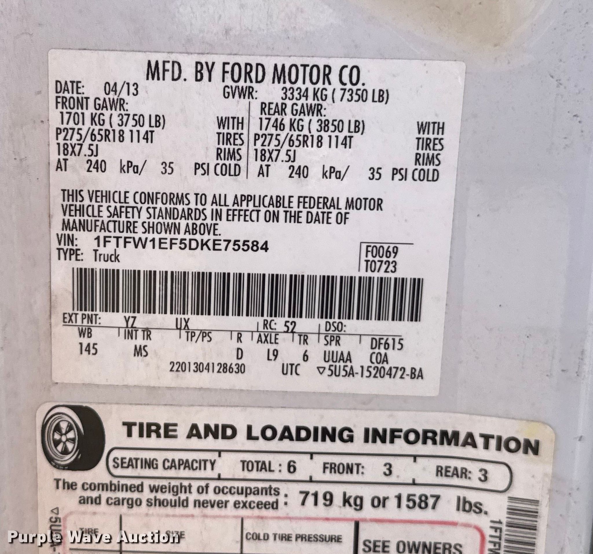 Purple Wave is selling a used 1/2 Ton Pickup or Van in Oklahoma. This item is a 2013 Ford F150 XLT SuperCrew pickup truck with the following: Miles: 339,611 on odometer, VIN: 1FTFW1EF5DKE75584