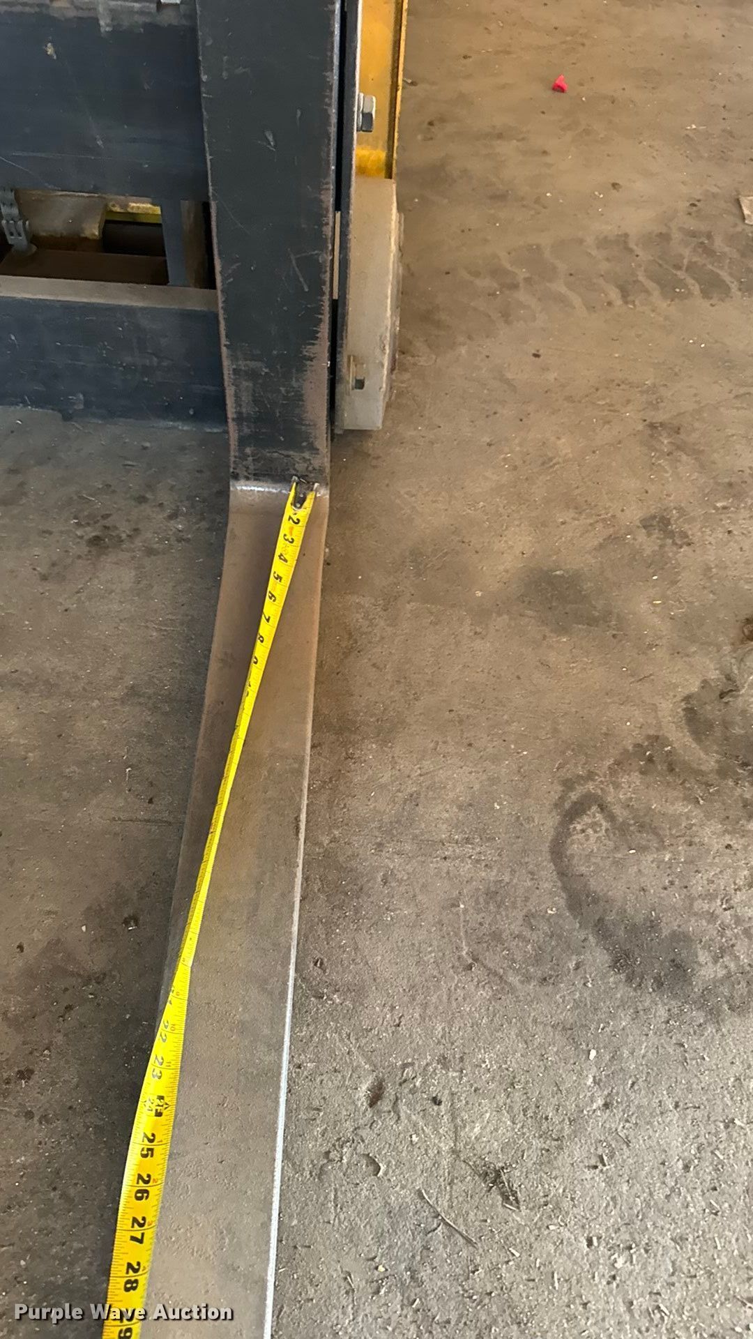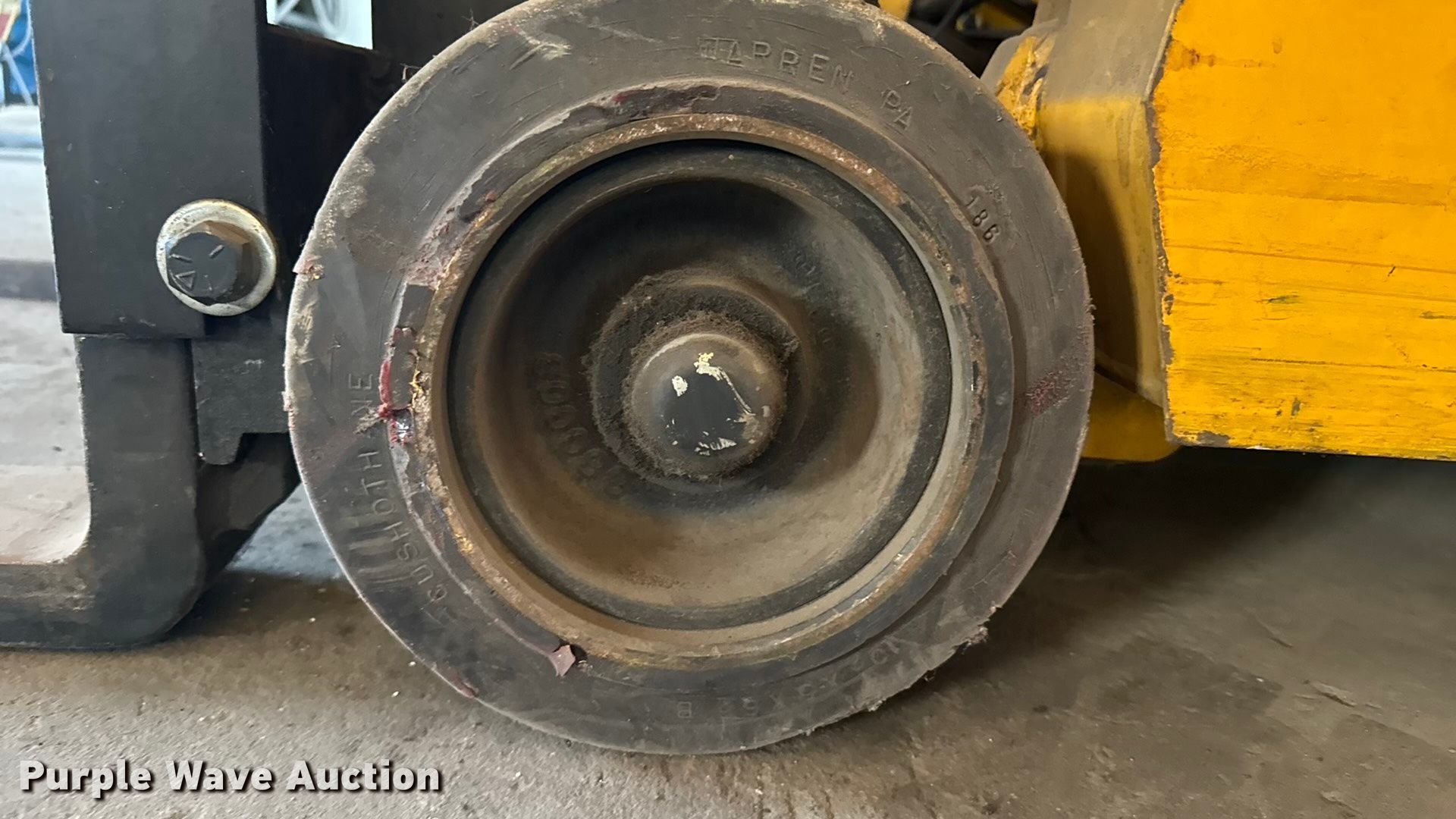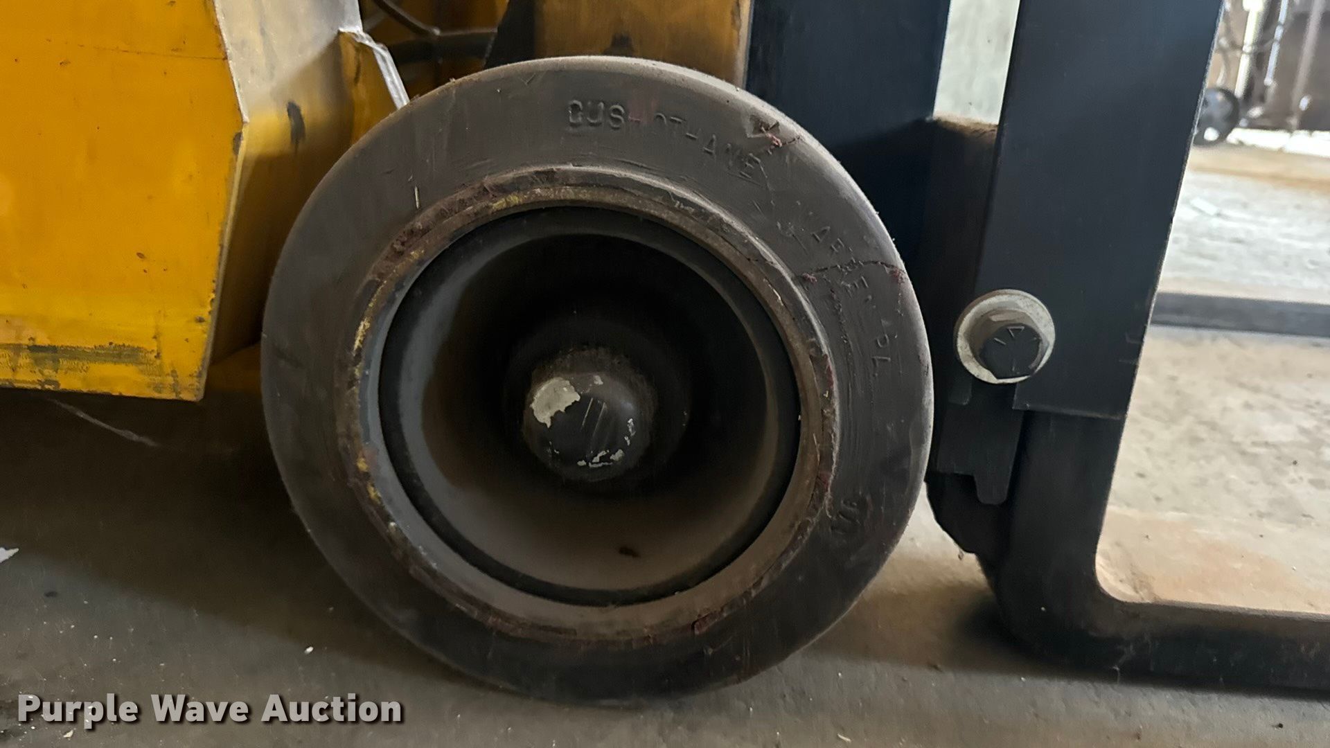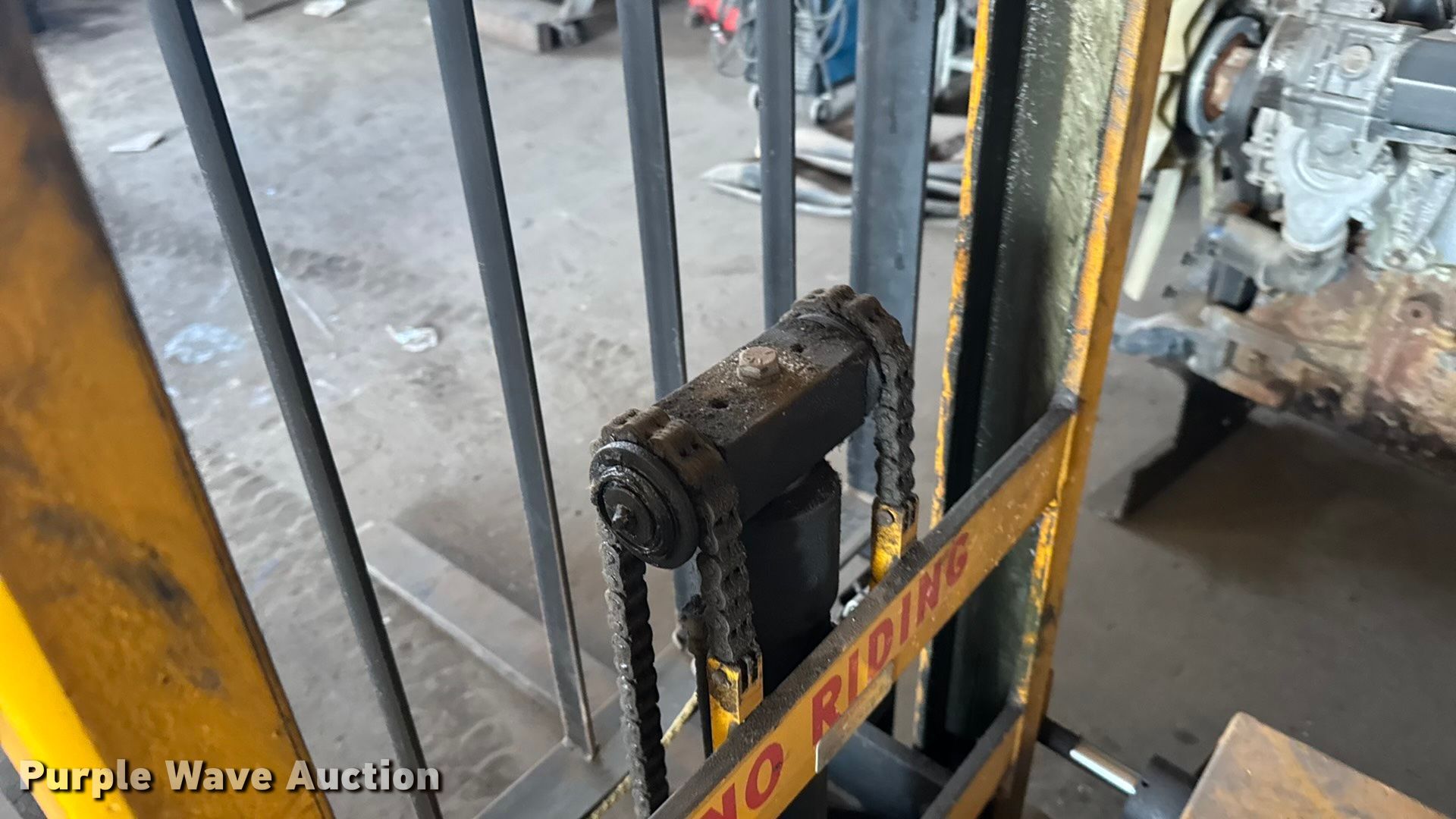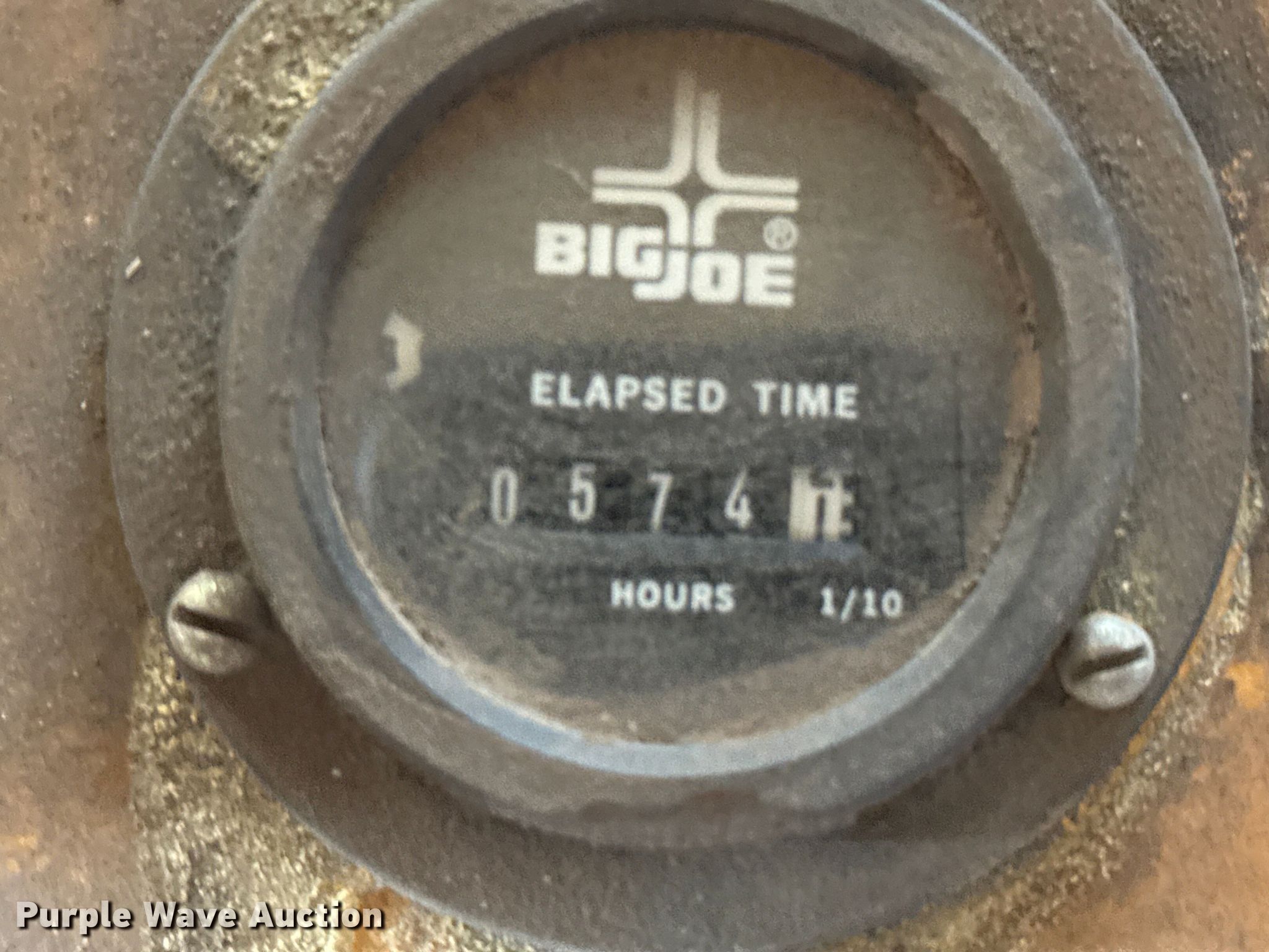 Big Joe pallet stacker. Hours: 574 on meter. Electric Motor Volts: 24. Transmission Electric drive. Features Maximum lift capacity: 3,000 lbs, Maximum lift height: 60", Collapsed mast height: 72", Mast stages: 1, Mast tilt, Fork length: 42". Tires Front: 4x10, Solid. Bourbon Trucking LLC. Jewell, KS 66949