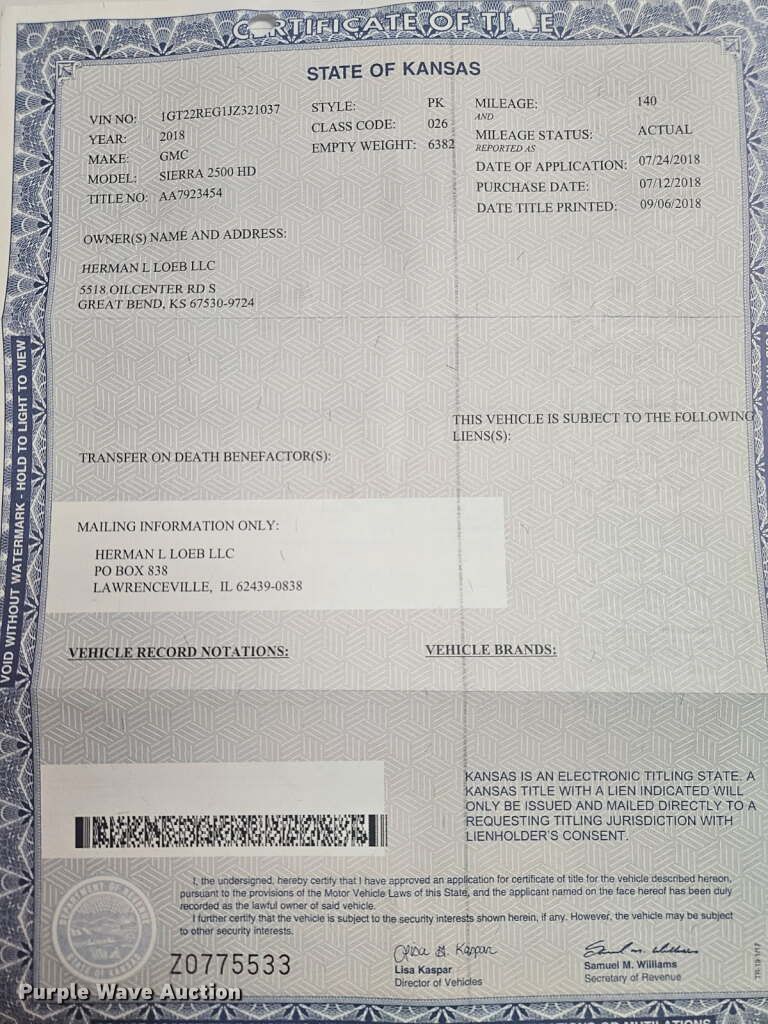 Purple Wave is selling a used 3/4 or 1 Ton Pickup or Van in Kansas. This item is a 2018 GMC Sierra 2500HD Double Cab flatbed pickup truck with the following: Miles: 215,450 on odometer, VIN: 1GT22REG1JZ321037