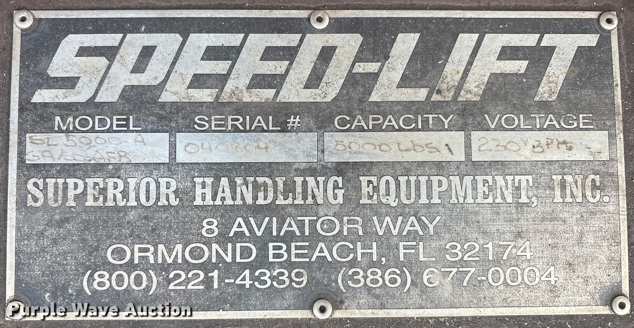 Superior Handling Equipment SL500 A loading dock lift. Serial: 040804. Electric motor Phase: Three. Features Maximum lift capacity: 5,000 lbs, Platform: 84" L x 60" W, Controls: Platform, Ramps Length: 41", Width: 60". Notes Cable for platform control needs replaced. KAT Enterprises. Tulsa, OK 74128