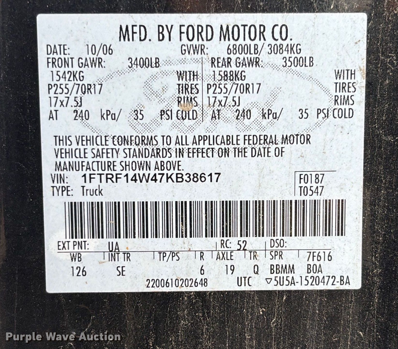 2007 Ford F150 XLT Ext. Cab pickup truck. Miles: 210,171 on odometer, VIN: 1FTRF14W47KB38617. Engine Displacement: 4.6L, Cylinders: 8, Fuel type: Gas. Transmission Automatic, Four wheel drive. Interior AC, Heat, Power windows, Power locks, Cruise control. Tires Size: 245/75R17. Notes Windshield chipped or cracked, Dead battery, Flat tire, Headlight missing, Possible driver side window issues, Engine issues , Non-operational unit, Unit must be towed or hauled. Oklahoma title. Title distribution may be delayed up to 30 days from verification of funds. Moorhead Construction Co. LLC. Vinita , OK 74301