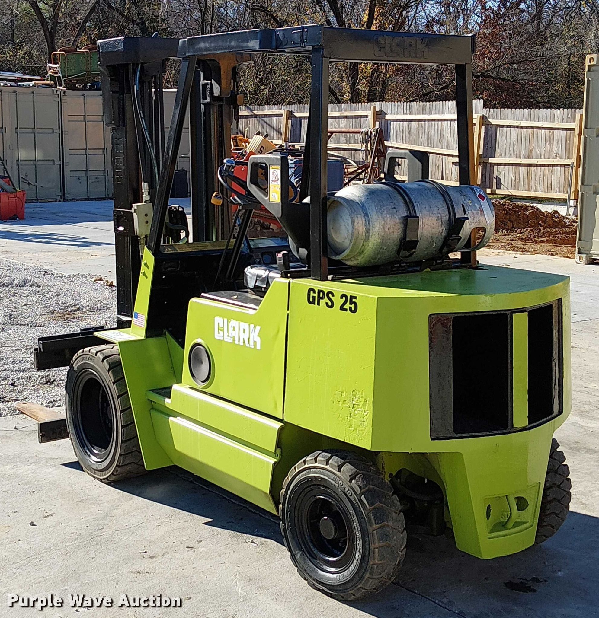 Take a look at this used Clark GPS-30MB forklift being sold on December 30th, 2025 in the Tuesday December 30 Vehicles and Equipment Auction made by Clark. Take a look at all of the item information below or take a look at similar auctions for Cushion Tire or Pneumatic Forklift.