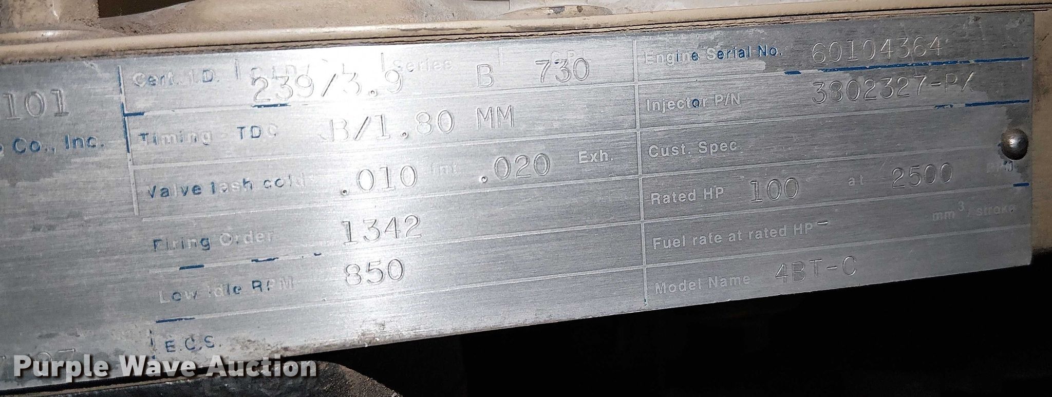 Cummins 4BT-C engine. Hours: Unknown, Serial: 60104364. Engine Displacement: 3.9L, Cylinders: 4, Fuel type: Diesel. Notes Engine issues, spun bearing , Unknown operating condition. American Equipment Sales, Inc.. Lawrence, KS 66044