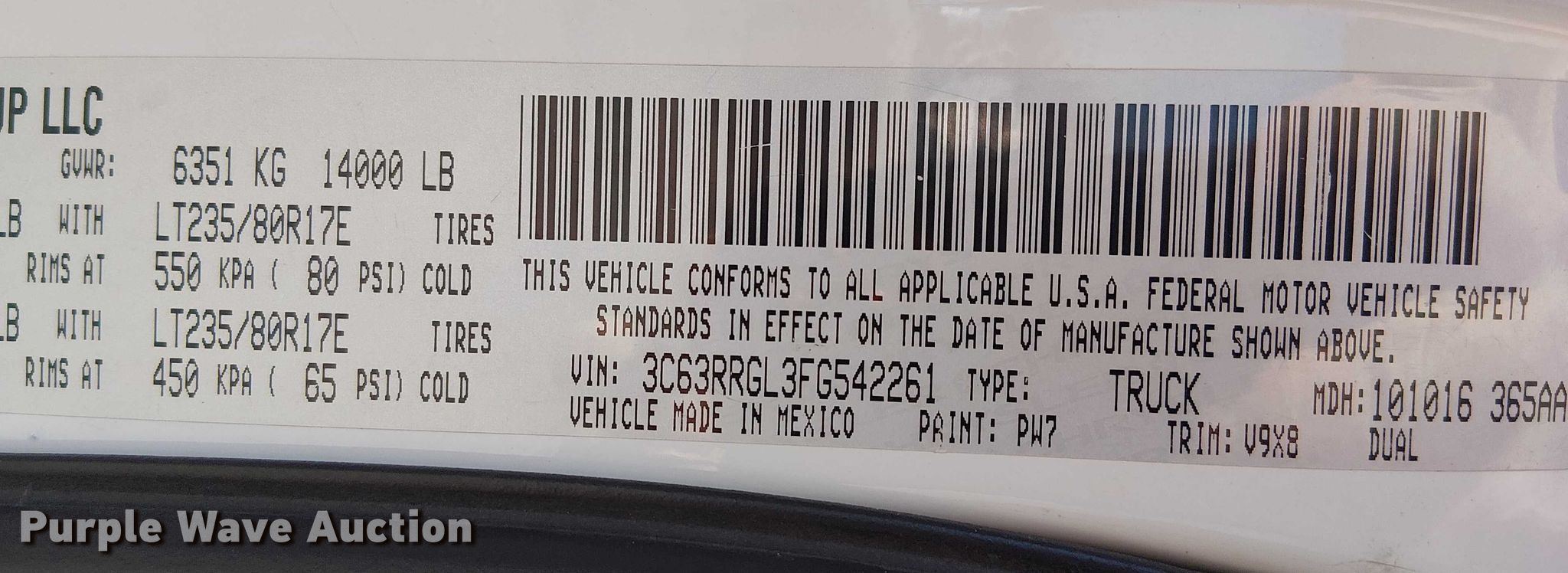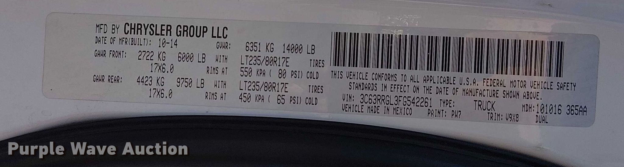 Purple Wave is selling a used 3/4 or 1 Ton Pickup or Van in Missouri. This item is a 2015 RAM 3500 Crew Cab pickup truck with the following: Miles: 232,948 on odometer, Miles or hours may vary, unit still in use, VIN: 3C63RRGL3FG542261