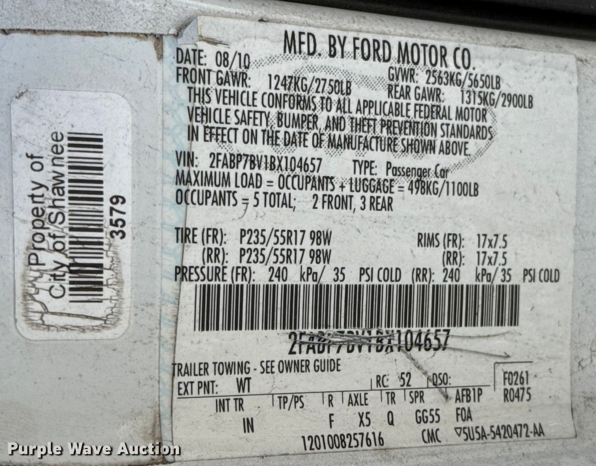 2011 Ford Crown Victoria Police Interceptor. Miles: 128,792 on odometer, VIN: 2FABP7BV1BX104657, Unit #: 3579. Engine Displacement: 4.6L, Cylinders: 8, Fuel type: Gas. Transmission Automatic. Interior AC, Heat, Heated mirrors, Power windows, Power locks, Cruise control. Tires Size: 235/55R17. Notes Jump start required during on-site data collection, Decals will be removed prior to auction, Law enforcement equipment not included. Oklahoma title. Seller is a government entity who will be assigning and distributing the title. Please contact the seller for distribution questions. Shawnee Police Department. Shawnee, OK 74804