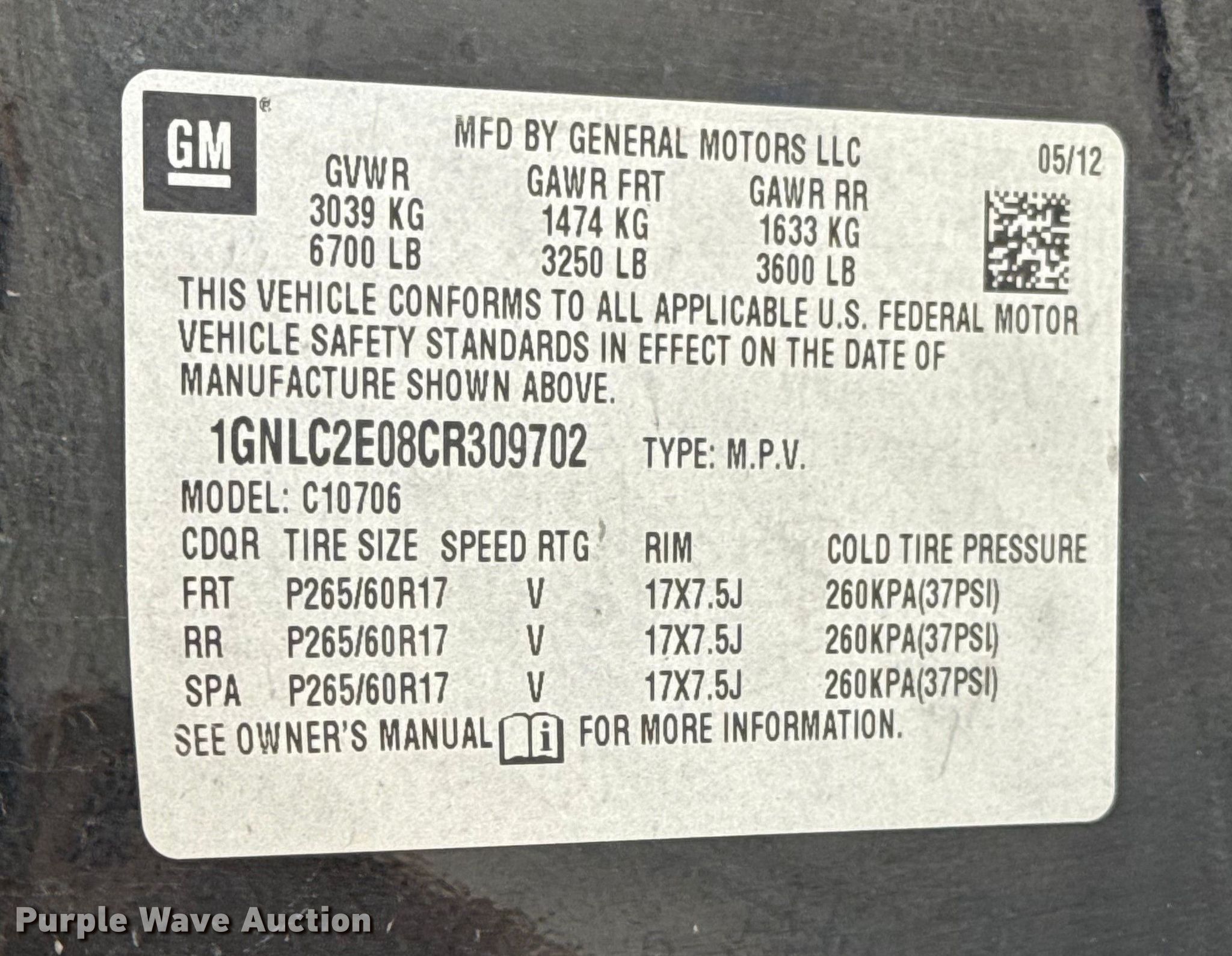 - VIN: 1GNLC2E08CR309702