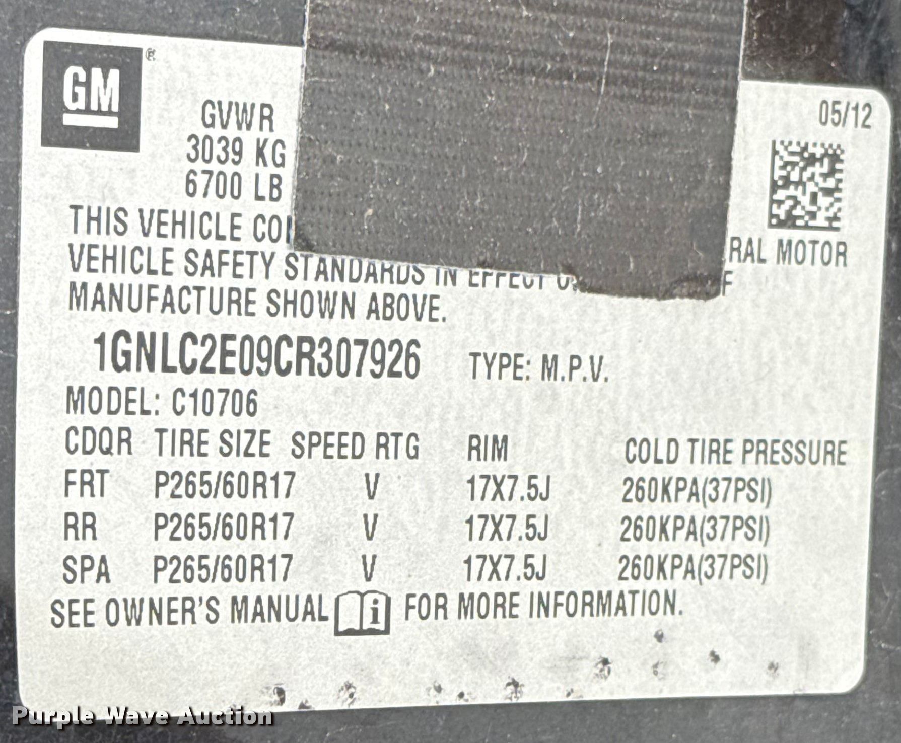 Purple Wave is selling a used Passenger Vehicle in Oklahoma. This item is a 2012 Chevrolet Tahoe SUV with the following: Miles: 170,283 on odometer, VIN: 1GNLC2E09CR307926, Unit #: 3761