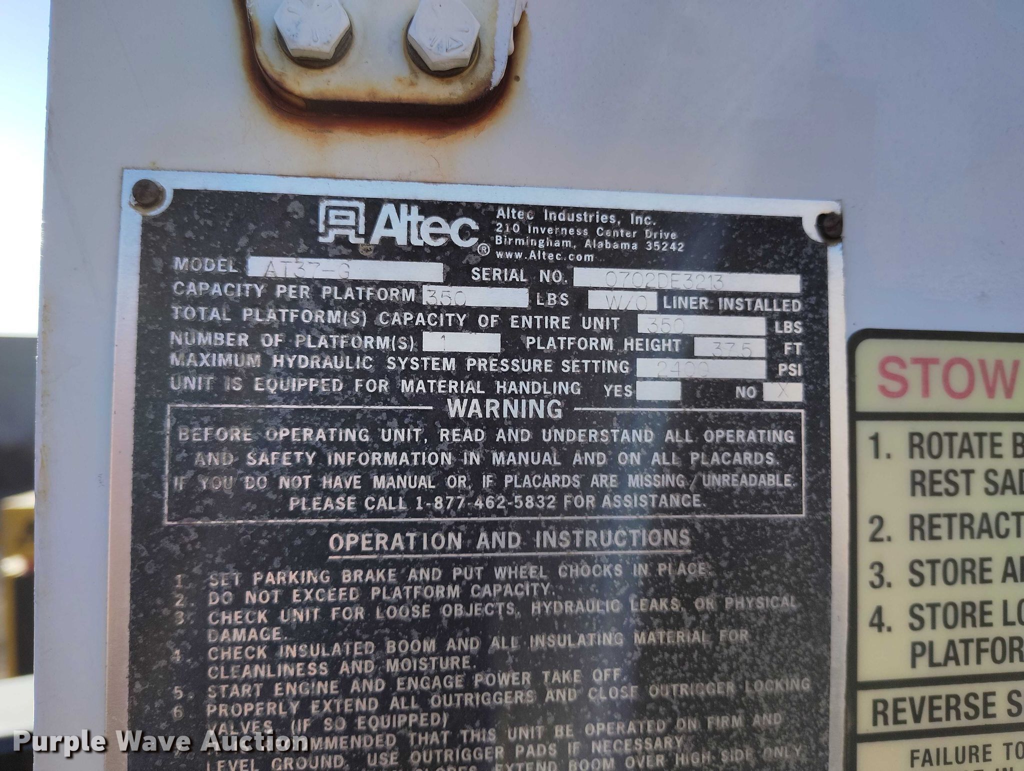 2002 Ford F550 Super Duty bucket truck. Miles: Unknown, Hours: 20,883 on meter, VIN: 1FDAF57F42ED53109. Engine Navistar, Displacement: 7.3L, Cylinders: 8, Fuel type: Diesel. Transmission Automatic. Chassis Four wheel drive, Axles: Single, Suspension: Spring, Brakes: Hydraulic, GVWR: 17,500 lbs. Interior AC, Heat. Features Bed Altec, Serial: 57-15977, Length: 11' 6", Width: 94", Boom Altec AT37-G, Serial: 0702DE3213, Maximum lift height: 37.5', Boom type: Articulating, Insulated, Telescopic, Man basket, Boom controls Ground.. Tires Size: 225/7019.5. Notes Dead battery, Unknown operating condition. Colorado title. Mileage has not been verified. Exempt will be written in the odometer disclosure on the title. Admiral Sign. Commerce City, CO 80022