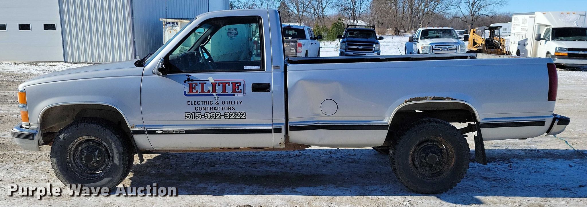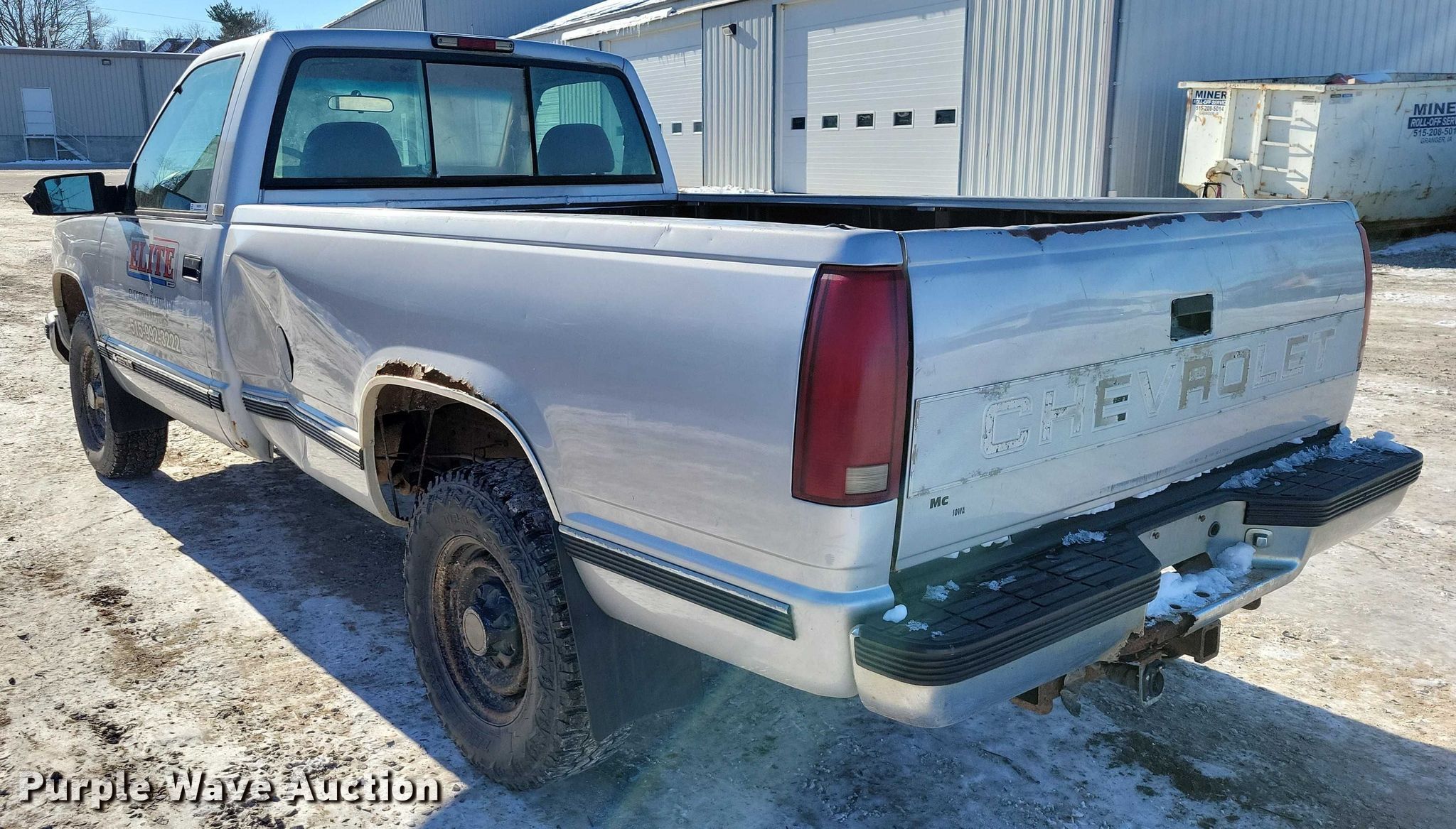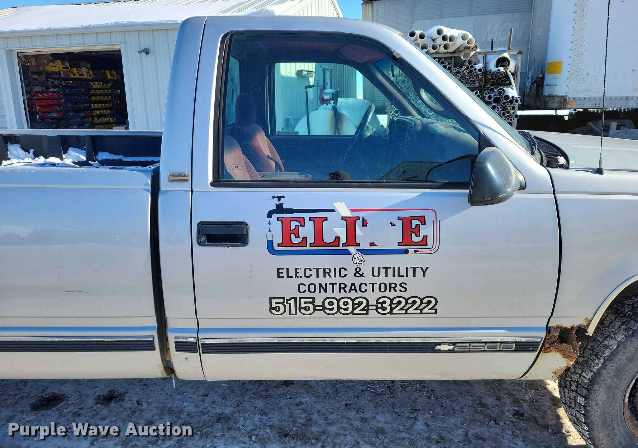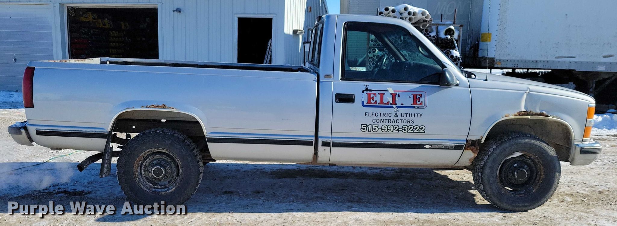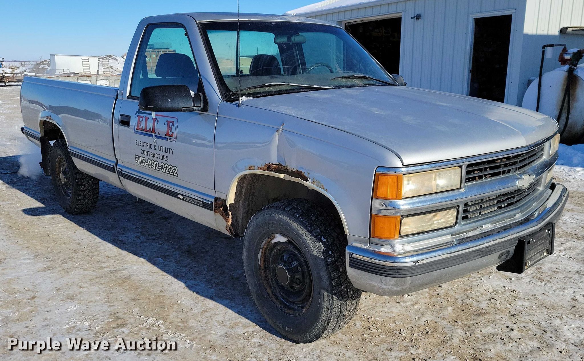 1997 Chevrolet C2500 pickup truck. Miles: 182,233 on odometer, VIN: 1GCGC24R8VE196211. Engine Displacement: 5.7L, Cylinders: 8, Fuel type: Gas. Transmission Automatic. Interior AC, Heat, Seat: Power driver, Power windows, Power locks, Cruise control, Brake controller. Tires Size: LT245/75R16. Notes Mirror cracked, Windshield chipped or cracked, Jump start required during on-site data collection. Iowa title. Title distribution may be delayed up to 14 days from verification of funds. Elite Electric and Utility Contractors. Dallas Center, IA 50063