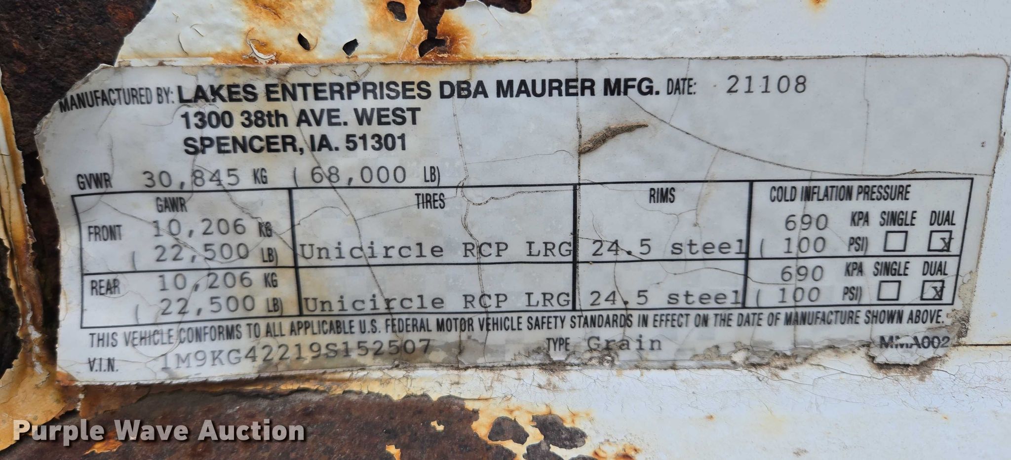 Purple Wave is selling a used Grain or Commodity Trailer in Nebraska. This item is a 2009 Maurer grain trailer with the following: VIN: 1M9KG42219S152507