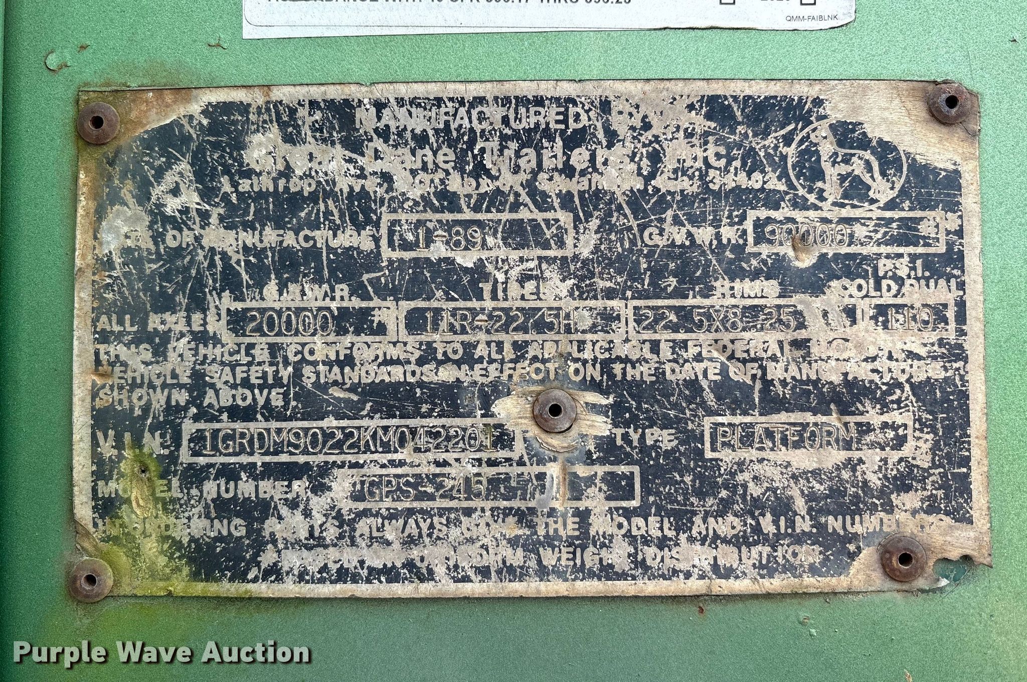 1989 Great Dane Trailers GPS-245 side curtain trailer. VIN: 1GRDM9022KM042201. Dimensions Overall Length: 45', Width: 98". Features Deck type: Wood. Chassis Landing gear: Dual, Suspension: Spring, Brakes: Air, Axles: Tandem Sliding, GVWR: 90,000 lbs. Tires Steel wheels, Size: 11R24.5. Tennessee title. Title distribution may be delayed up to 14 days from verification of funds. A&W Southern Sod Farms LLC - Open Inspection December 17th through 20th, 2025 8:00 a.m. to 4:00 p.m.. 5651 Fred Perry Road. Springfield, TN 37172