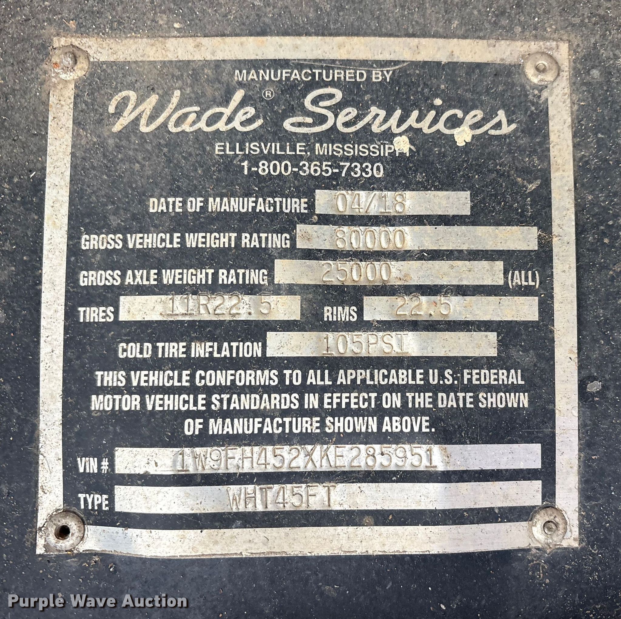2019 Wade Services WHT45FT side curtain trailer. VIN: 1W9FH452XKE285951. Dimensions Overall Length: 45', Width: 102", Body Length: 45', Width: 98". Features Deck type: Wood. Chassis Landing gear: Dual, Suspension: Air, Brakes: Air, Axles: Tandem, GVWR: 80,000 lbs. Tires Steel wheels, Size: 11R22.5. Tennessee title. Title distribution may be delayed up to 14 days from verification of funds. A&W Southern Sod Farms LLC - Open Inspection December 17th through 20th, 2025 8:00 a.m. to 4:00 p.m.. 5651 Fred Perry Road. Springfield, TN 37172