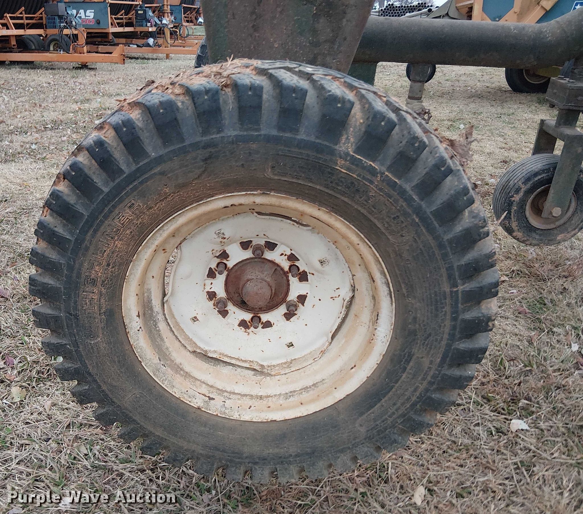 Amadas RR1375XLG irrigation hose reel. Serial: 27323. Dimensions Overall Length: 22', Width: 93". Engine Preditor, Displacement: 212 cc, Cylinders: 1, Fuel type: Gas. Features Inlet: 6", Hose: 4", PTO: 540, Approx. hose length: 850', Rear mounted water cannon, Manual stabilizers. Tires Size: 11-16. Notes Unknown operating condition of engine, PTO half shaft missing. A&W Southern Sod Farms LLC - Open Inspection December 17th through 20th, 2025 8:00 a.m. to 4:00 p.m.. 5651 Fred Perry Road. Springfield, TN 37172