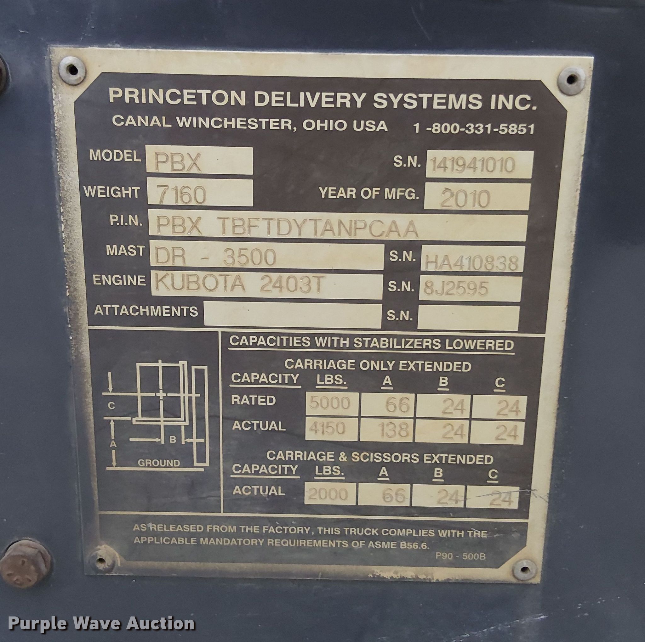 2010 Princeton PBX forklift. Hours: Unknown, Serial: 141941010. Engine Kubota 2403T, Cylinders: 4, Fuel type: Diesel. Transmission Hydrostatic. Operators station OROPS. Features Maximum lift capacity: 5,000 lbs, Maximum lift height: 138", Collapsed mast height: 112", Mast stages: 2, Side shift, Mast tilt, Reach / retract, Fork length: 48". Tires Size: 31x15.50-15. Notes Non-operational hour meter. A&W Southern Sod Farms LLC - Open Inspection December 17th through 20th, 2025 8:00 a.m. to 4:00 p.m.. 5651 Fred Perry Road. Springfield, TN 37172