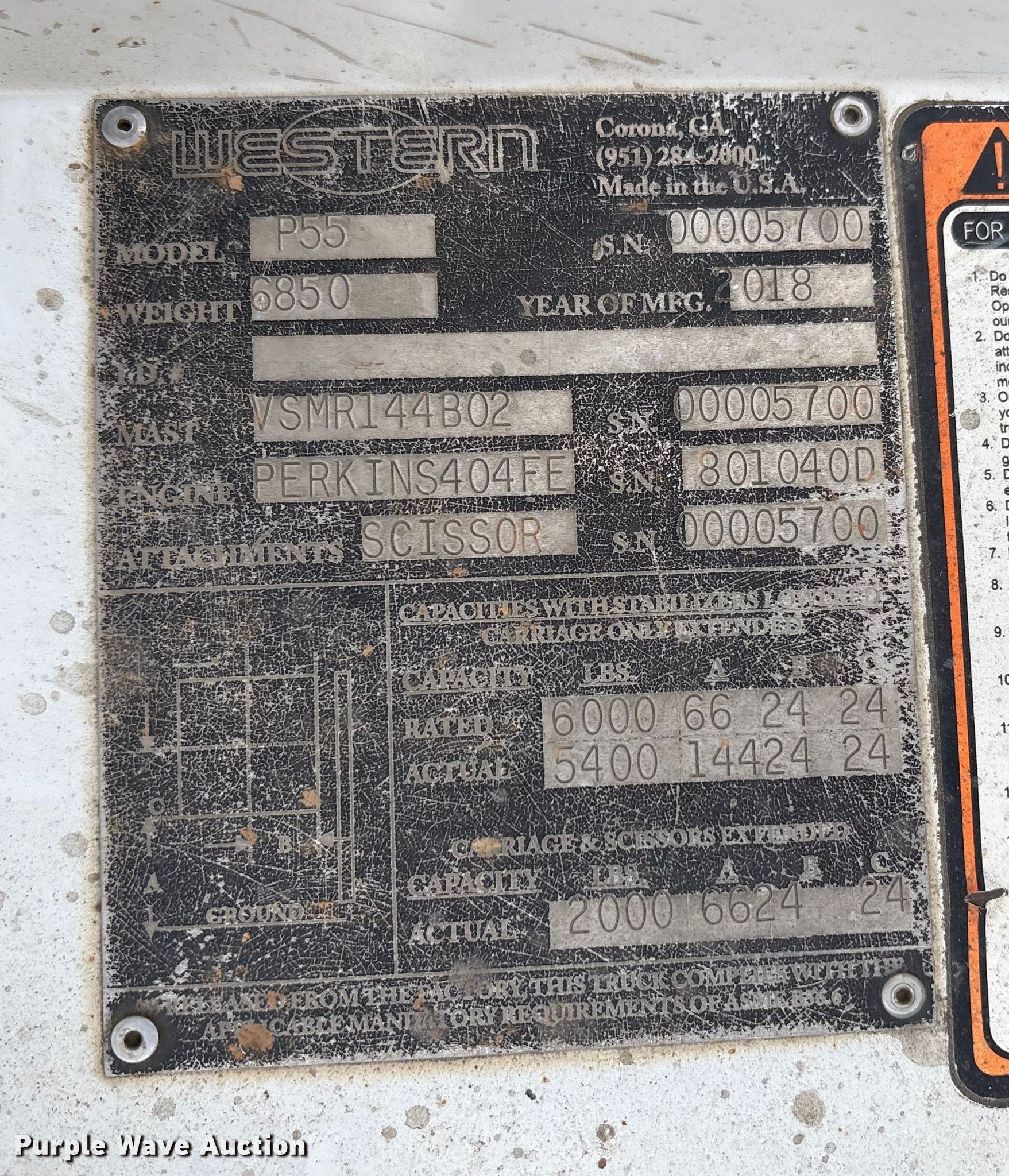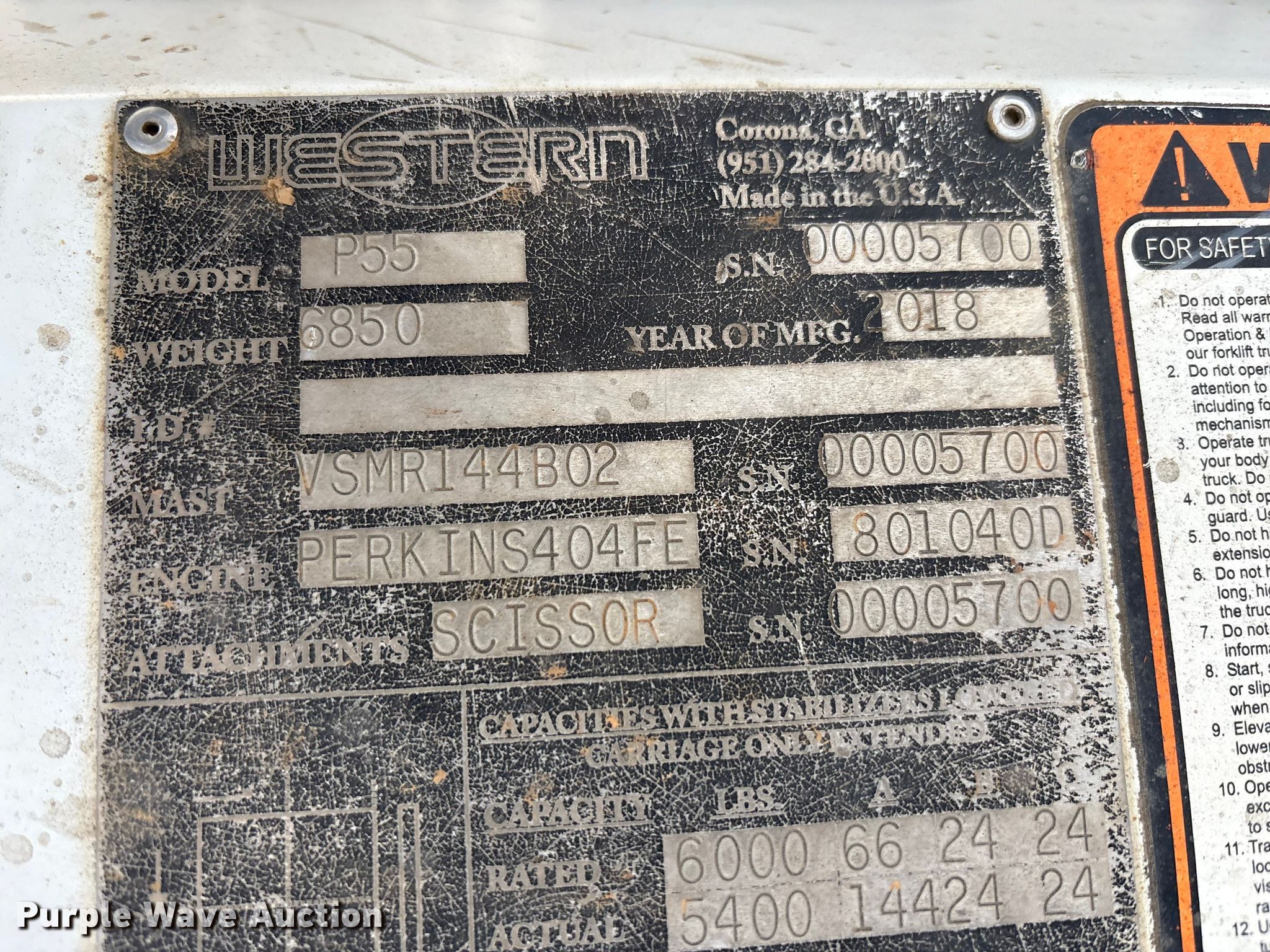 Purple Wave is selling a used Truck Mounted Forklift in Tennessee. This item is a 2018 Western P55 forklift with the following: Hours: 1,047 on meter, Serial: 00005700
