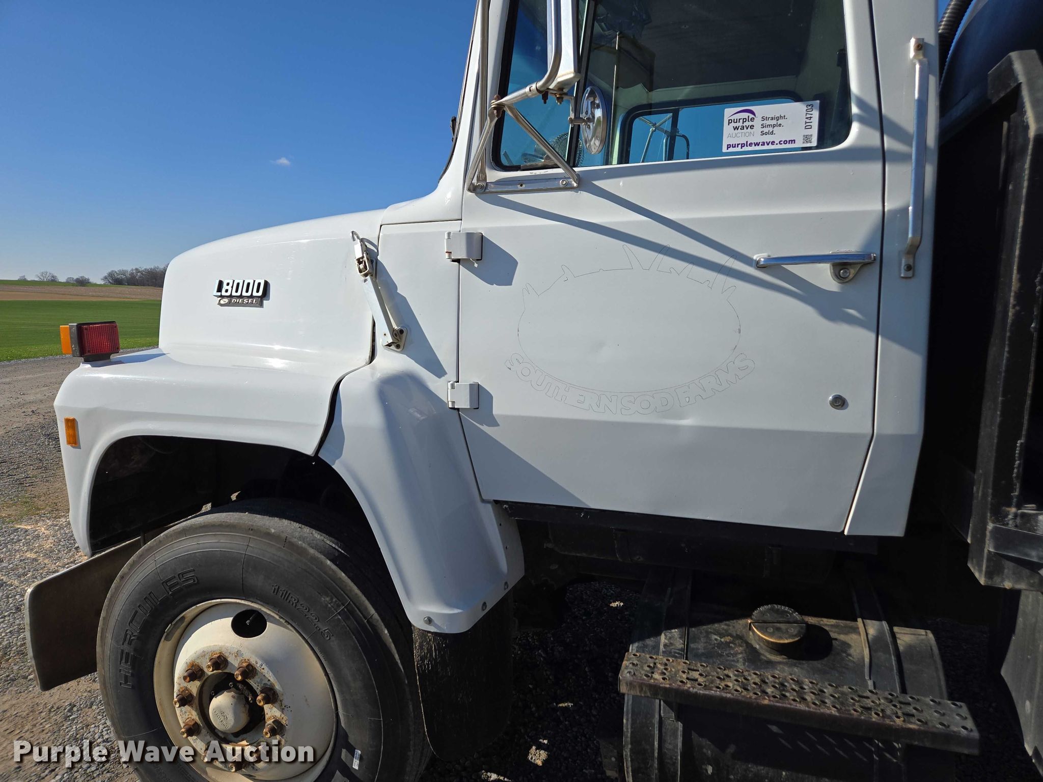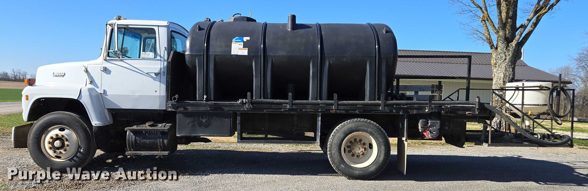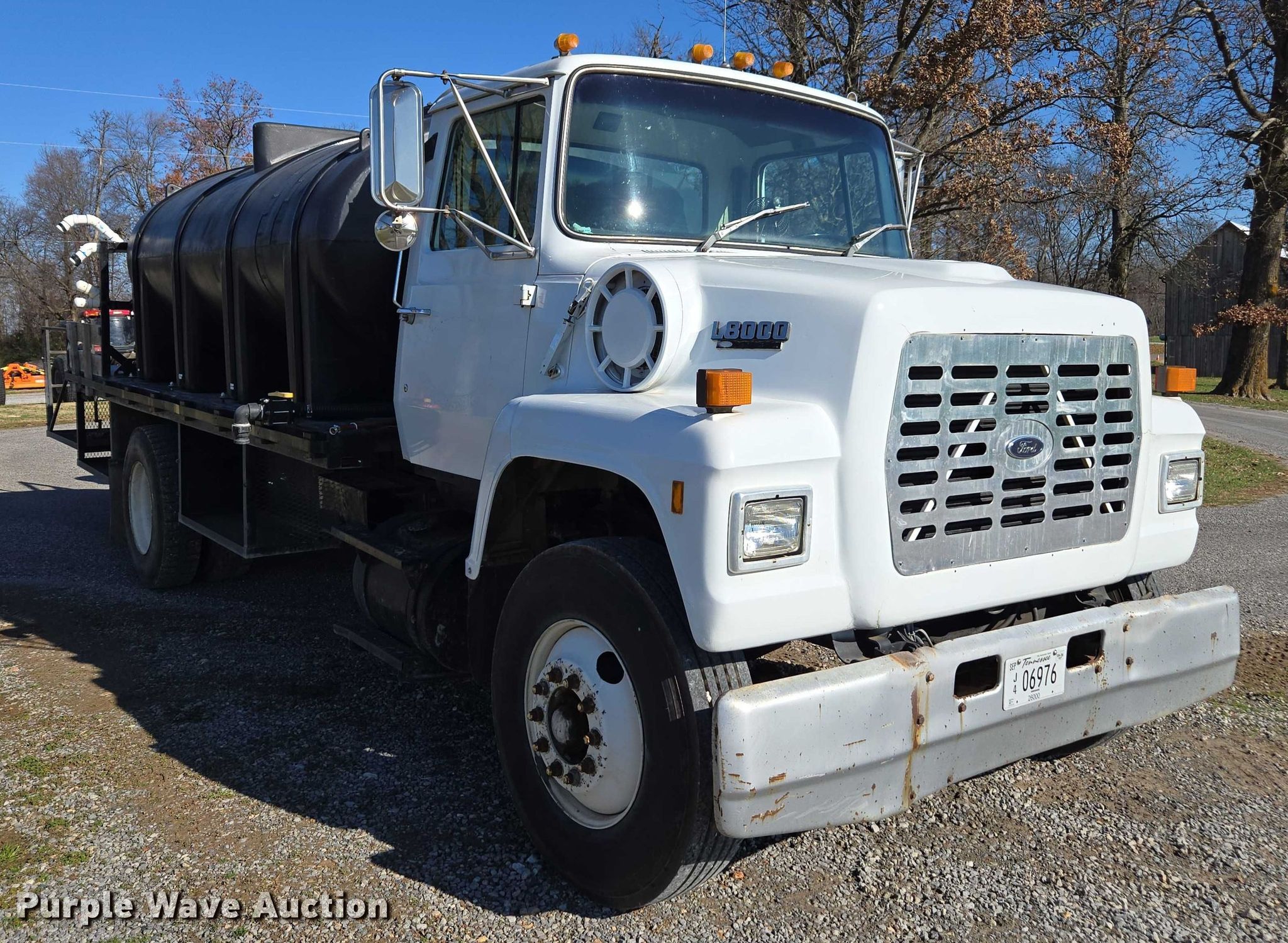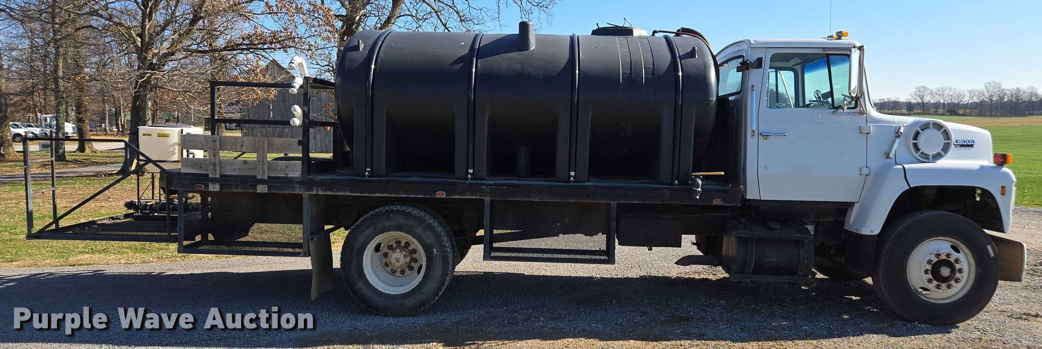 1990 Ford LN8000 water truck. Miles: 390,285 on odometer, VIN: 1FDXR82A9LVA12191. Engine Displacement: 7.8L, Cylinders: 6, Fuel type: Diesel, HP: 185. Transmission Manual, Speed: 10. Chassis Suspension: Spring, Brakes: Air, GVWR: 32,200 lbs. Interior Heat. Features Bed Flatbed, Length: 18', Width: 98", Capacity: 3,200 gallons, Top fill, Rear deck Width: 4', Briggs & Stratton gas engine Displacement: 208 cc, Chemical inductor Fill hose: 2.5". Tires Size: 11R22.5. Tennessee title. Title distribution may be delayed up to 14 days from verification of funds. A&W Southern Sod Farms LLC - Open Inspection December 17th through 20th, 2025 8:00 a.m. to 4:00 p.m.. 5651 Fred Perry Road. Springfield, TN 37172