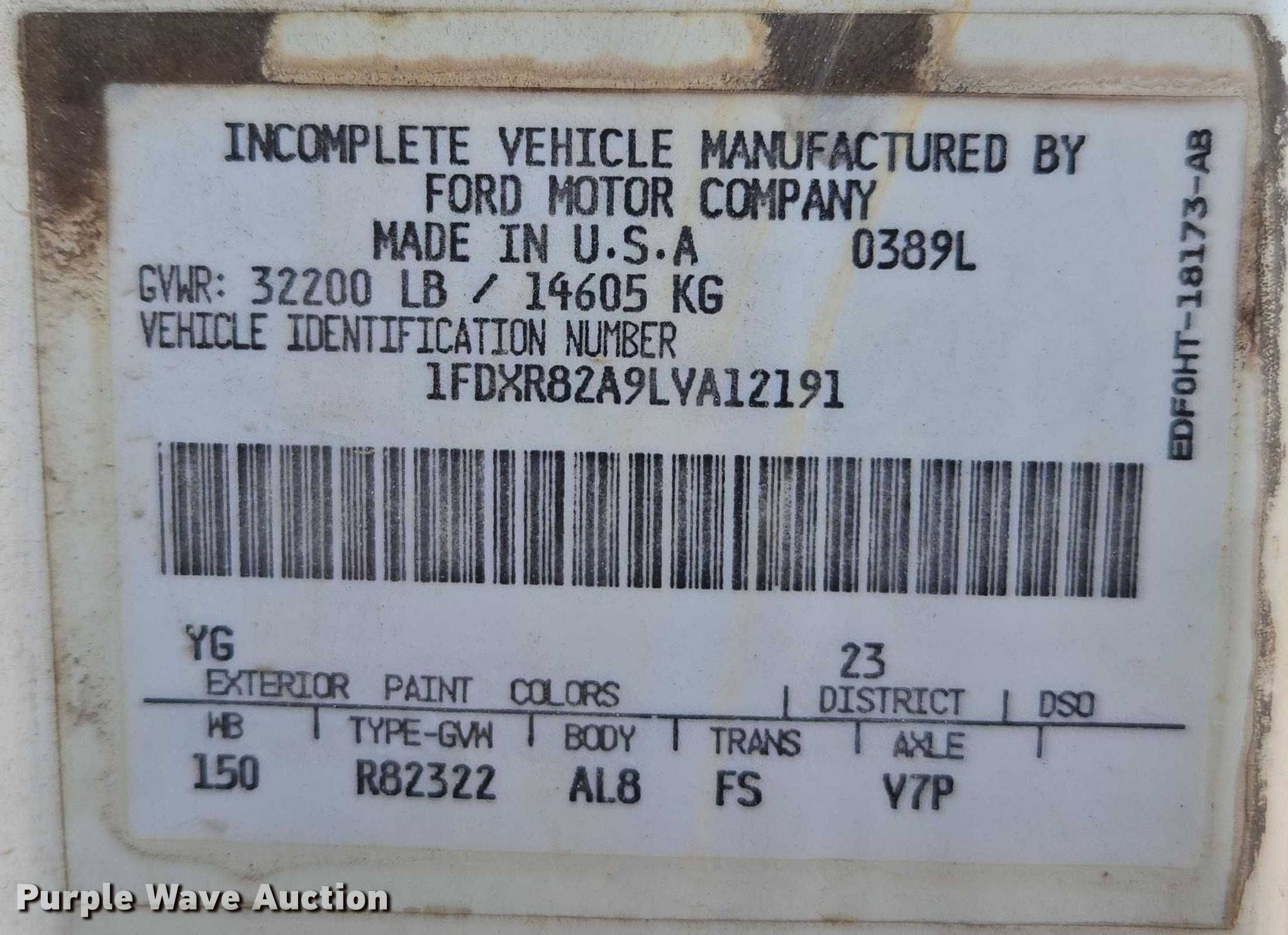 - VIN: 1FDXR82A9LVA12191
