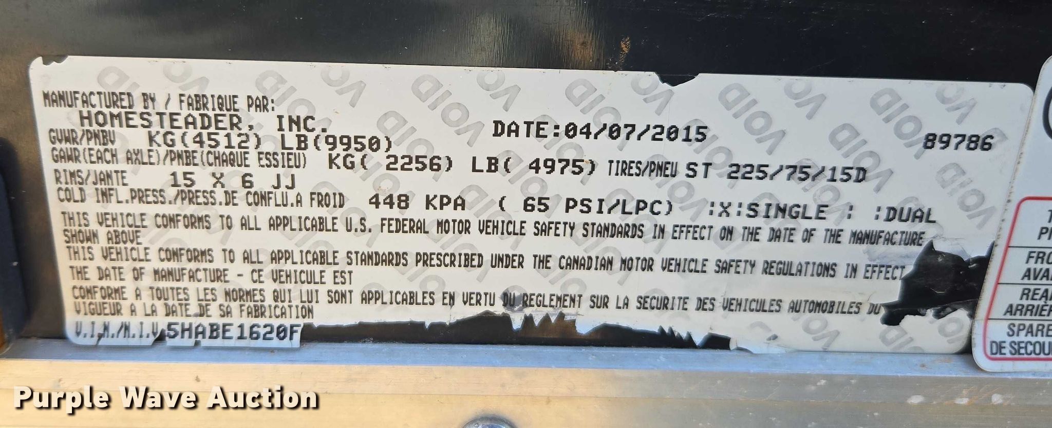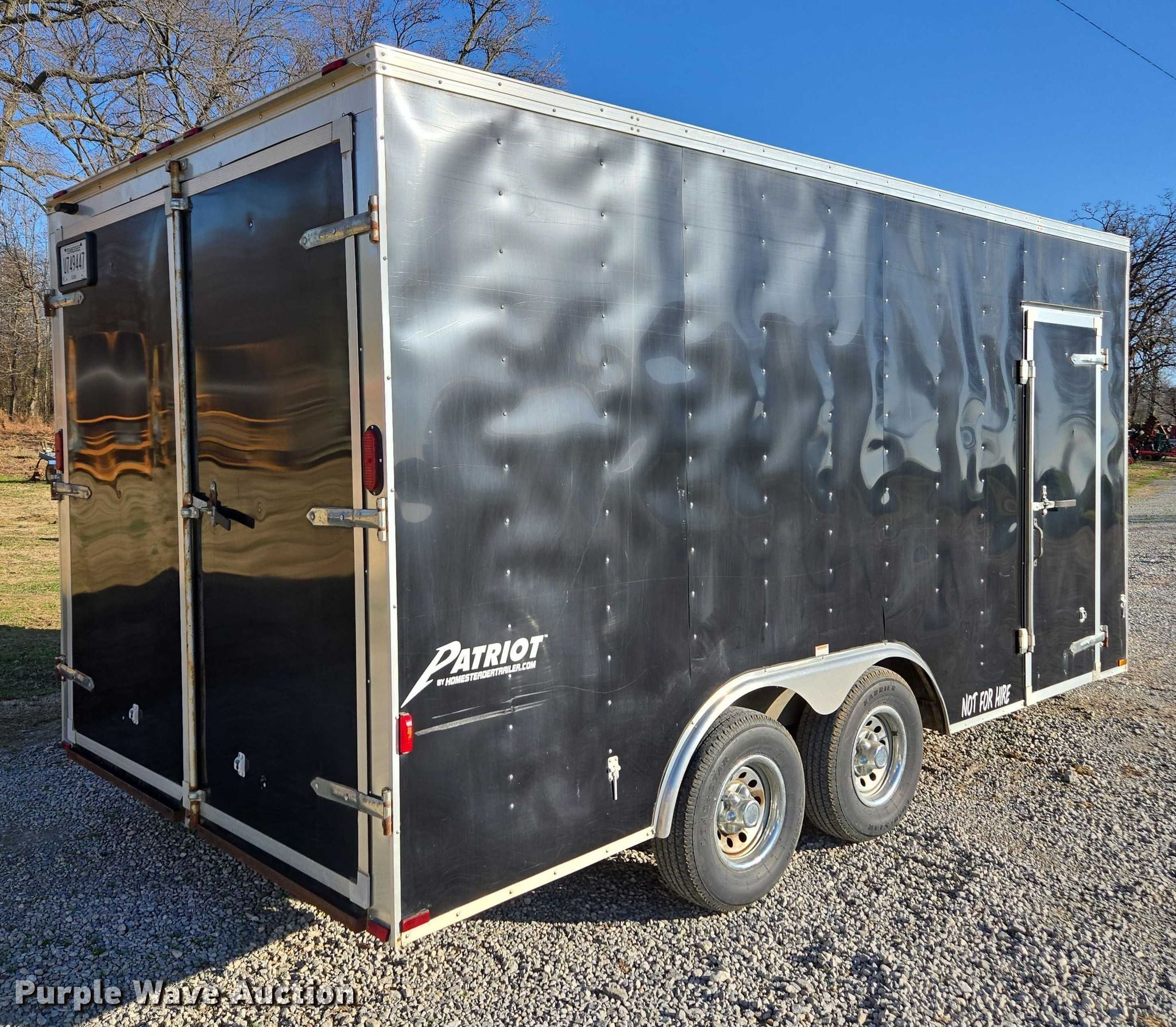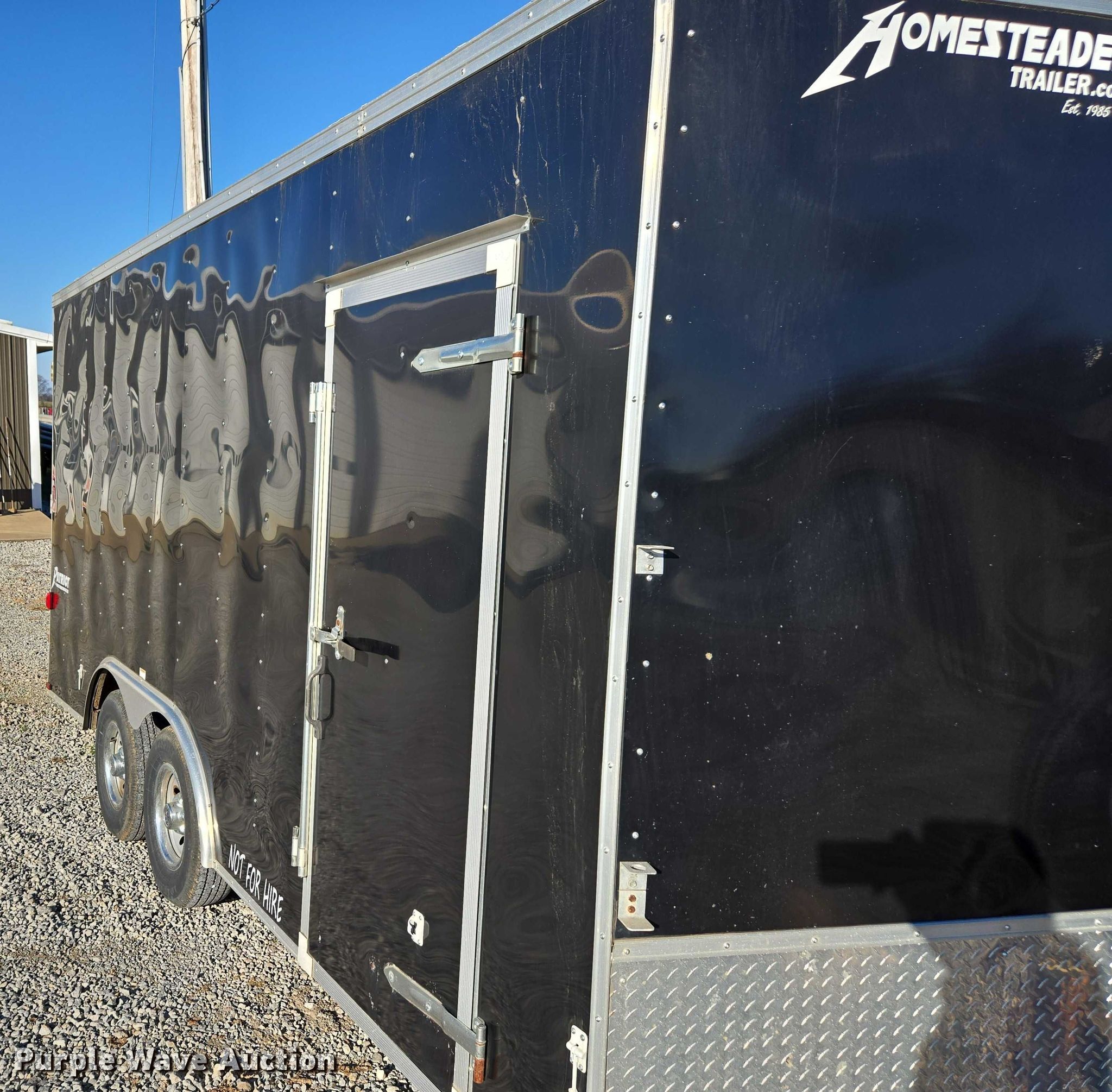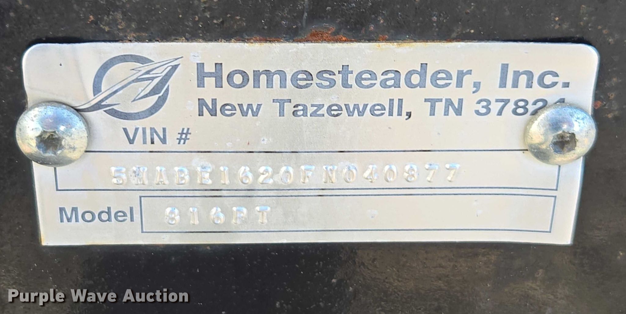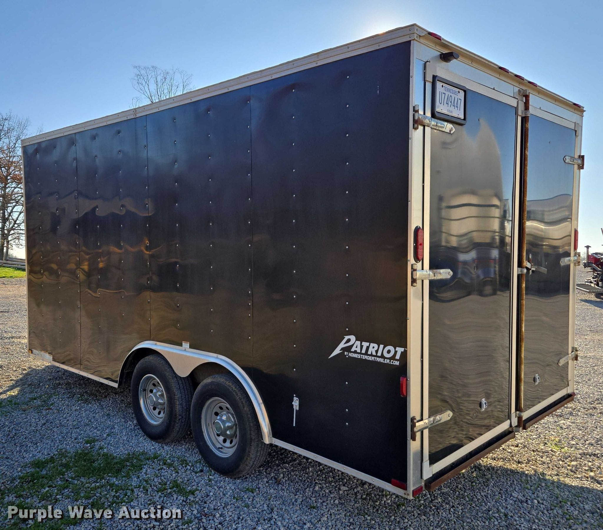 2015 Homesteader 816PT enclosed cargo trailer. VIN: 5HABE1620FN040877. Dimensions Overall Length: 20', Width: 102", Body Length: 16', Width: 100", Rear door / ramp Width: 87". Features Deck type: Wood. Chassis Ball hitch: 2 5/16", Landing gear: Single, Suspension: Spring, Brakes: Electric, Axles: Tandem, GVWR: 9,950 lbs., GAWR: 4,975 lbs.. Tires Steel wheels, Size: 225/75R15. Tennessee title. Title distribution may be delayed up to 14 days from verification of funds. A&W Southern Sod Farms LLC - Open Inspection December 17th through 20th, 2025 8:00 a.m. to 4:00 p.m.. 5651 Fred Perry Road. Springfield, TN 37172