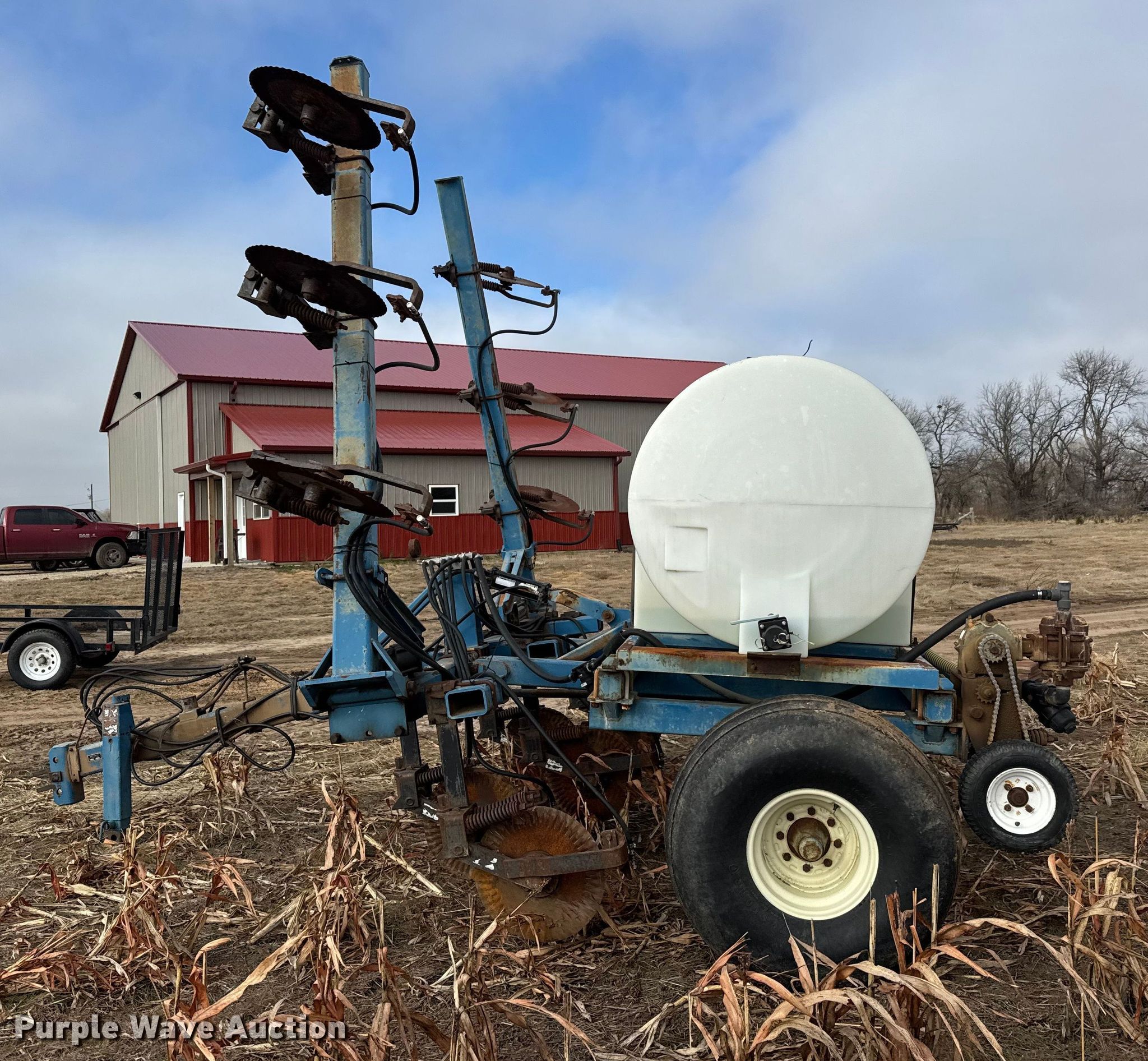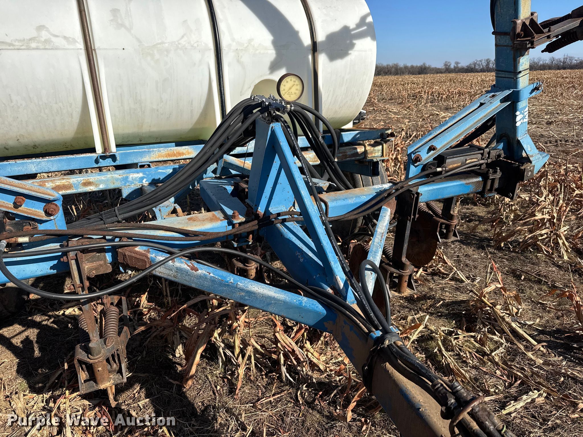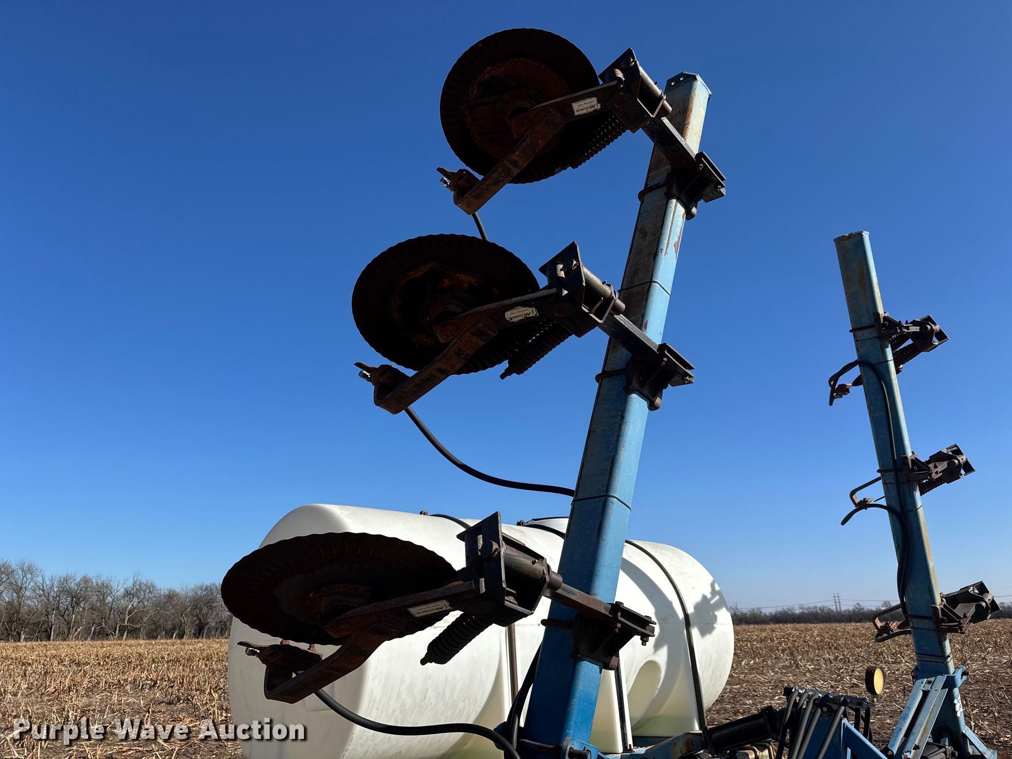Purple Wave is selling a used Applicator Pull Type in Kansas. This item is a Ag Systems 6000 liquid fertilizer applicator with the following: Liquid/nh3 applicator, Width: Approx. 28', Rows: 11, Spacing: 30", Delivery type: Direct injection, Tank capacity: 750 gallons, Pump, CDS-John Blue LM4455, Type: Ground drive,