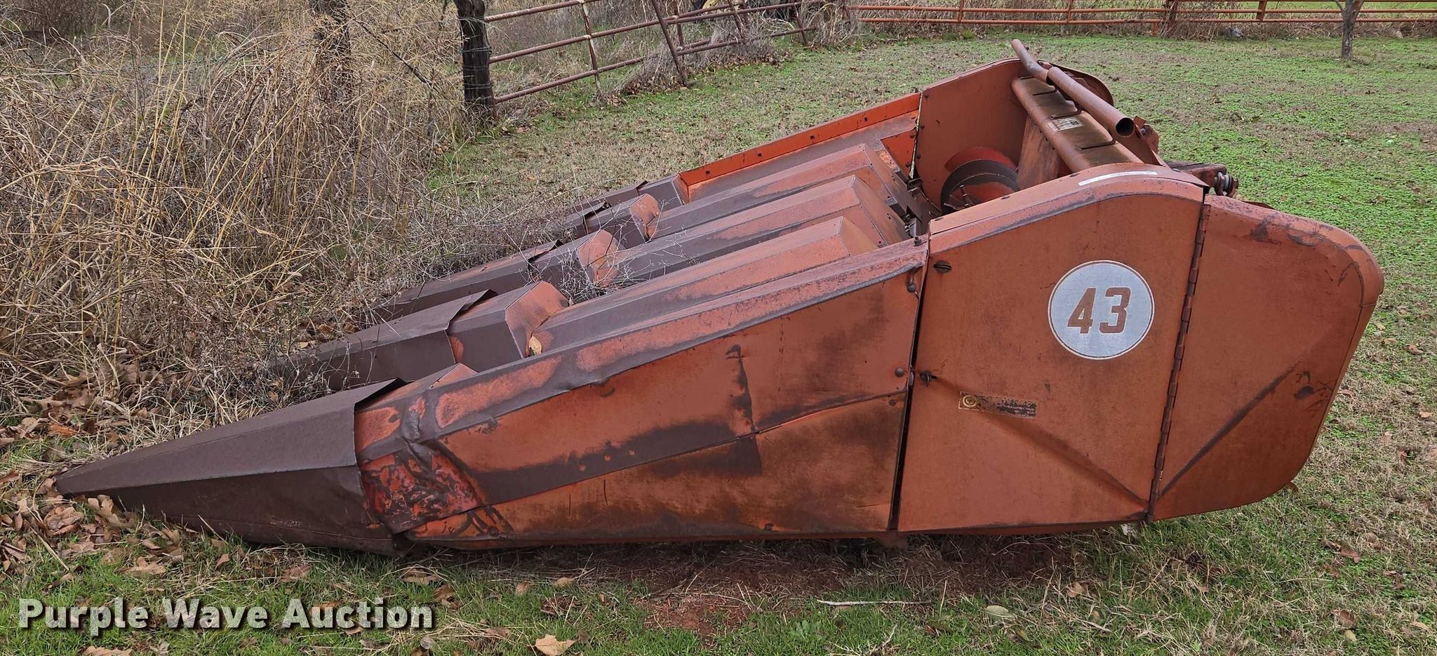 Purple Wave is selling a used Corn or Row Head in Oklahoma. This item is a Massey Ferguson MF43 corn head with the following: Serial: 1438031679