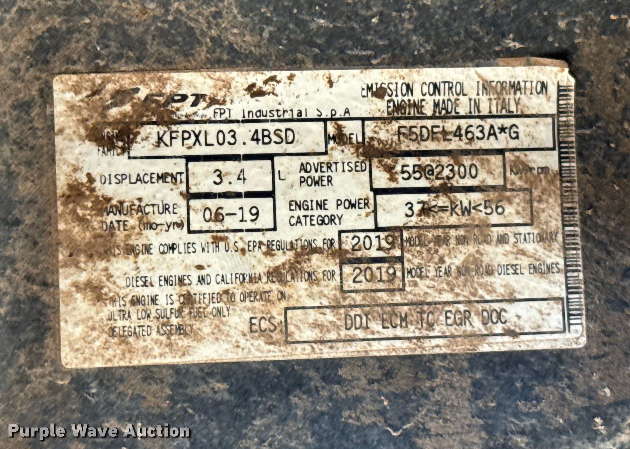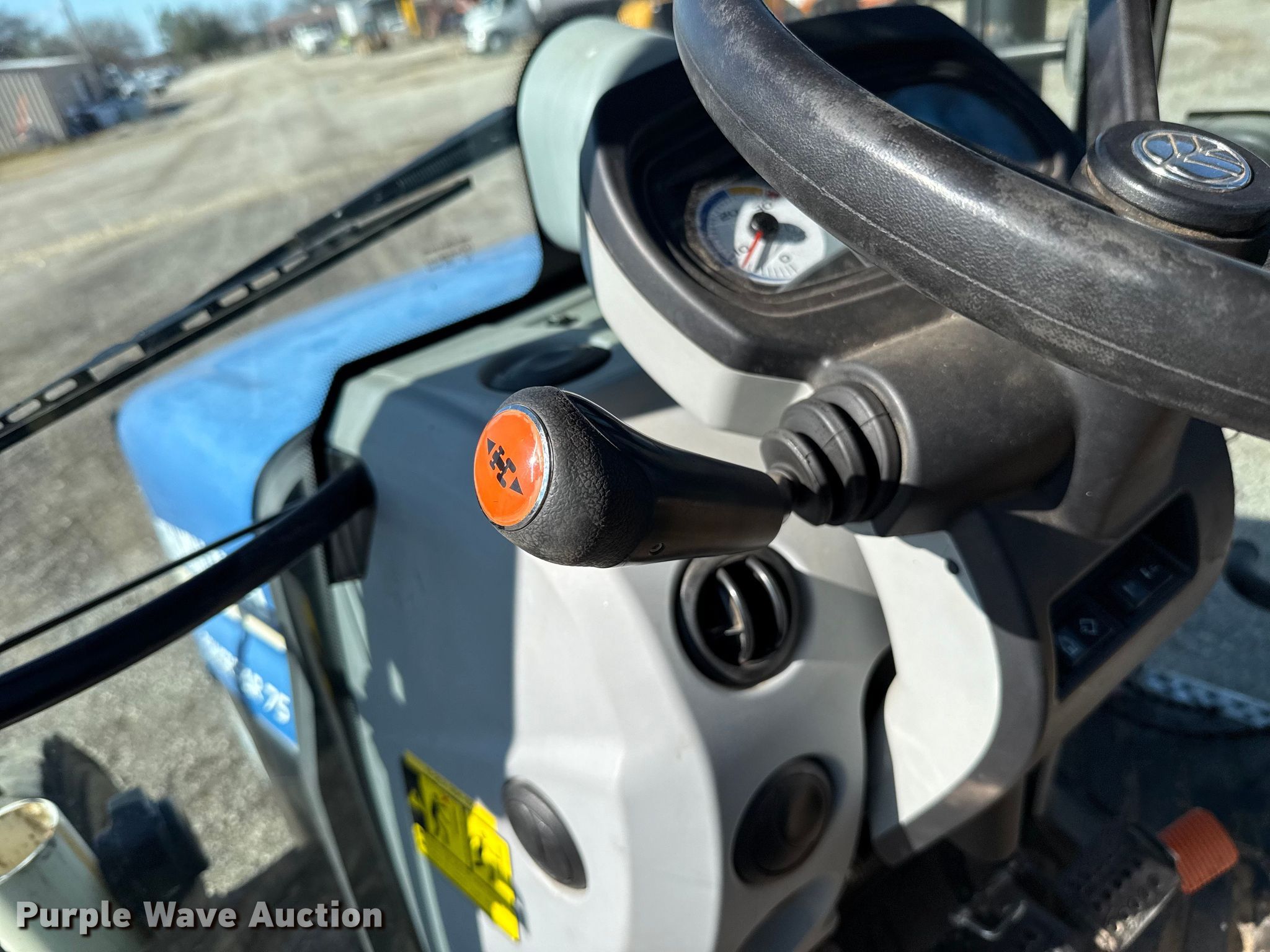2019 New Holland PowerStar 75 MFWD tractor. Hours: 2,281 on meter, Serial: ELRT1075KKAN00935, Unit #: 304-027. Engine FPT F5DFL463A, Serial: 00535738, Displacement: 3.4L, Cylinders: 4, Fuel type: Diesel. Transmission Synchro, 12F - 12R, Left-hand reverser, Differential lock. Operators station AC, Heat. Features PTO: 540, Three point, Seven pin outlet, Hydraulic remote sets Front: 2, Rear: 2, Loader ready, Loader Controls: Joystick. Tires Front: 12.5/80-18, Rear: 19.5L-24. Garvin County. Elmore City, OK 73433