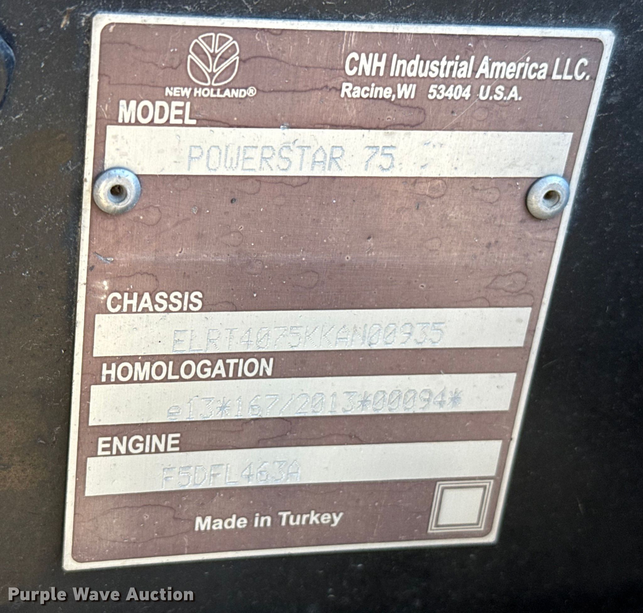 Purple Wave is selling a used Tractor in Oklahoma. This item is a 2019 New Holland PowerStar 75 MFWD tractor with the following: Hours: 2,281 on meter, Serial: ELRT1075KKAN00935, Unit #: 304-027