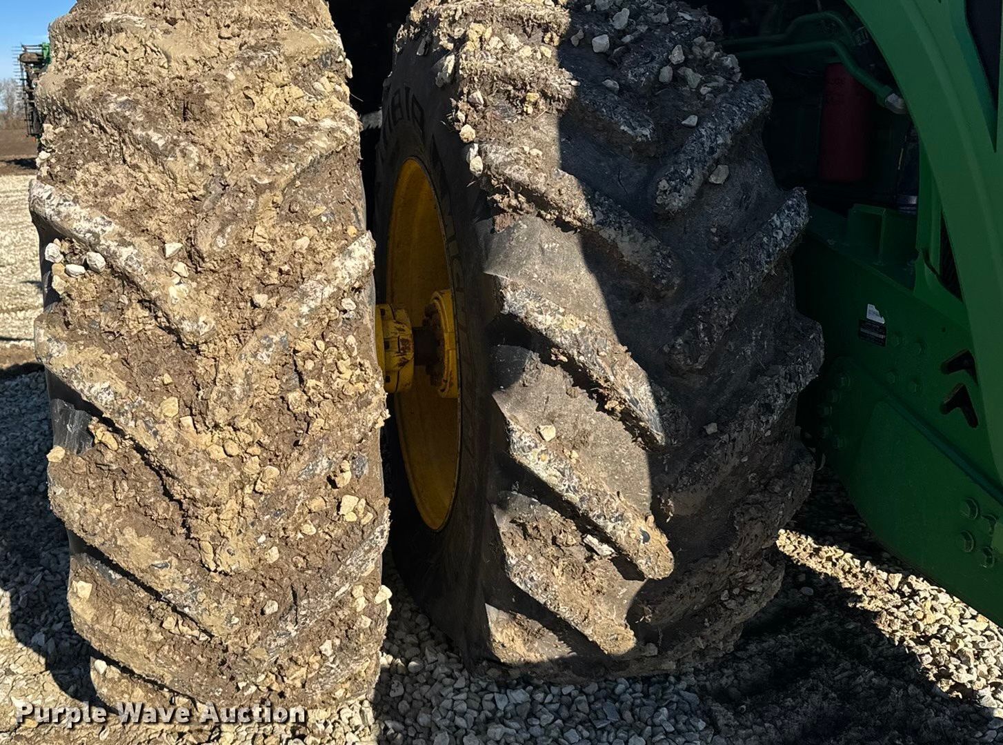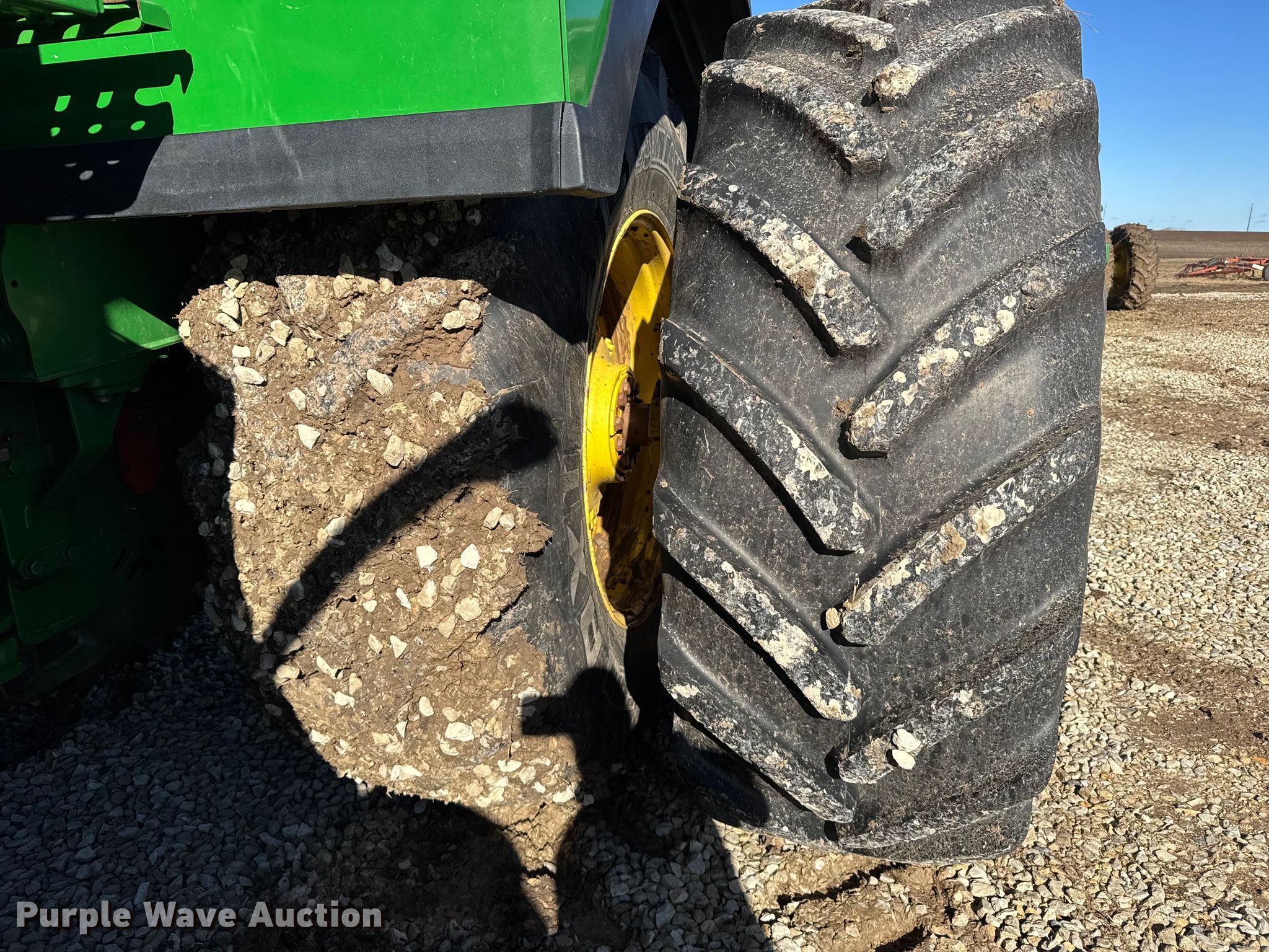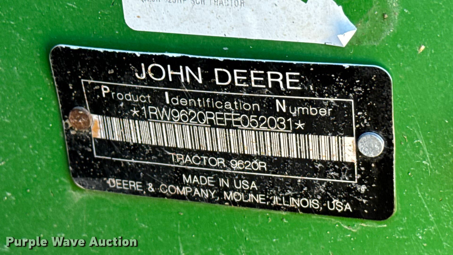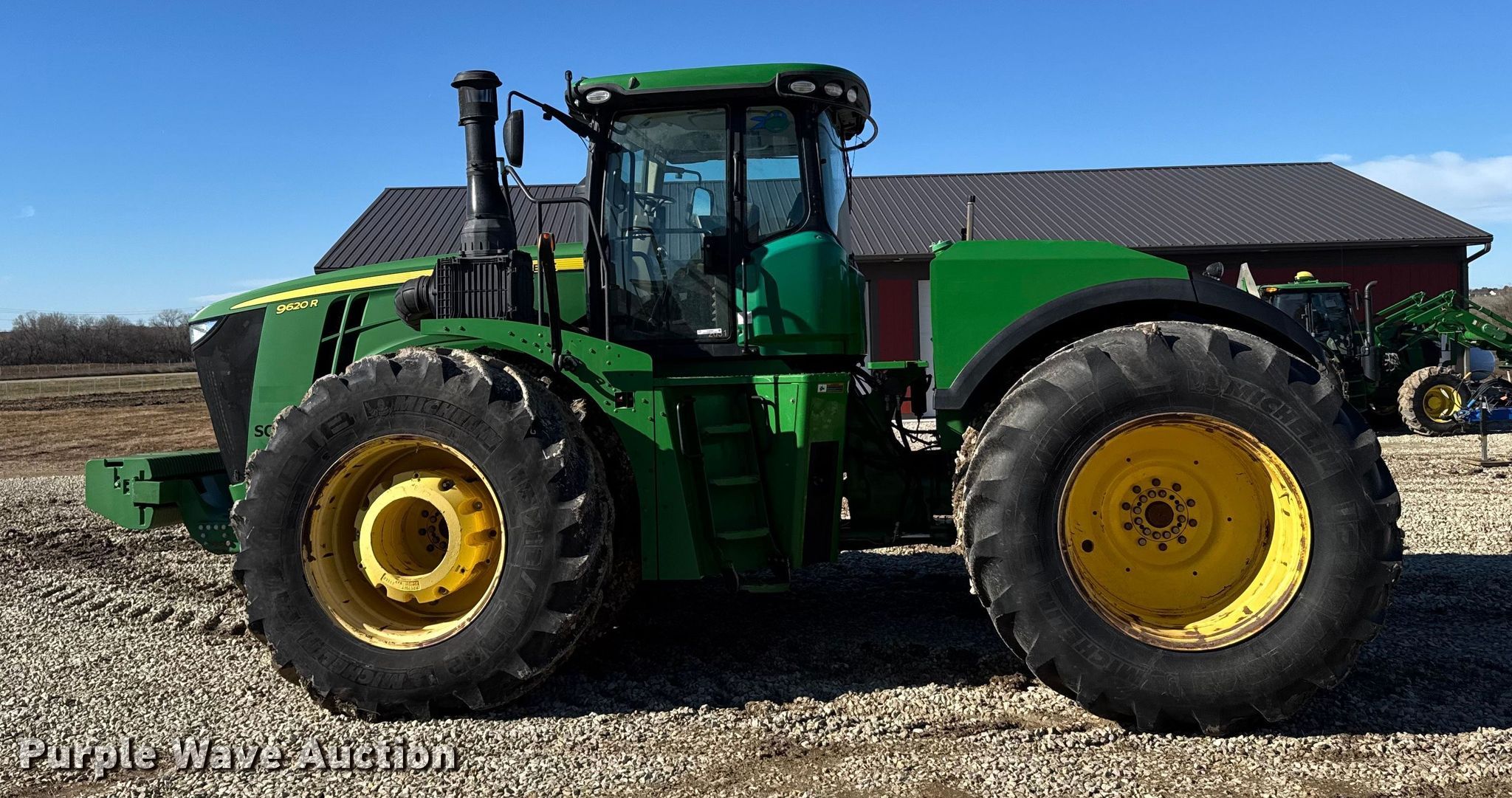 2015 John Deere 9620R Scraper Special 4WD tractor. Hours: 5,856 on meter, Serial: 1RW9620REFE052031. Engine Cylinders: 6, Fuel type: Diesel. Transmission Powershift, 18F - 6R, Differential lock. Operators station AC, Heat, GPS receiver John Deere, Display John Deere. Features Seven pin outlet, ISOBUS outlet, Hydraulic remote sets Rear: 6, Suitcase weights: 36. Tires Size: 710/79R42, Wheel weights: 6, Duals, Front duals. Notes Seller-provided outer-dual removal available upon request. Pursuant to Kansas law, Purple Wave will not be collecting sales taxes on any of the purchases made in this business liquidation auction. Ingermanson Farms-Open Inspection Wednesday December 17 and Monday December 29 from 9:00 a.m. to 3:00 p.m. 3504 East Magnolia Road. Salina, KS 67401