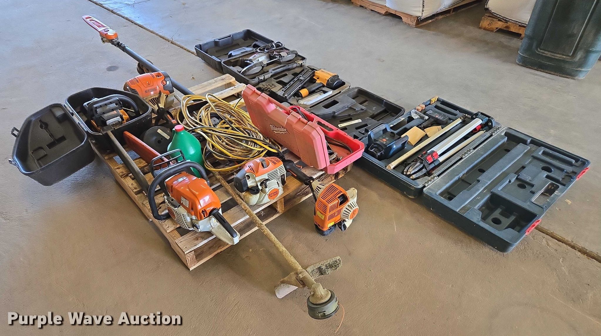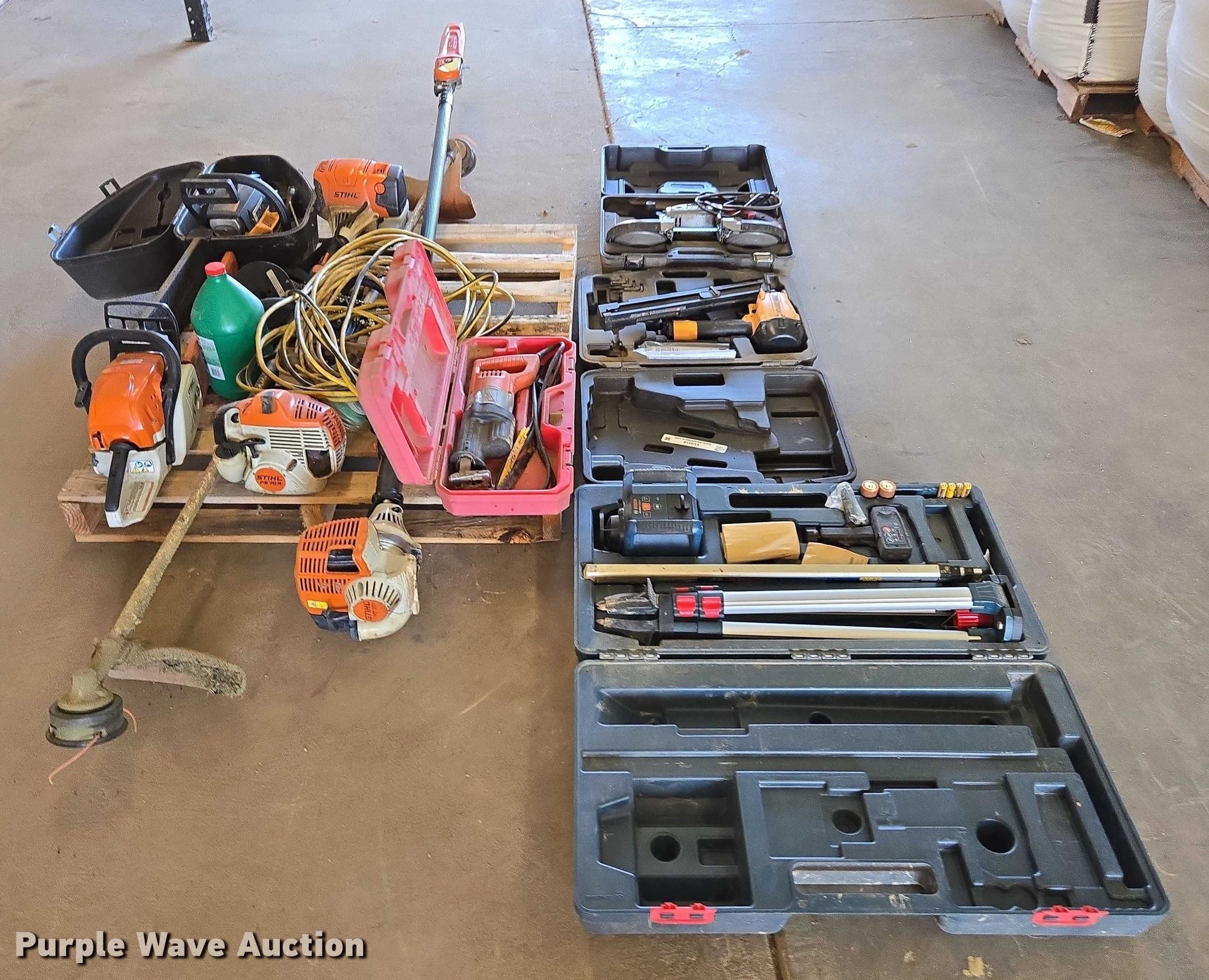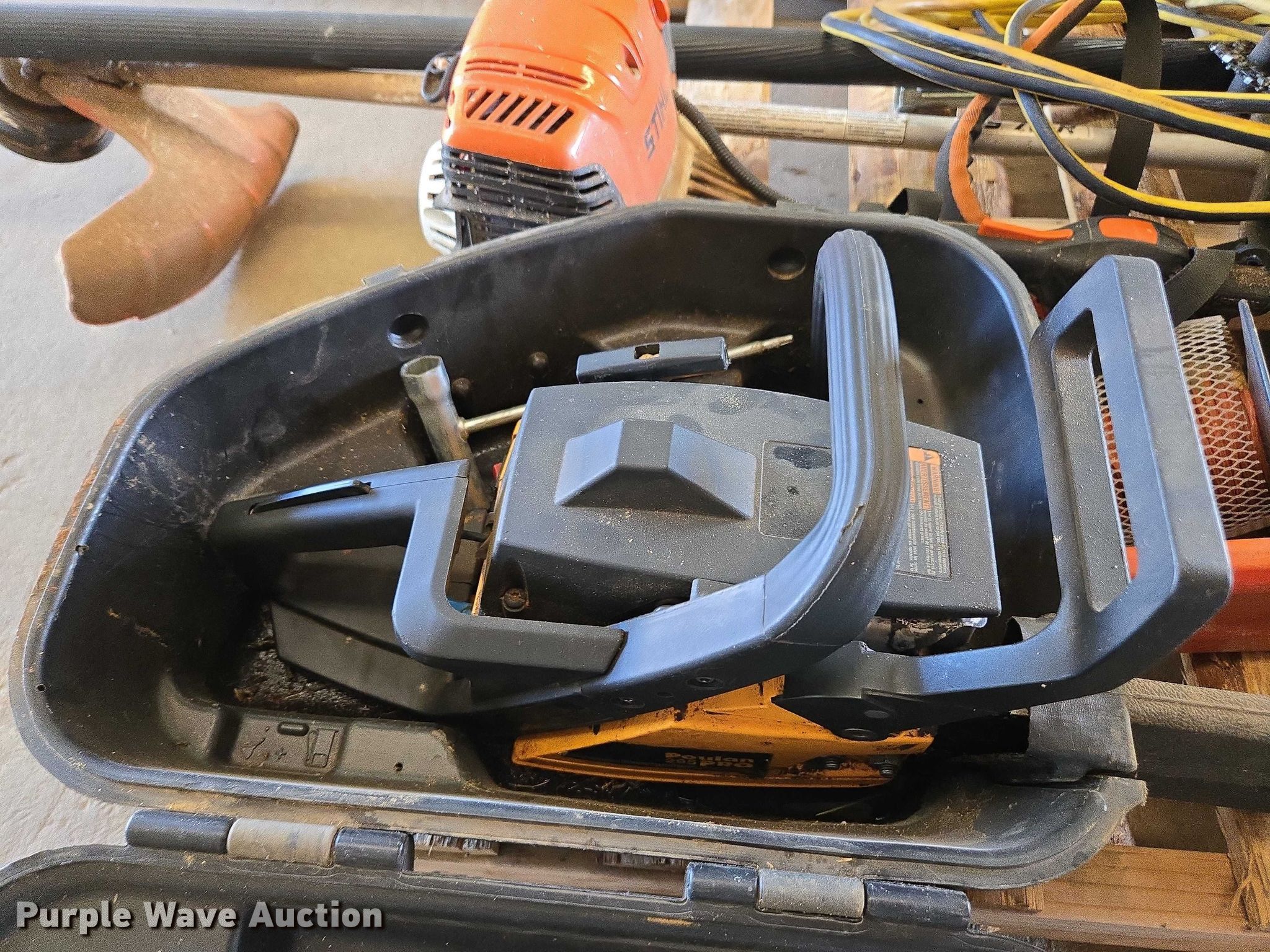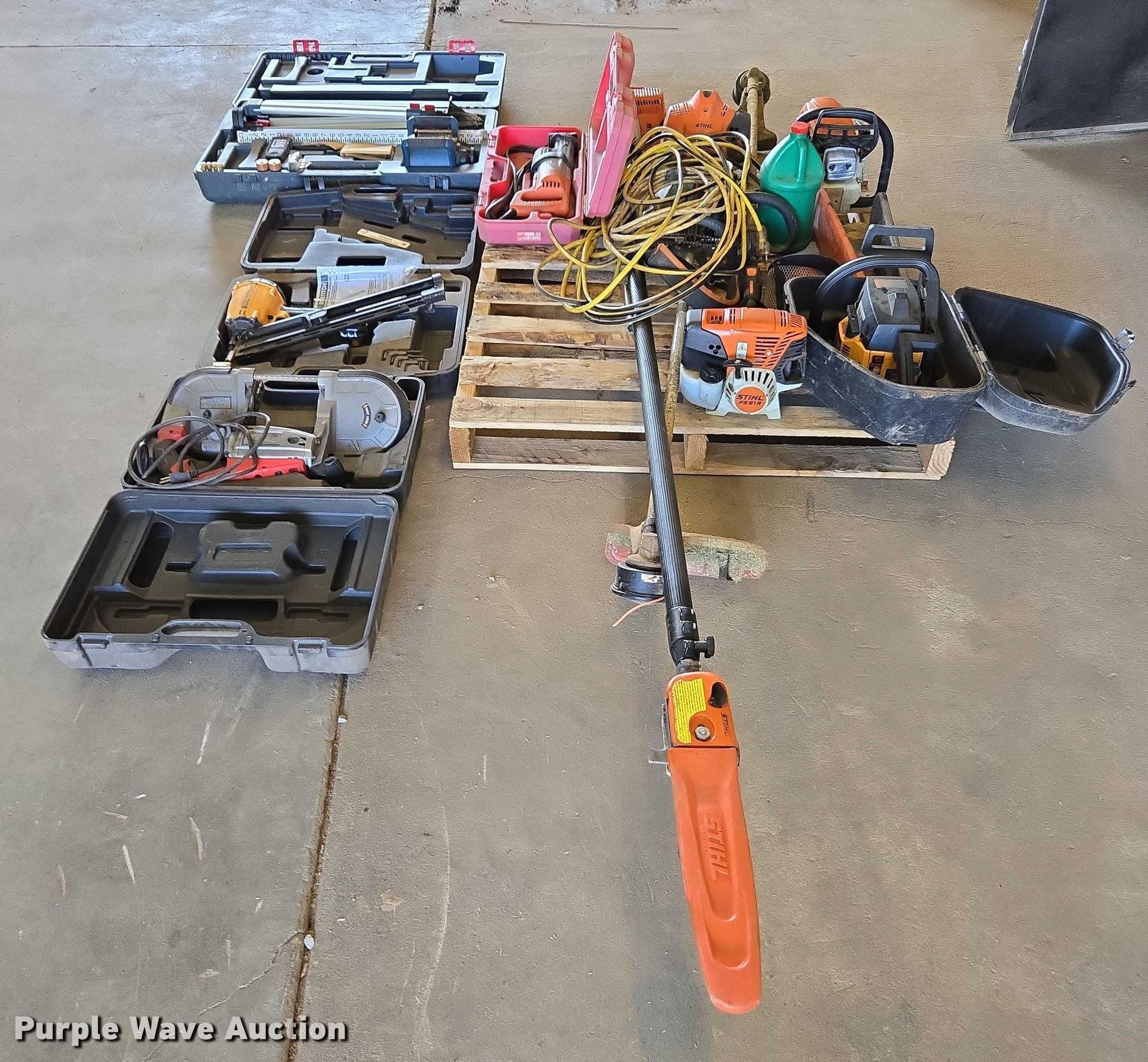 Purple Wave is selling a used Tools in Tennessee. This item is a Tools with the following: (2) chain saws, (2) weed eaters, Pole saw, Nail gun, Band saw, Transit, Sawzall