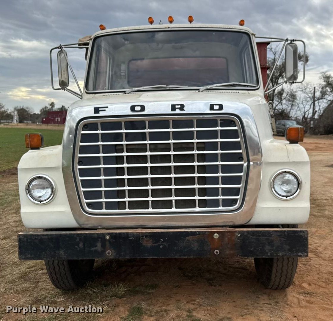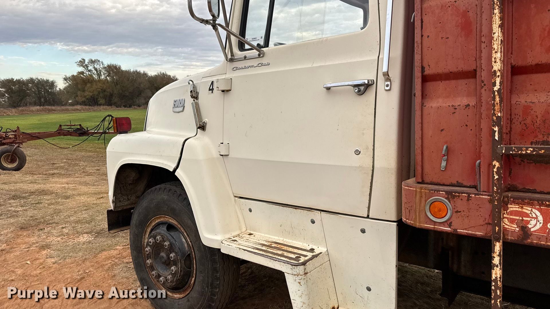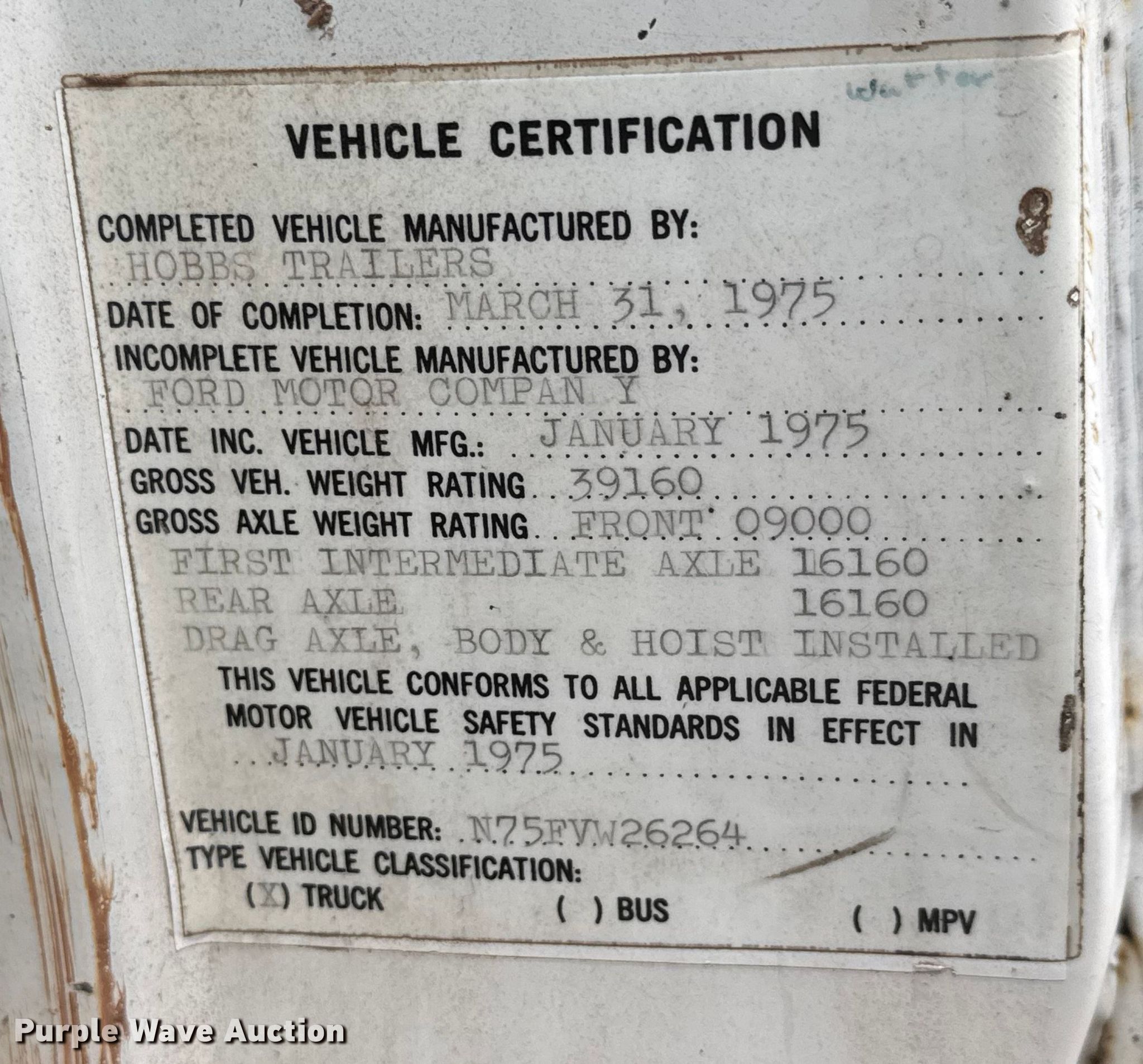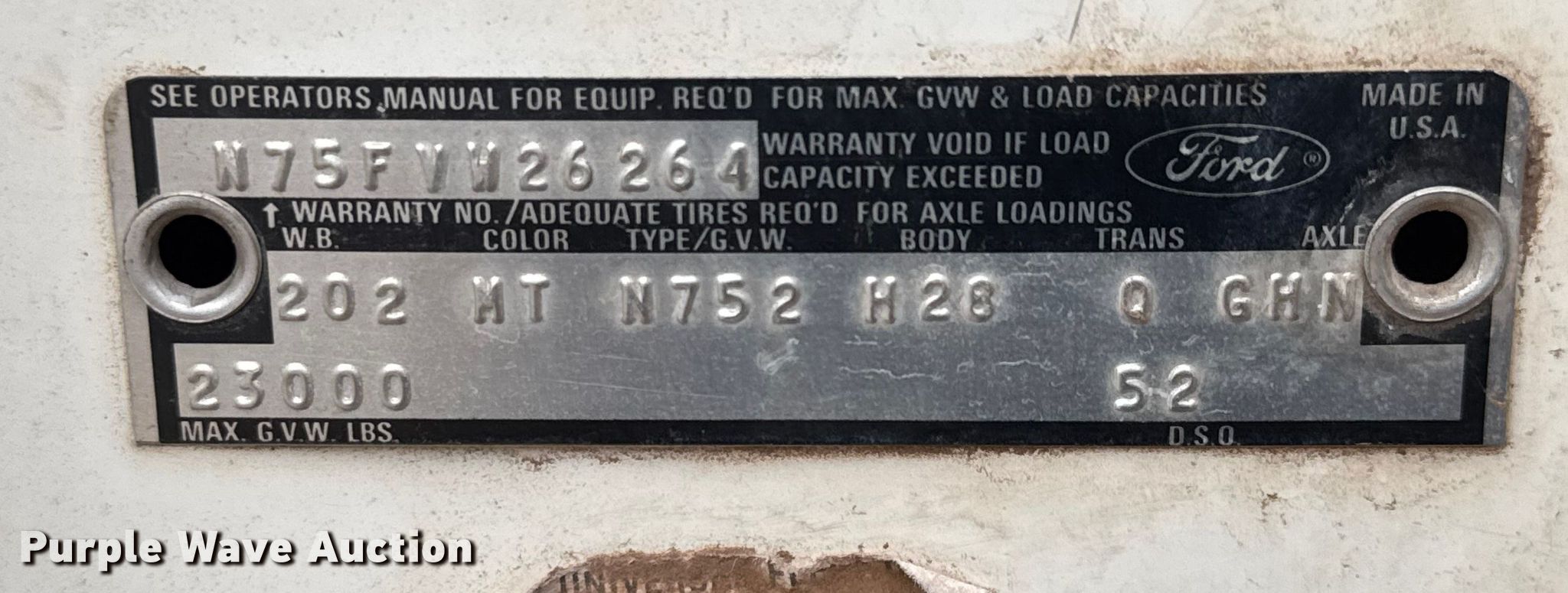 1975 Ford 750 grain truck. Miles: 65,669 on odometer, VIN: N75FVW26264. Engine Cylinders: 8, Fuel type: Gas. Transmission Manual, Speed: 5, plus 2. Chassis Axles: Tandem, Suspension: Spring, Brakes: Hydraulic, PTO, GVWR: 39,160 lbs. Interior Heat. Features Bed Dump bed, Omaha Standard, Length: 22', Width: 95", Side height: 52", Bed type: Steel, Ram: Dual, End gate: Manual. Tires Size: 9.00-20. Notes Windshield chipped or cracked. Oklahoma classic title. Title distribution may be delayed up to 14 days from verification of funds. Alva, OK 73717