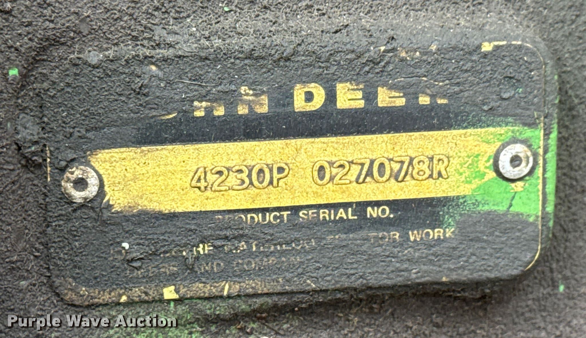 1975 John Deere 4230 tractor. Hours: 104 on meter, Serial: 027078R. Engine John Deere 6404DR-16, Serial: 432591R, Cylinders: 6, Fuel type: Diesel. Transmission Powershift, 8F - 4R, Differential lock. Operators station AC, Heat. Features PTO: 540, 1000, Three point Top link, Quick attach, Hydraulic remote sets Rear: 2. Tires Front: 10.00-16, Rear: 18.4R38. Notes Hour meter rolled over, Non-operational AC, Heat, Radio. Inman, KS 67546