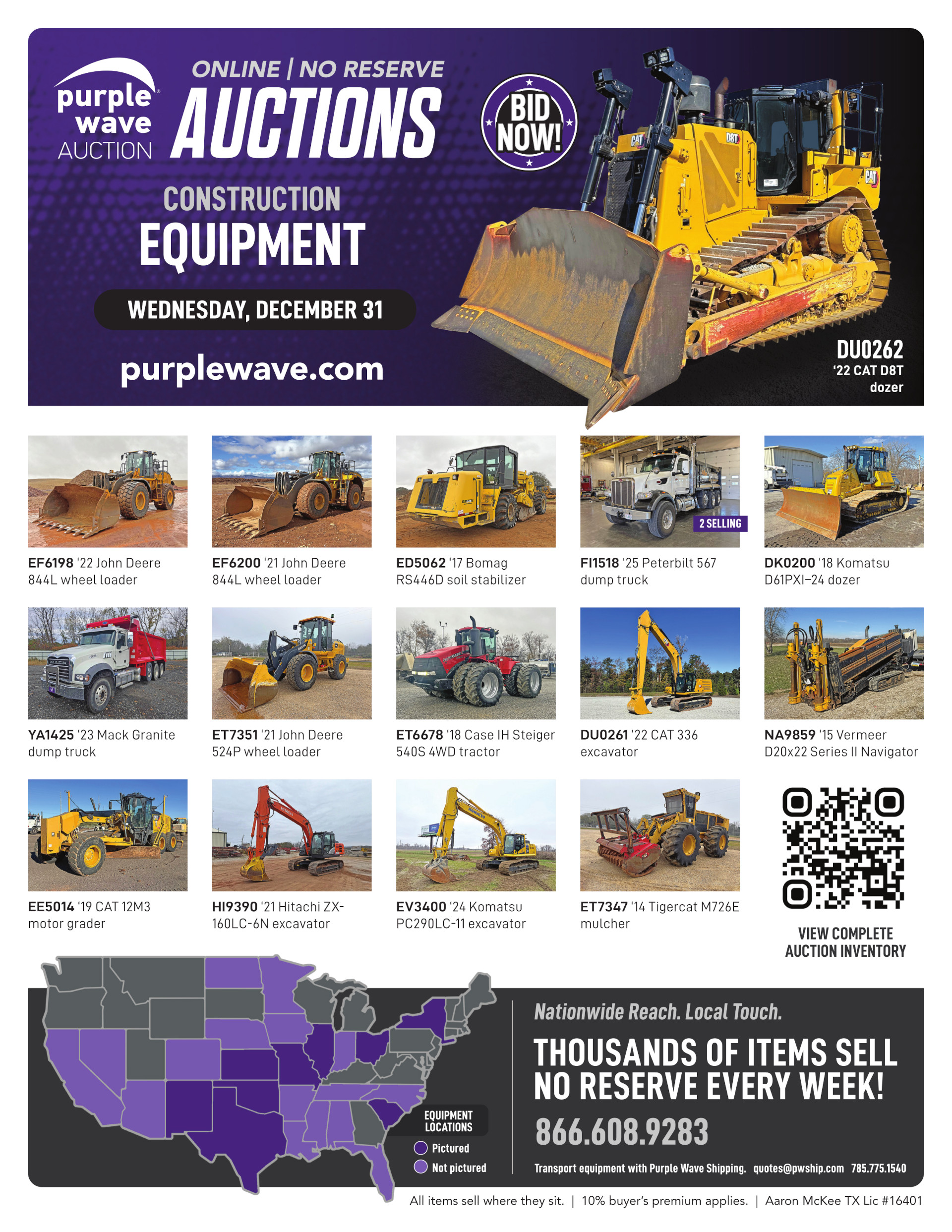 This auction is conducted by Purple Wave, Inc., whose home office is 825 Levee Drive, Manhattan, Kansas. Aaron McKee, Texas auctioneer license # 16401, operates Purple Wave, Inc. Complaints against us may be directed to the Texas Department of Licensing and Regulation, P.O. Box 12157, Austin, Texas 78711, (512) 463-6599. For additional required information, see the attached document.