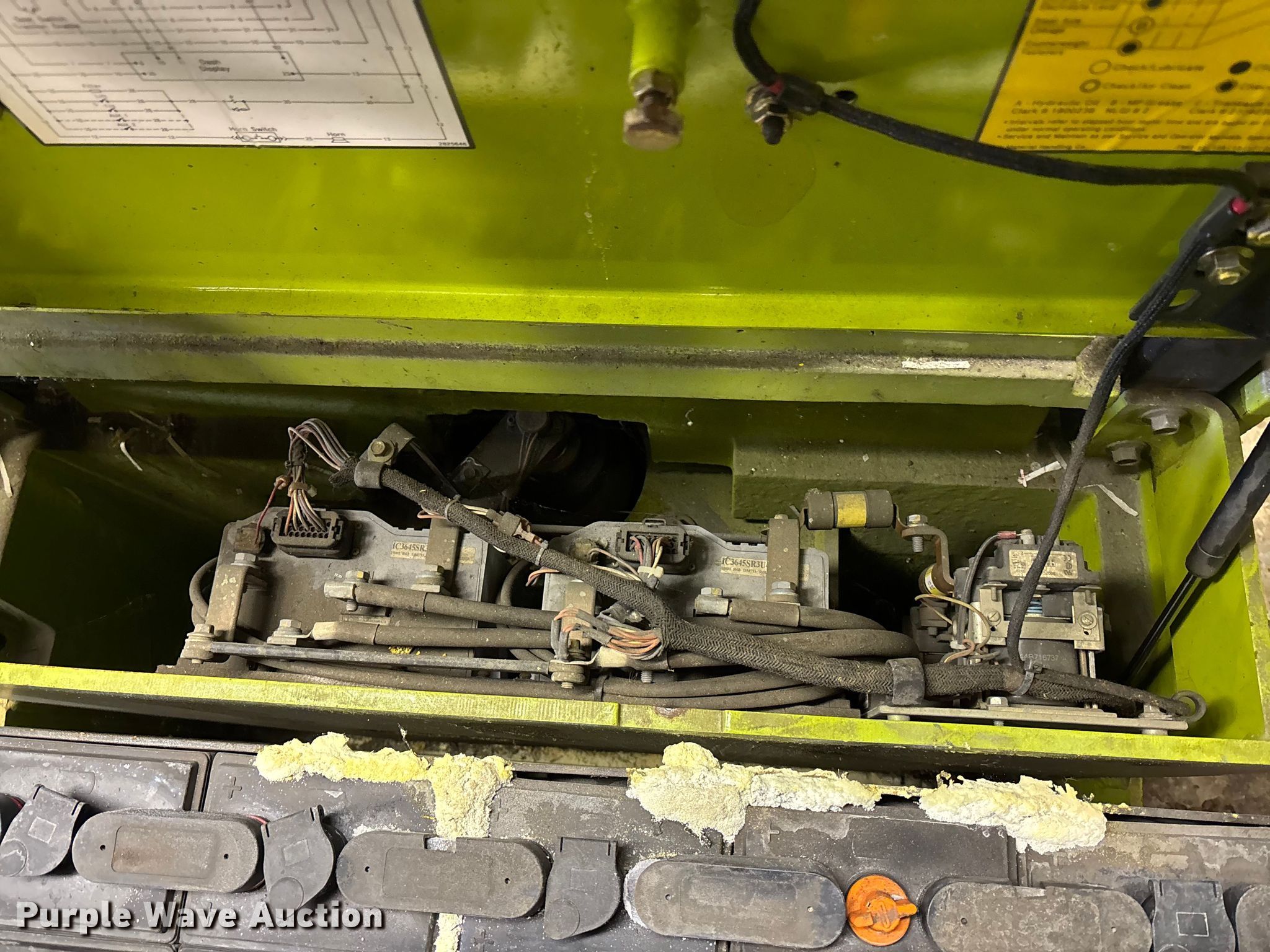Clark TMG15S forklift. Hours: 563 on meter, Serial: TMG248–1779–9570KF. Electric Motor Phase: Single, Charger: Single phase. Transmission Hydrostatic. Features Maximum lift capacity: 2,150 lbs, Maximum lift height: 188", Collapsed mast height: 83", Mast stages: 3, Side shift, Mast tilt, Fork length: 42". Tires Size: 18x7x12 1/8, Solid. Notes Dead battery, Battery issues, does not hold charge, Non-operational unit. Apace Wahoo. Wahoo, NE 68066