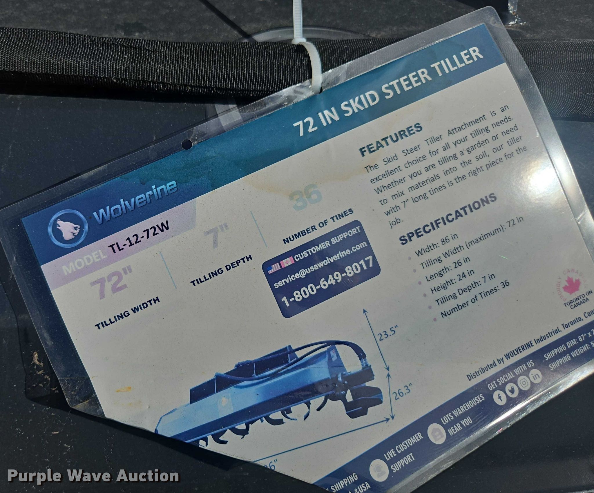 This 2025 Wolverine TL-12-72W skid steer tiller will sell to the highest bidder regardless of price.