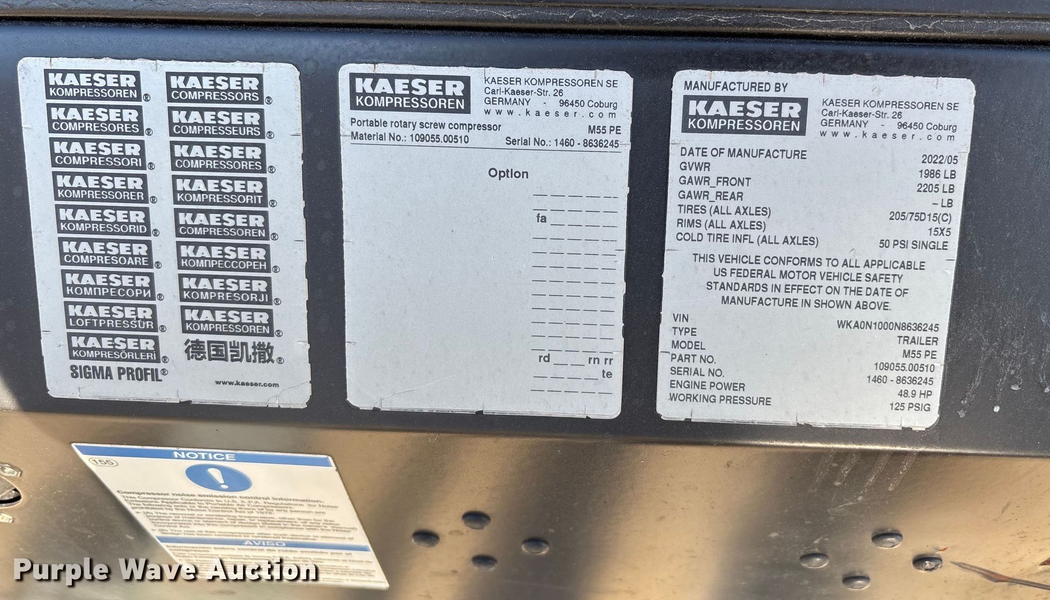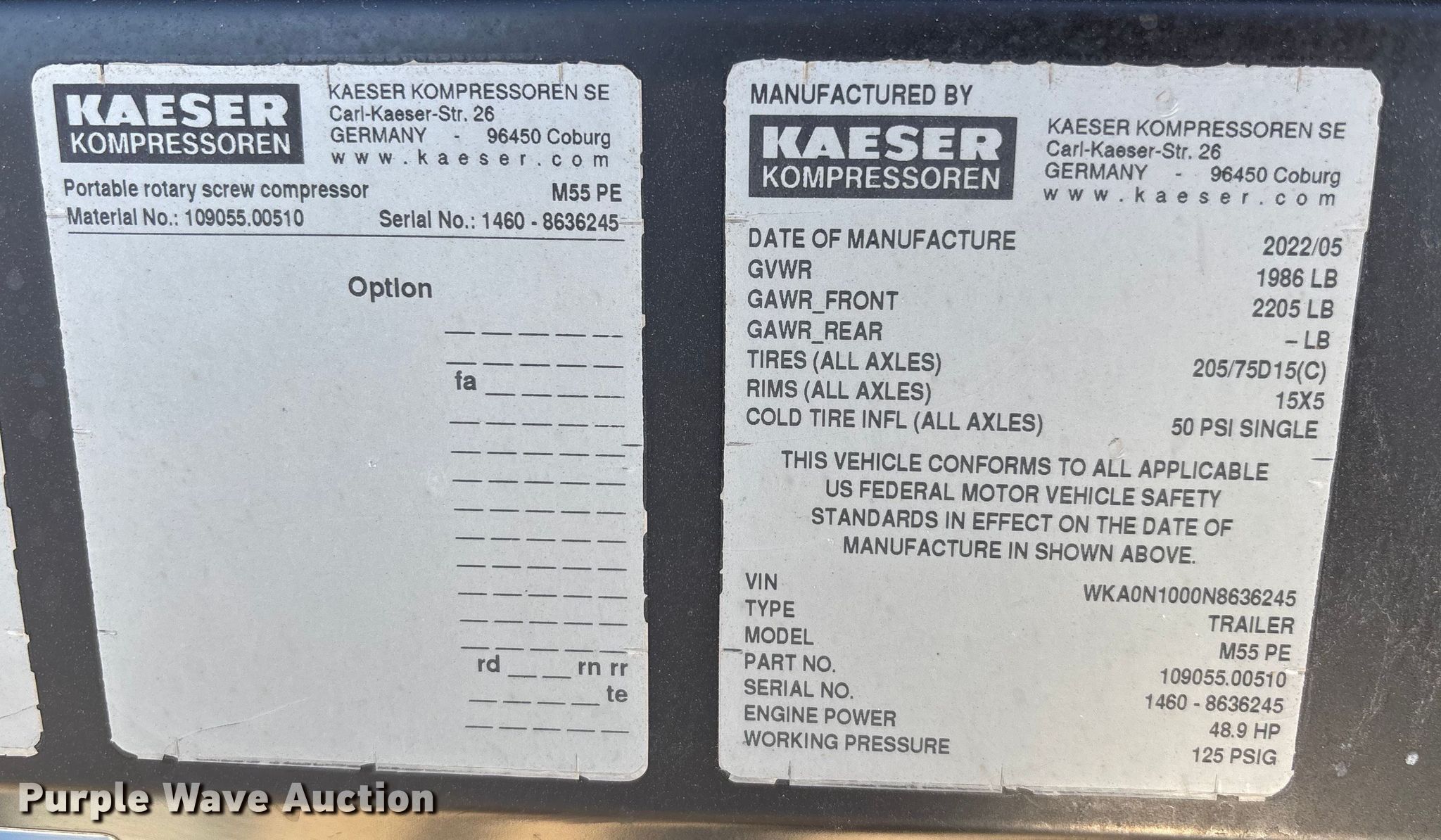 Purple Wave is selling a used Air Compressor in Texas. This item is a 2022 Kaeser Mobilair M55 air compressor with the following: Hours: 926 on meter, VIN: WKA0N1000N8636245, Unit #: 143037