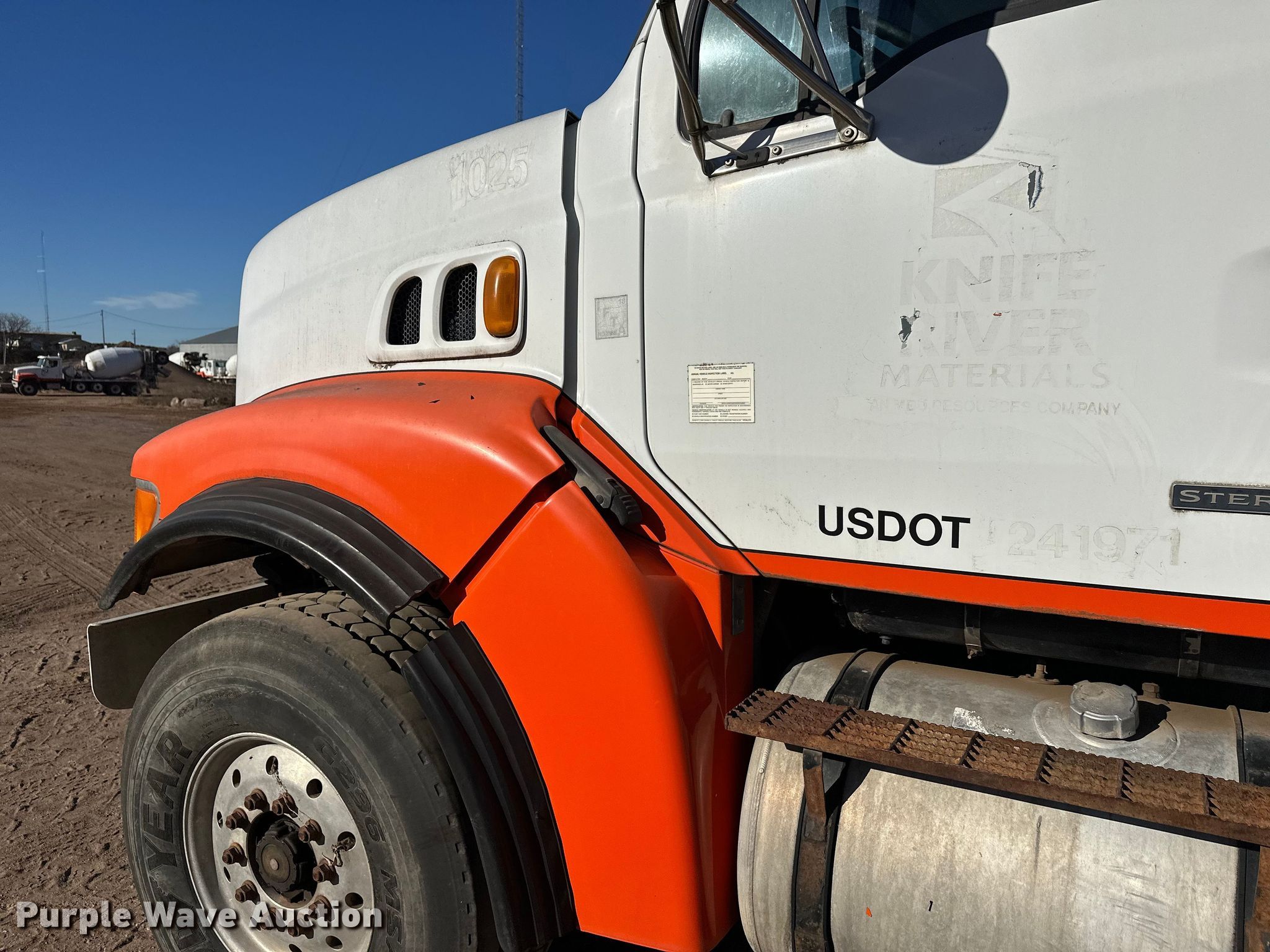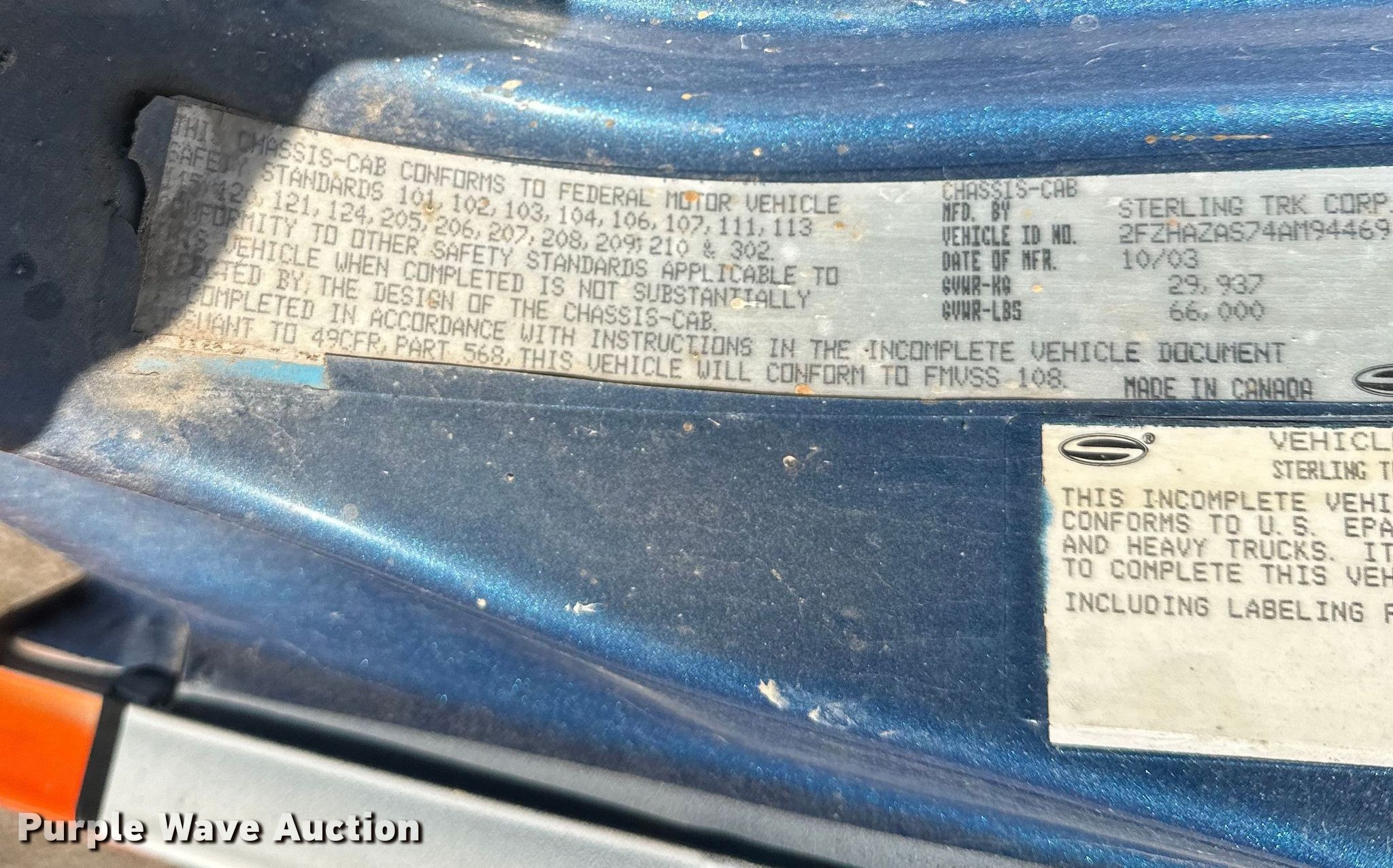 2004 Sterling L9500 ready mix truck. Miles: 195,982 on odometer, Hours: 22,714 on meter, VIN: 2FZHAZAS74AM94469, Unit #: 21025. Engine Caterpillar C12, Displacement: 12.0L, Cylinders: 6, Fuel type: Diesel, HP: 340. Transmission Eaton Fuller, Manual. Chassis Axles: 4, Pusher axle Steerable, Tag axle Steerable, Differential lock: Inter-axle, Suspension: Spring over walking beam, Brakes: Air, PTO, GVWR: 66,000 lbs FAWR: 20,000 lbs, IAWR: 23,000 lbs, RAWR: 23,000 lbs. Interior AC, Heat, Heated mirrors, Cruise control. Features Mixer McNeilus, Discharge: Rear, In-cab controls, Rear drum controls, Water tank capacity: 150 gallons, Chute Extensions: 2, Chute type: Steel.. Tires Front: 425/65R22.5, Rear: 11R22.5. Notes Dash warning indicator: Check engine, Engine protect, Fault code: ECU 128, Tires missing. North Dakota title. Title distribution may be delayed up to 14 days from verification of funds. Knife River. Harris, MN 55032