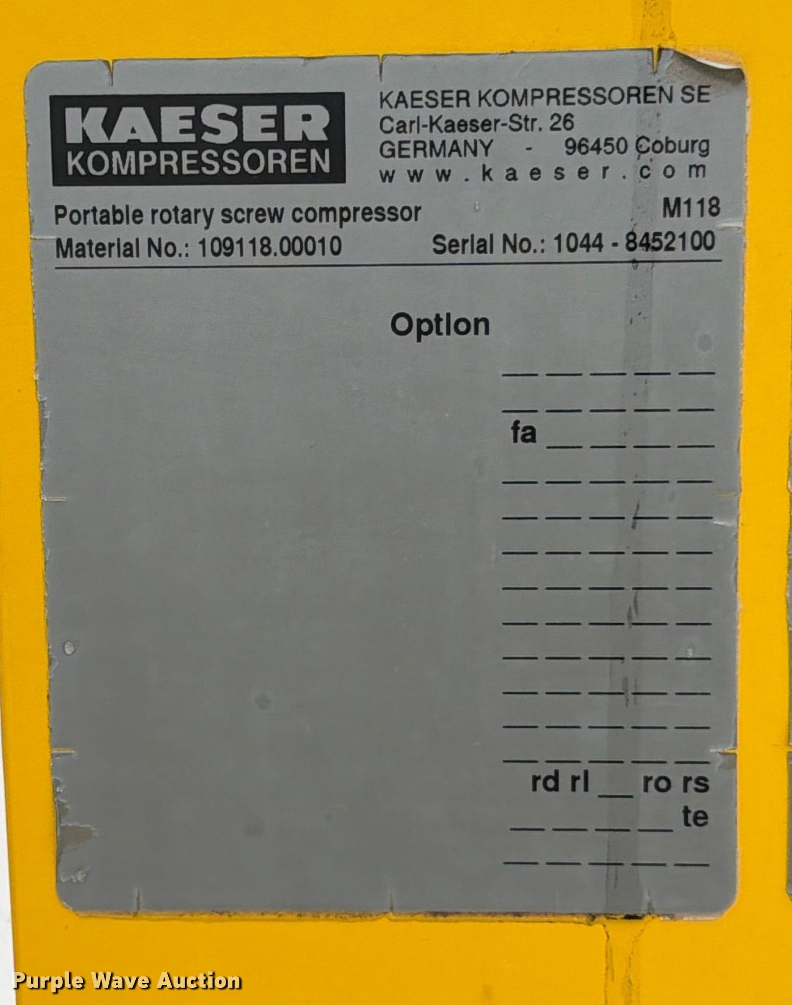 Purple Wave is selling a used Air Compressor in Texas. This item is a 2022 Kaeser M118 air compressor with the following: Hours: 1,696 on meter, VIN: WKA0F2203N8452100, Serial: 1044 - 8452100, Unit #: EQ0136891