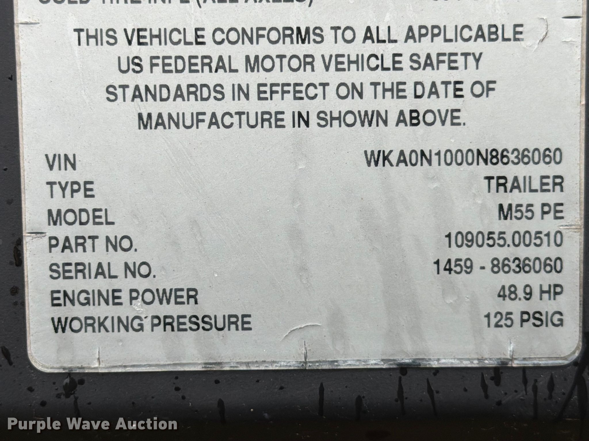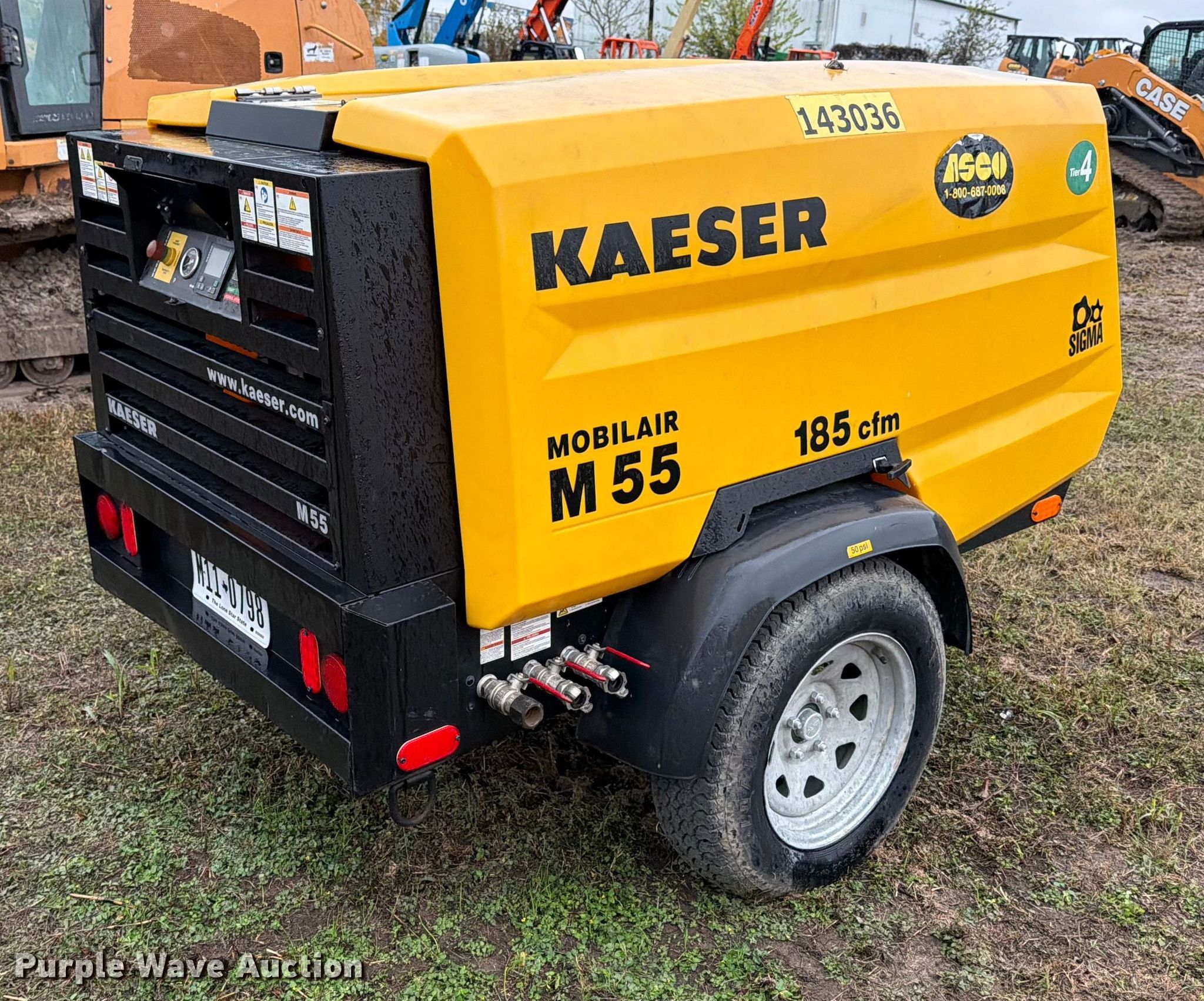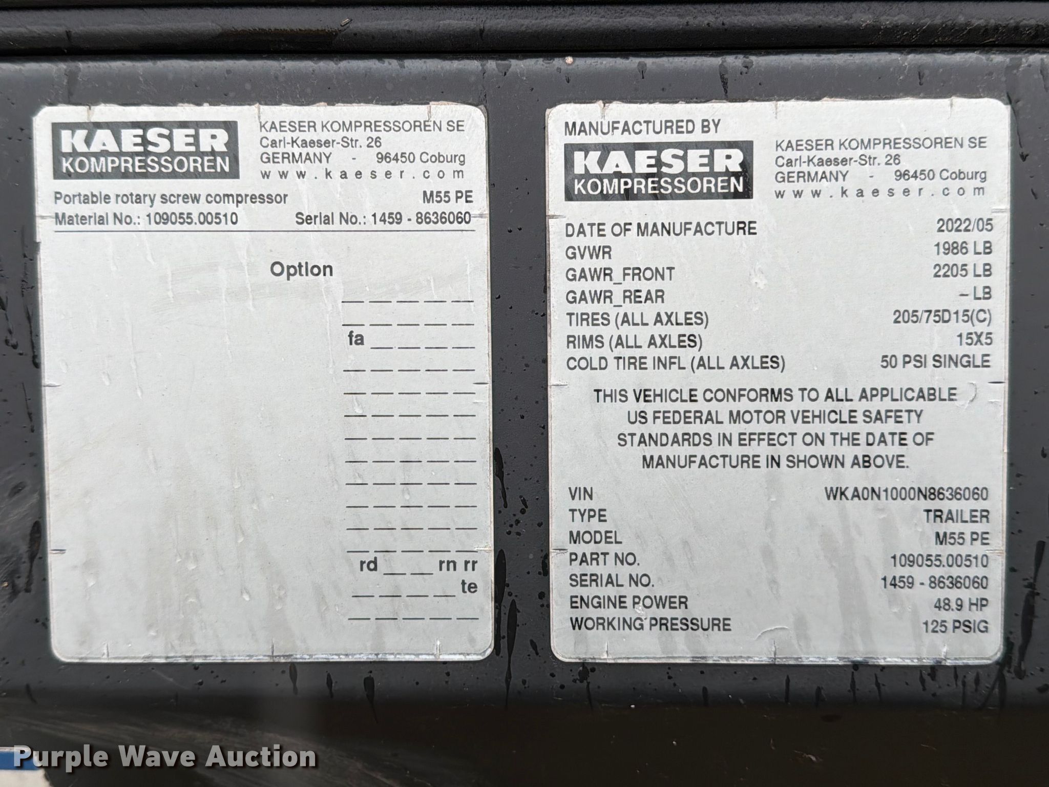 Purple Wave is selling a used Air Compressor in Texas. This item is a 2022 Kaeser M55 PE air compressor with the following: Hours: 169 on meter, VIN: WKA0N1000N8636060, Serial: 1459 - 8636060, Unit #: EQ0143036