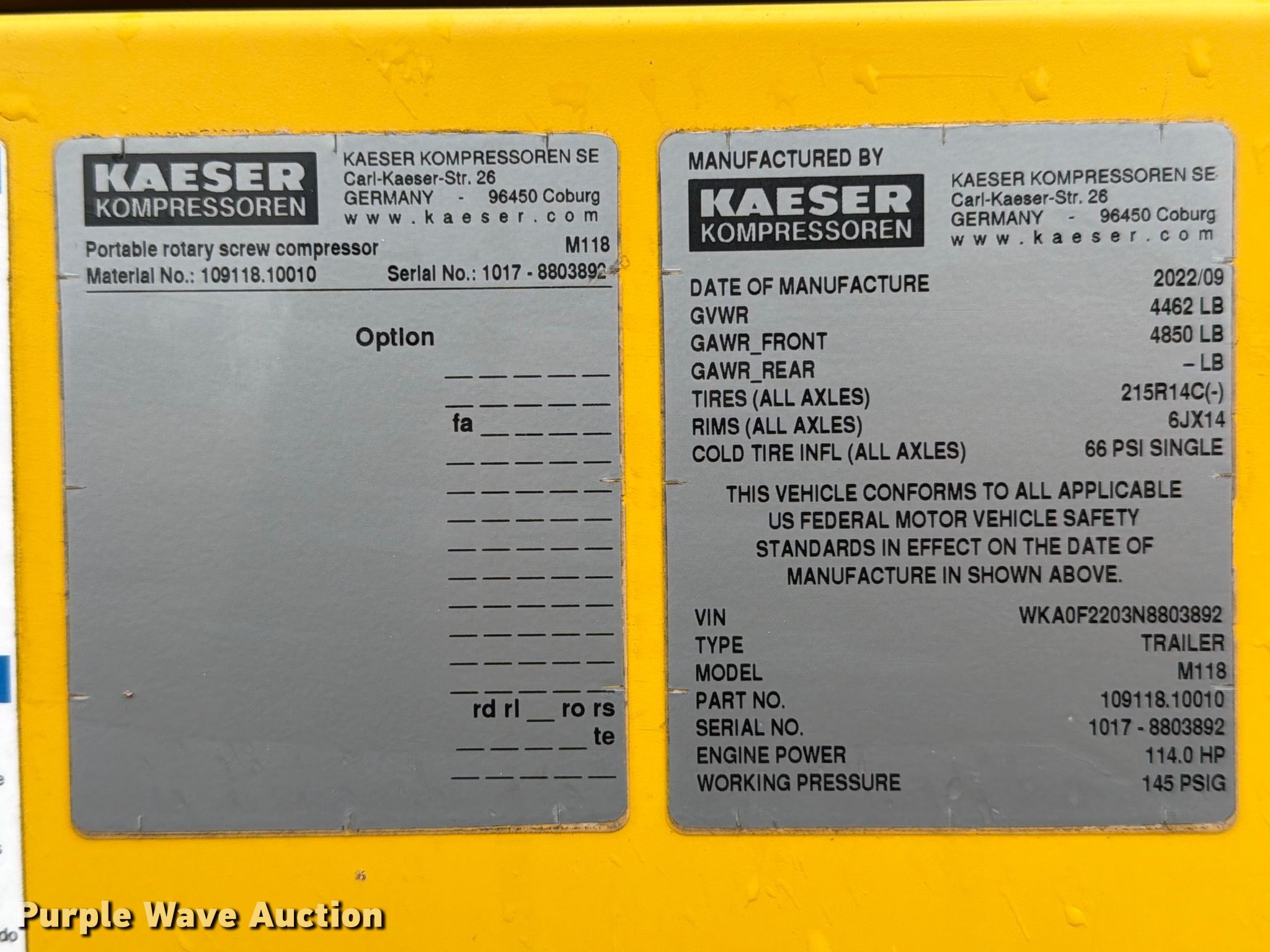 Purple Wave is selling a used Air Compressor in Texas. This item is a 2022 Kaeser M118 air compressor with the following: Hours: 755 on meter, VIN: WKA0F2203N8803892, Serial: 1017 - 8803892, Unit #: EQ0143067