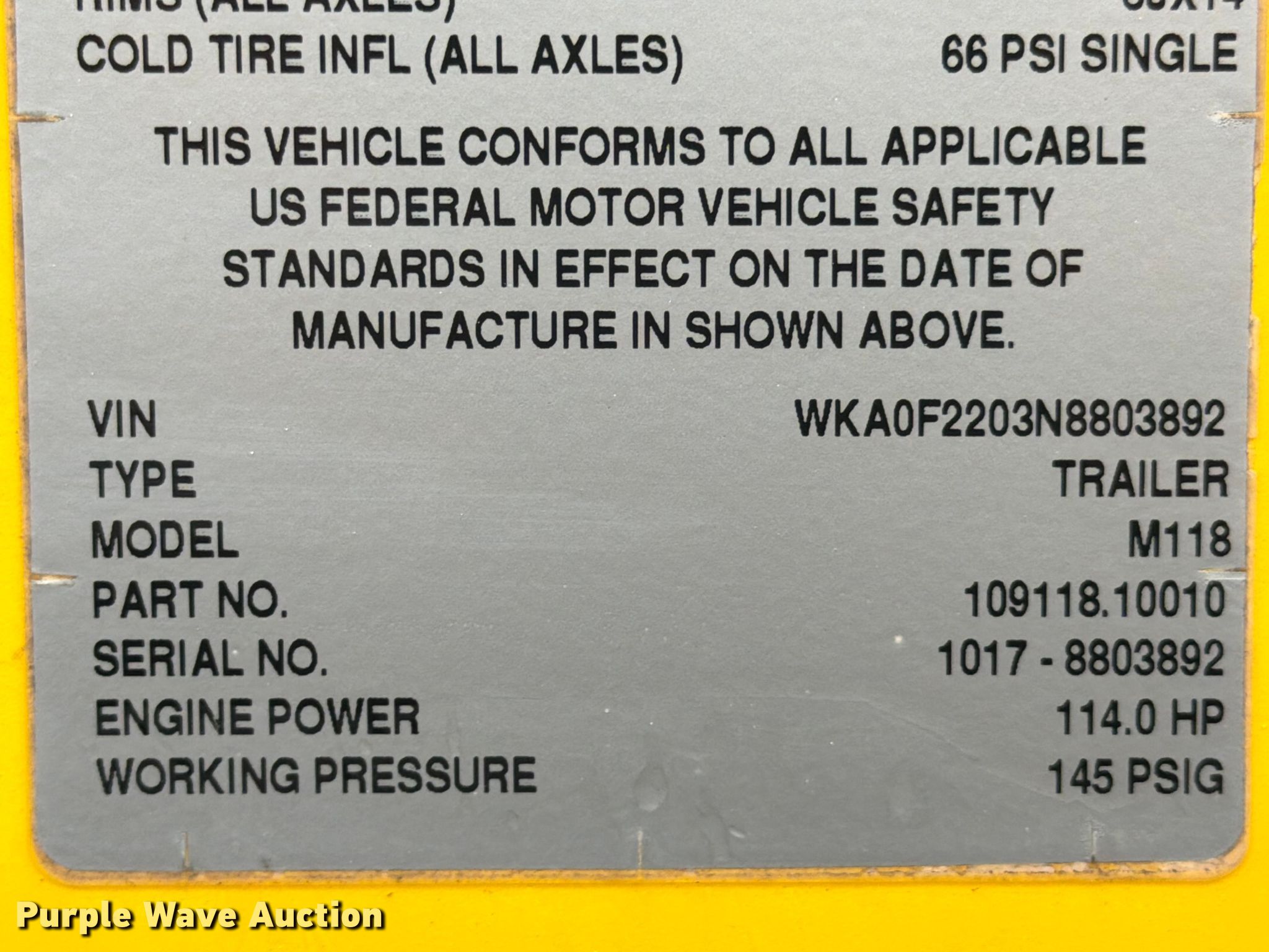2022 Kaeser M118 air compressor. Hours: 755 on meter, VIN: WKA0F2203N8803892, Serial: 1017 - 8803892, Unit #: EQ0143067. Engine Deutz TCD 3.6 L4, Serial: 12821674, Displacement: 3.621L, Cylinders: 4, Fuel type: Diesel, kW: 85. Features Air compressor Kaeser, CFM: 405, PSI: 145. Trailer 14' L x 76" W, Ball hitch size: 2", Suspension: Torsion, Brakes: Hydraulic, Axles: Single, Tire size: 215R14C, GVWR: 4,462 lbs, GAWR: 4,850 lbs. This is worksite support equipment and will not come with a title. Transfer of ownership documentation will be a bill of sale. ASCO Equipment. Brenham, TX 77833