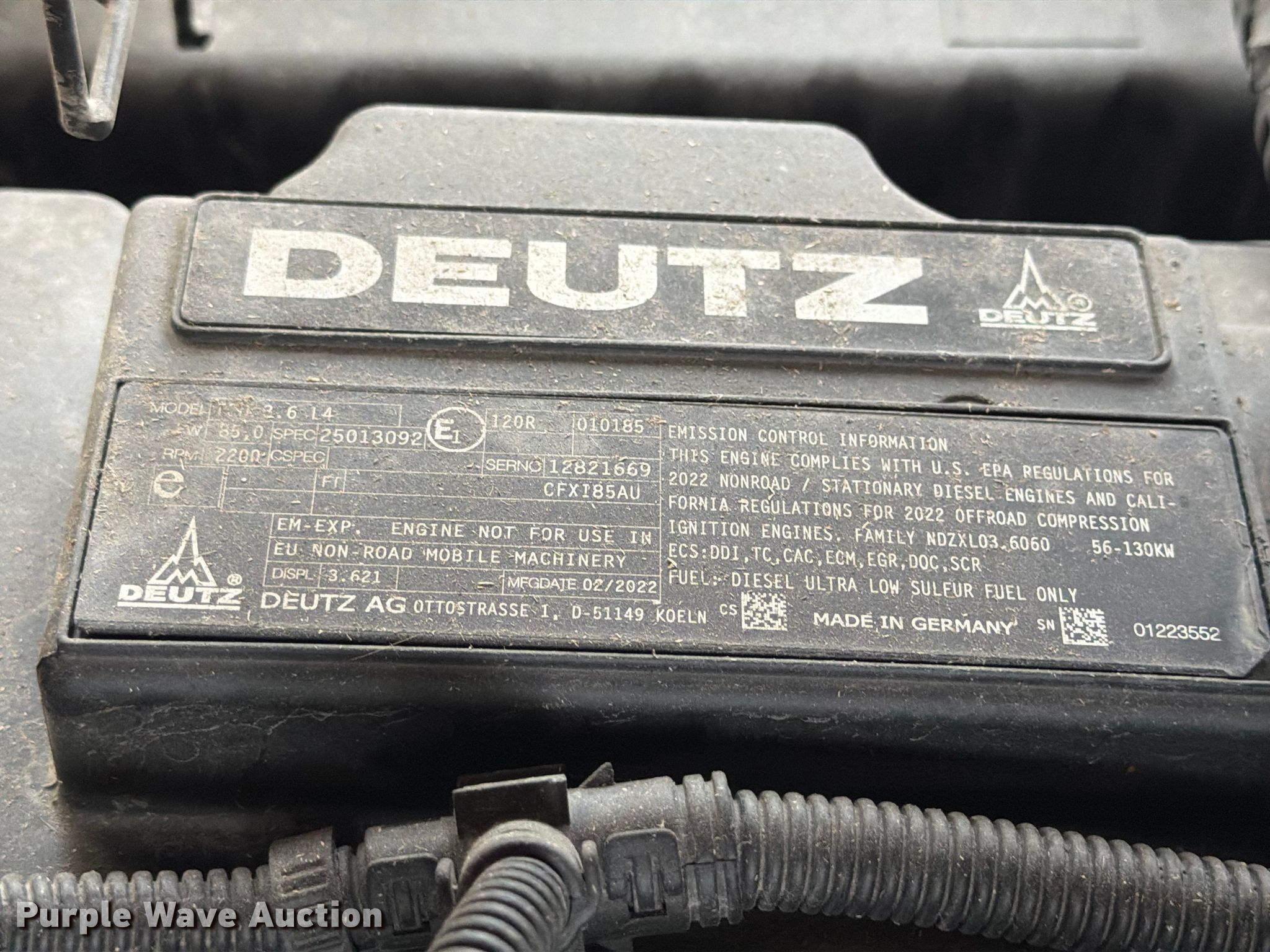 2022 Kaeser M118 air compressor. Hours: 175 on meter, VIN: WKA0F2203N8822776, Serial: 1025 - 8822776, Unit #: EQ0143069. Engine Deutz TCD 3.6 L4, Serial: 12821669, Displacement: 3.621L, Cylinders: 4, Fuel type: Diesel, HP: 114. Features Air compressor Kaeser, CFM: 405, PSI: 145. Trailer 14' L x 74" W, Ball hitch size: 2", Suspension: Torsion, Brakes: Hydraulic, Axles: Single, Tire size: 215R14C, GVWR: 4,462 lbs, GAWR: 4,850 lbs. This is worksite support equipment and will not come with a title. Transfer of ownership documentation will be a bill of sale. ASCO Equipment. Bryan, TX 77803