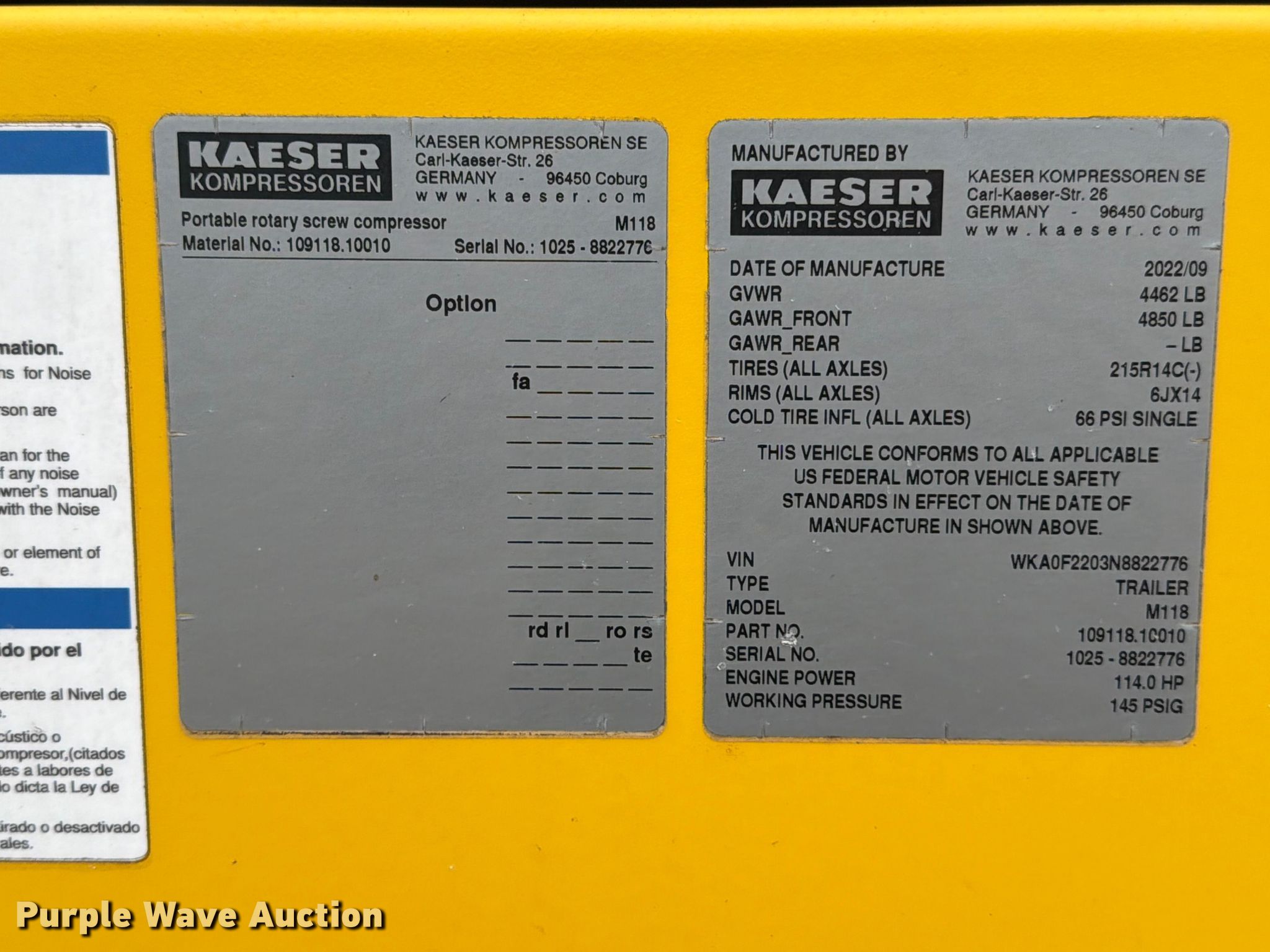 Purple Wave is selling a used Air Compressor in Texas. This item is a 2022 Kaeser M118 air compressor with the following: Hours: 175 on meter, VIN: WKA0F2203N8822776, Serial: 1025 - 8822776, Unit #: EQ0143069