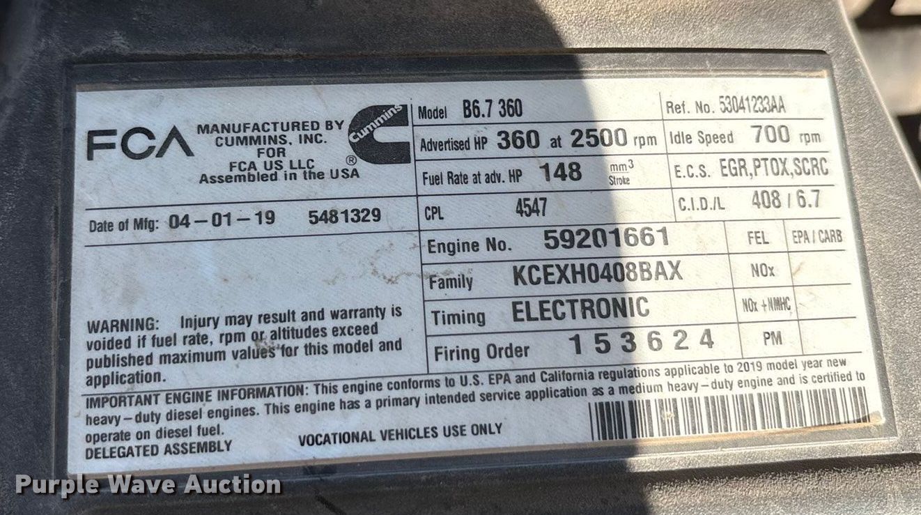 2019 RAM 5500 bucket truck. Miles: 214,905 on odometer, VIN: 3C7WRNBL0KG540518, Unit #: 585. Engine Cummins B6.7, Serial: 59201661, Displacement: 6.7L, Cylinders: 6, Fuel type: Diesel, HP: 360. Transmission Automatic. Chassis Four wheel drive, Axles: Single, Suspension: Spring, Brakes: Hydraulic, PTO, GVWR: 19,500 lbs. Interior AC, Heat, Heated mirrors, Power windows, Power locks, Cruise control, Auxiliary controls. Features Bed Dakota Bodies 122-SB, Serial: DB41806, Length: 122", Width: 93", Boom 2019 Versalift VST-40I, Serial: KW190184, Boom length: 16', Maximum lift capacity: 500 lbs, Maximum lift height: 40', Boom type: Articulating, Insulated, Telescopic, Man basket, Boom controls Ground, Platform/ basket, Material handler. Tires Size: 225/70R19.5, Brand: Goodyear. Notes Dash warning indicator: Electronic throttle control, DEF warning, Error codes: P061B-00, P203F-00, Possible injector issues, Lug nut and wheel stud missing. Oklahoma title. Title distribution may be delayed up to 14 days from verification of funds. Cotton Electric COOP. Walters, OK 73572