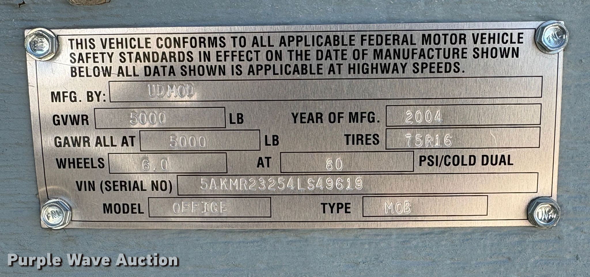 Purple Wave is selling a used Manufactured Home or Office in California. This item is a 2004 UD Module Office mobile office trailer with the following: Serial: 5AKMR23254LS49619