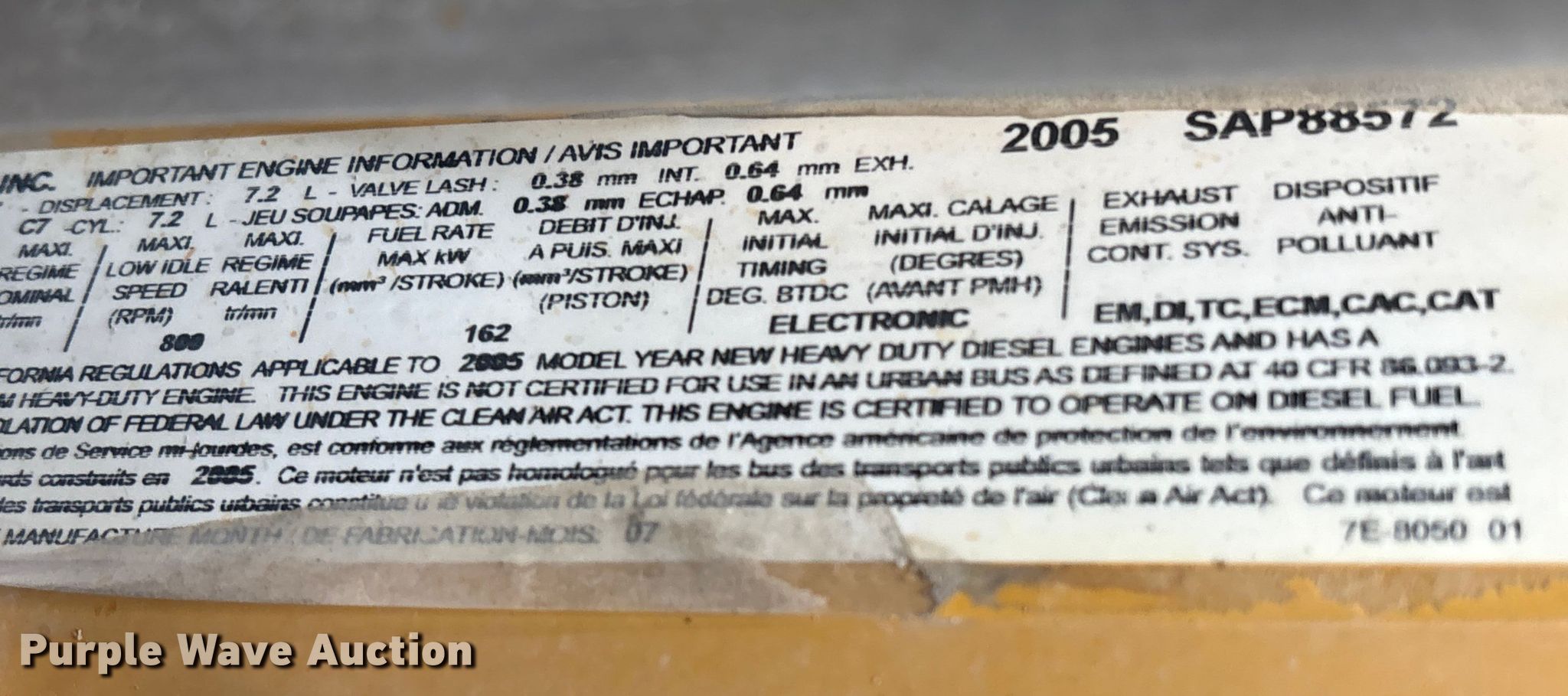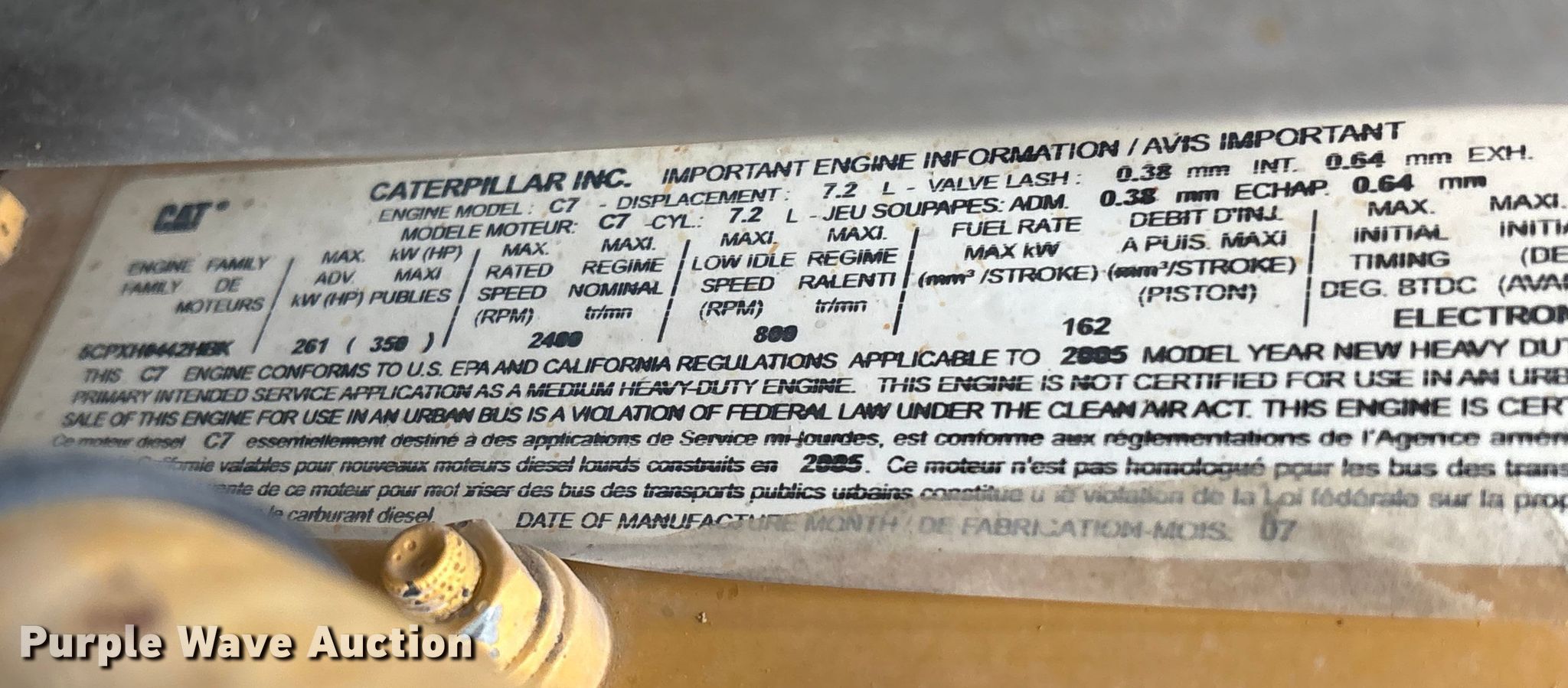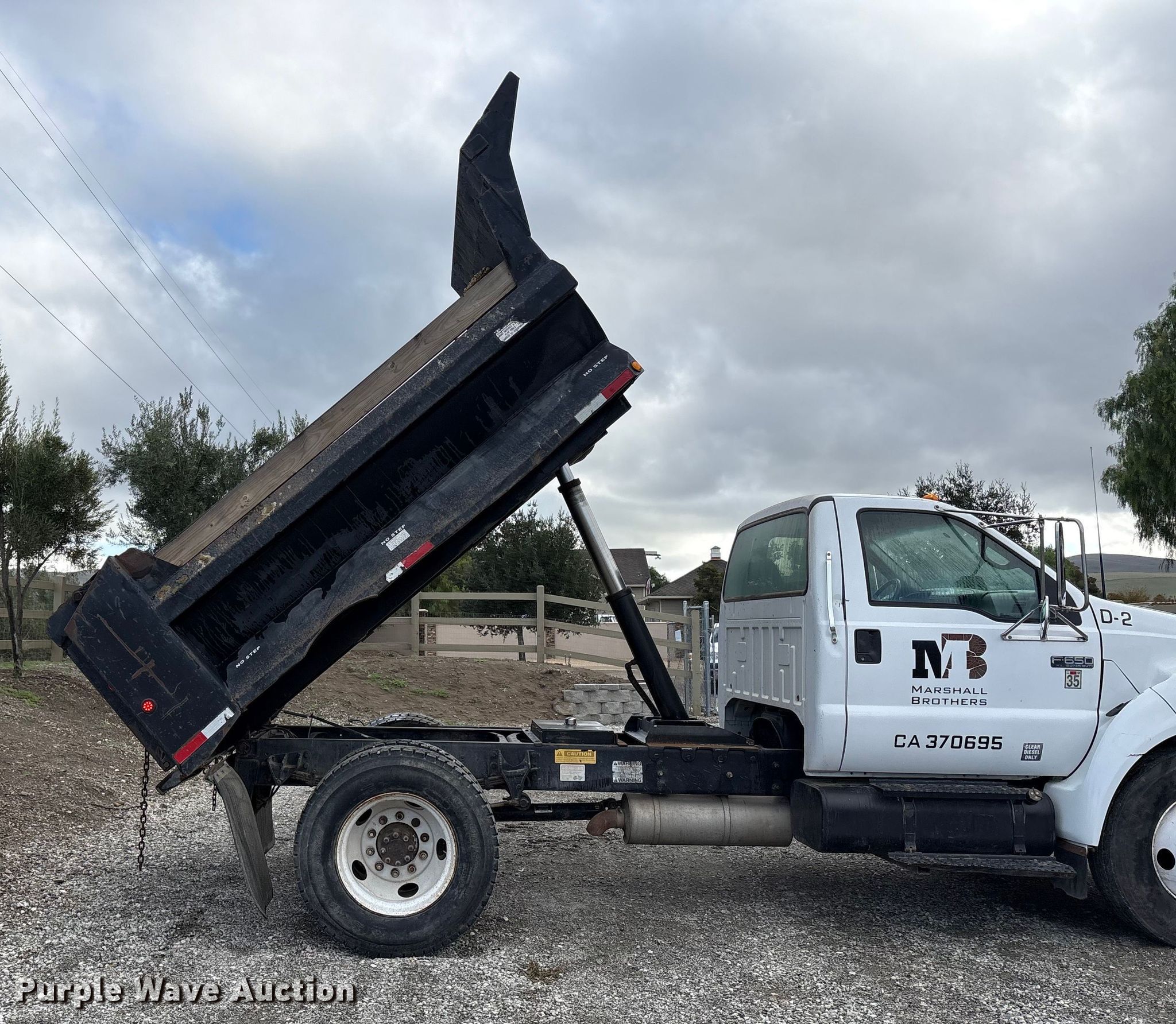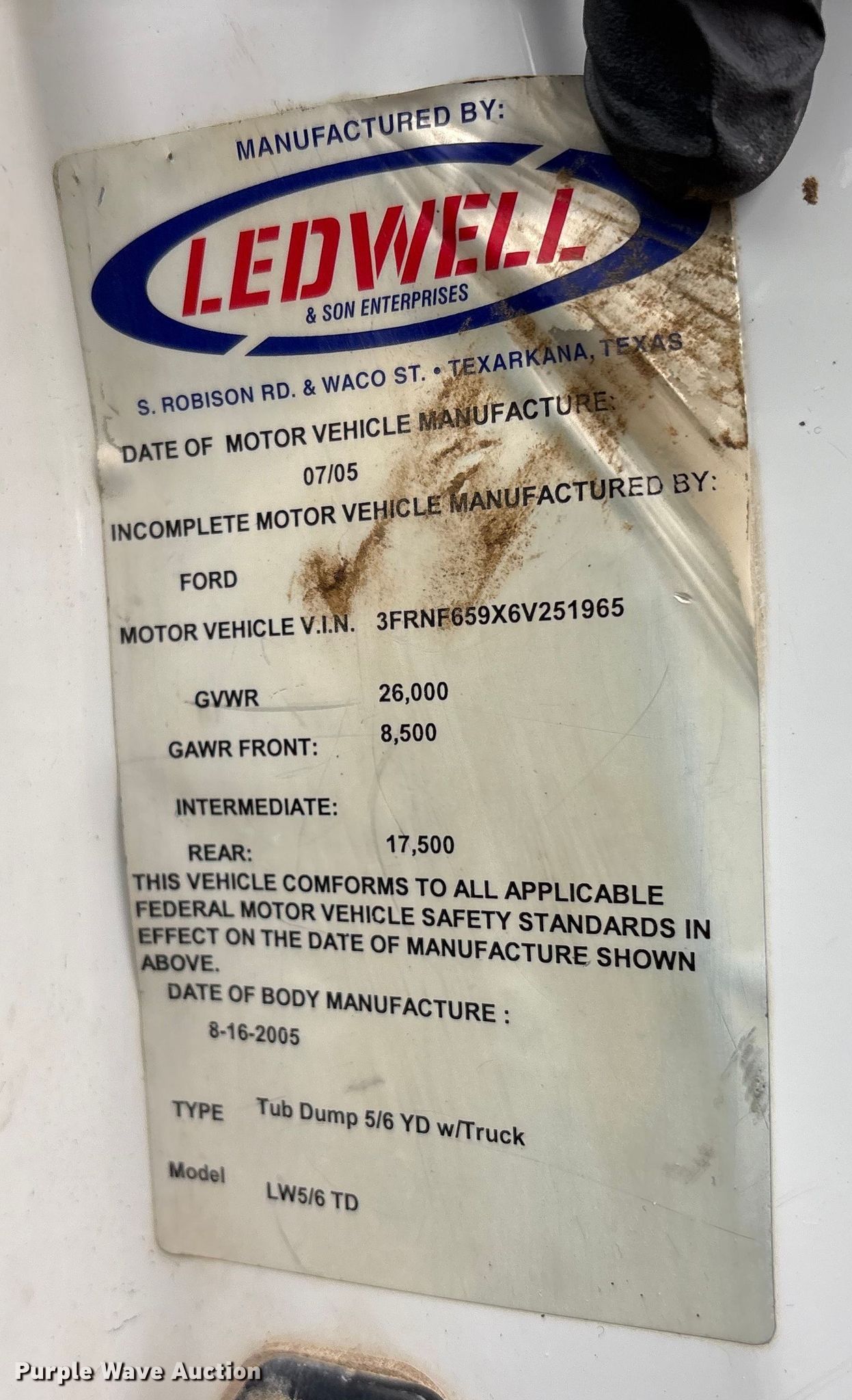 2006 Ford F650 dump truck. Miles: 82,830 on odometer, Hours: 7,906 on meter, VIN: 3FRNF659X6V251965. Engine Caterpillar C7, Serial: SAP88572, Displacement: 7.2L, Cylinders: 6, Fuel type: Diesel, HP: 190, kW: 142. Transmission Manual, Speed: 6. Chassis Axles: Single, Suspension: Spring, Brakes: Hydraulic, PTO, GVWR: 26,000 lbs FAWR: 8,500 lbs, RAWR: 17,500 lbs. Interior AC, Heat, Cruise control. Features Bed Dump bed, Length: 10' 120", Width: 96", Capacity: 5 cu.yd., Side height: 32", Side board height: 6", Bed type: Steel, Ram: Single, End gate: Manual. Tires Front: 10/R22.5, Rear: 295/75R22.5. Notes Dash warning indicator: Brake. California title. Title distribution may be delayed up to 30 days from verification of funds. Marshall Brothers Enterprises, Inc.. Livermore, CA 94550
