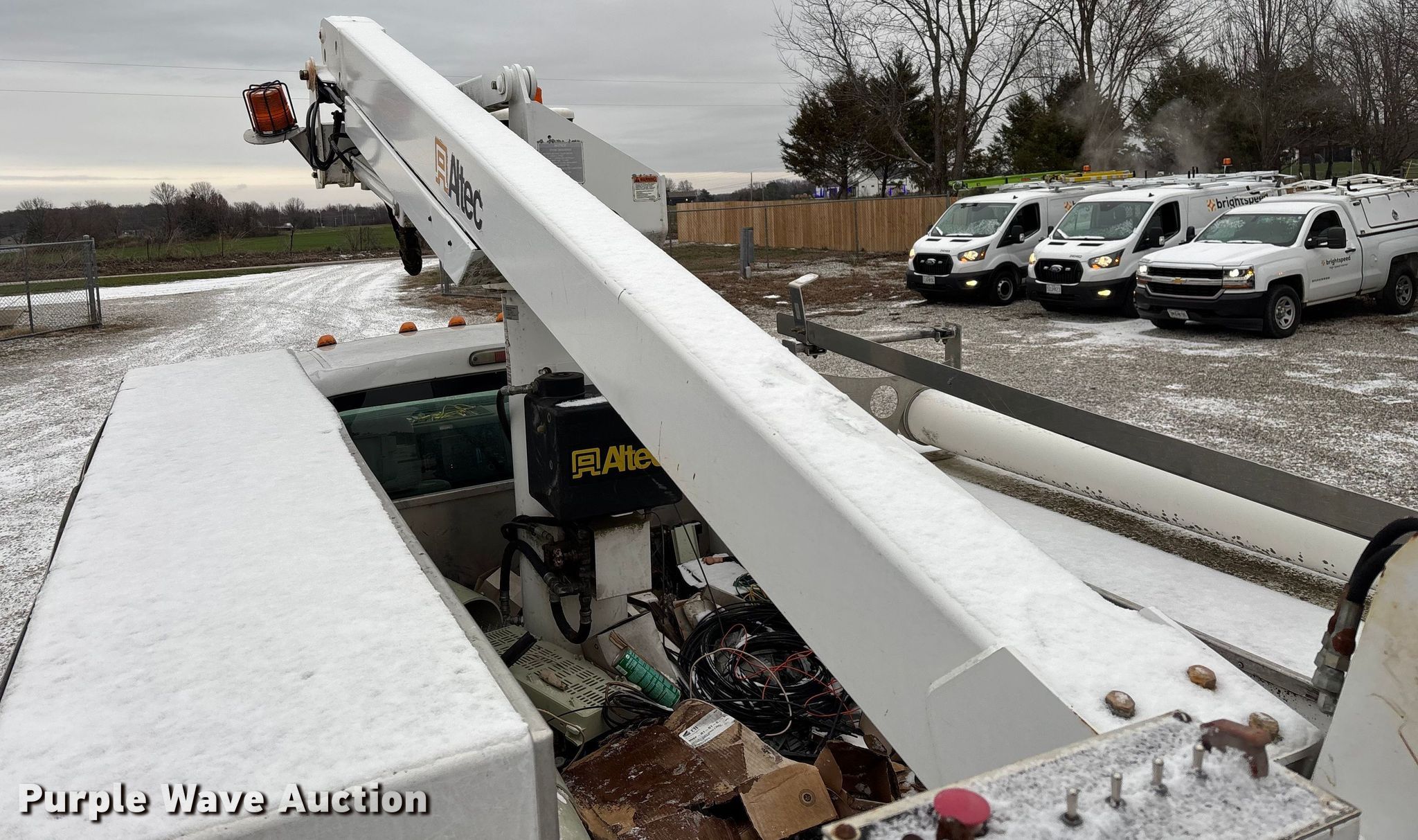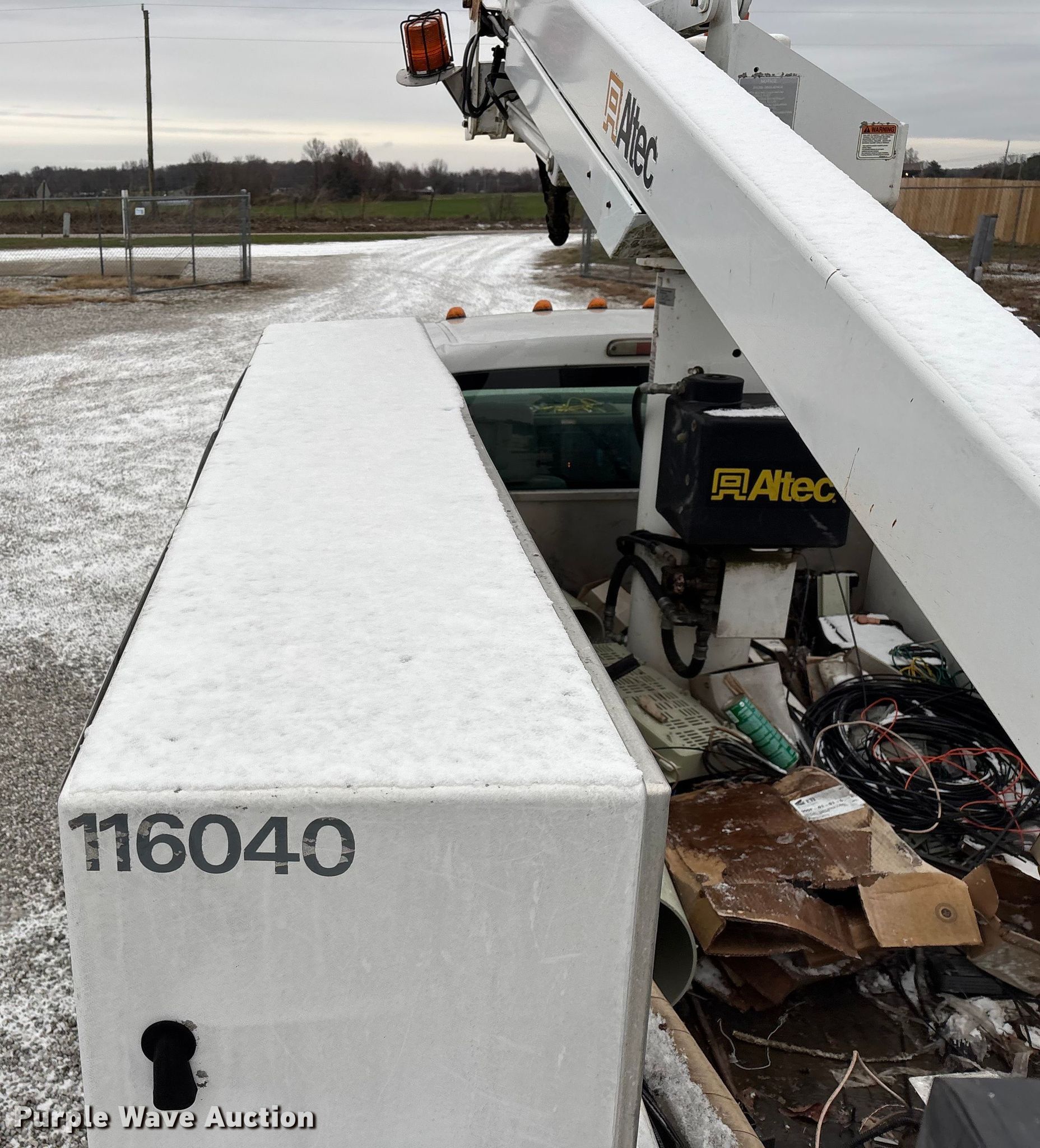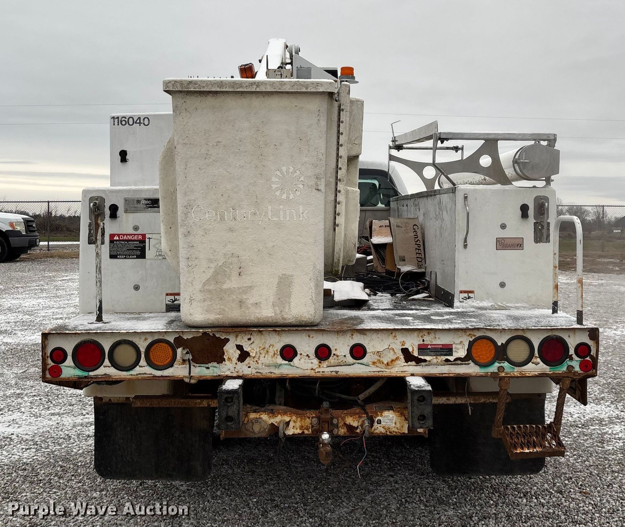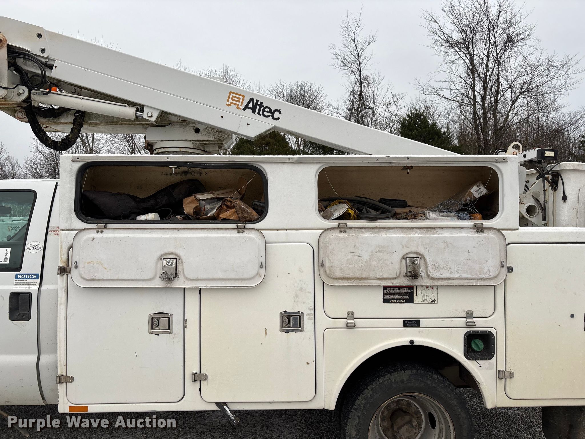 2011 Ford F450 Super Duty bucket truck. Miles: 213,318 on odometer, VIN: 1FDUF4GY2BEB20600, Unit #: 116040. Engine Displacement: 6.8L, Cylinders: 10, Fuel type: Gas. Transmission Automatic. Chassis Axles: Single, Suspension: Spring, Brakes: Hydraulic, PTO, GVWR: 16,500 lbs, Wheelbase: 165". Interior AC, Heat, Auxiliary controls, Brake controller. Features Bed Utility bed, BrandFX, Serial: 10 28371, Length: 11', Width: 97", Height: 58", Boom Altec AT235, Serial: 1110BX4310, Boom length: 13', Maximum lift capacity: 350 lbs, Maximum lift height: 35', Boom type: Articulating, Telescopic, Man basket, Boom controls Ground, Platform/ basket.. Tires Size: 225/70R19.5. Notes Contents not included, Toolbox damage, hole in floor, Driver side seat belt damage, Boom support stand damaged, Jump start required during on-site data collection, Non-operational boom. Missouri title. Title distribution may be delayed up to 30 days from verification of funds. Brightspeed. Ozark, MO 65721