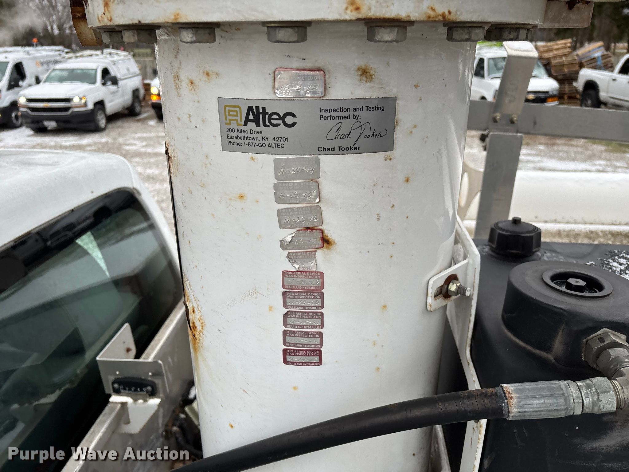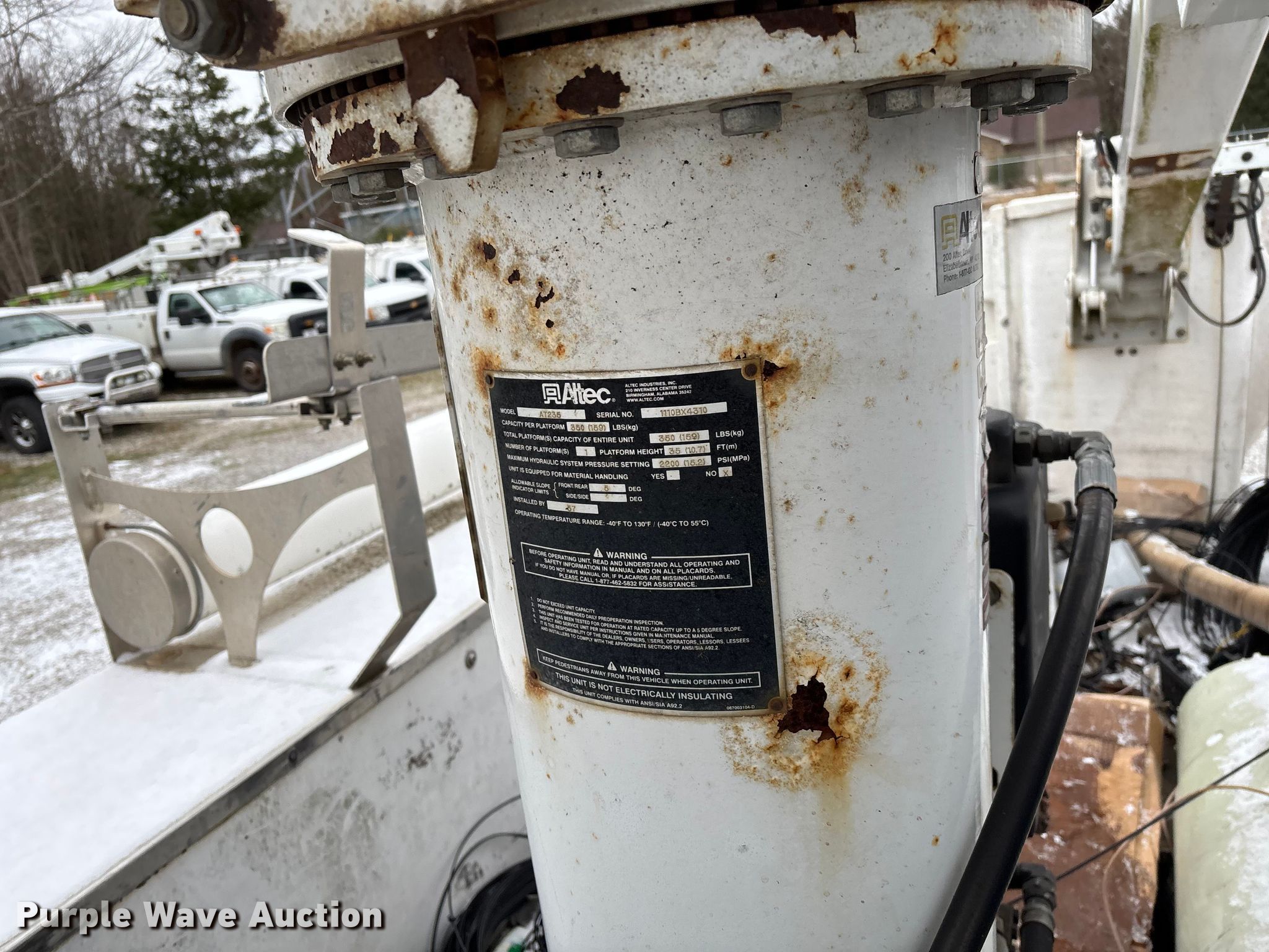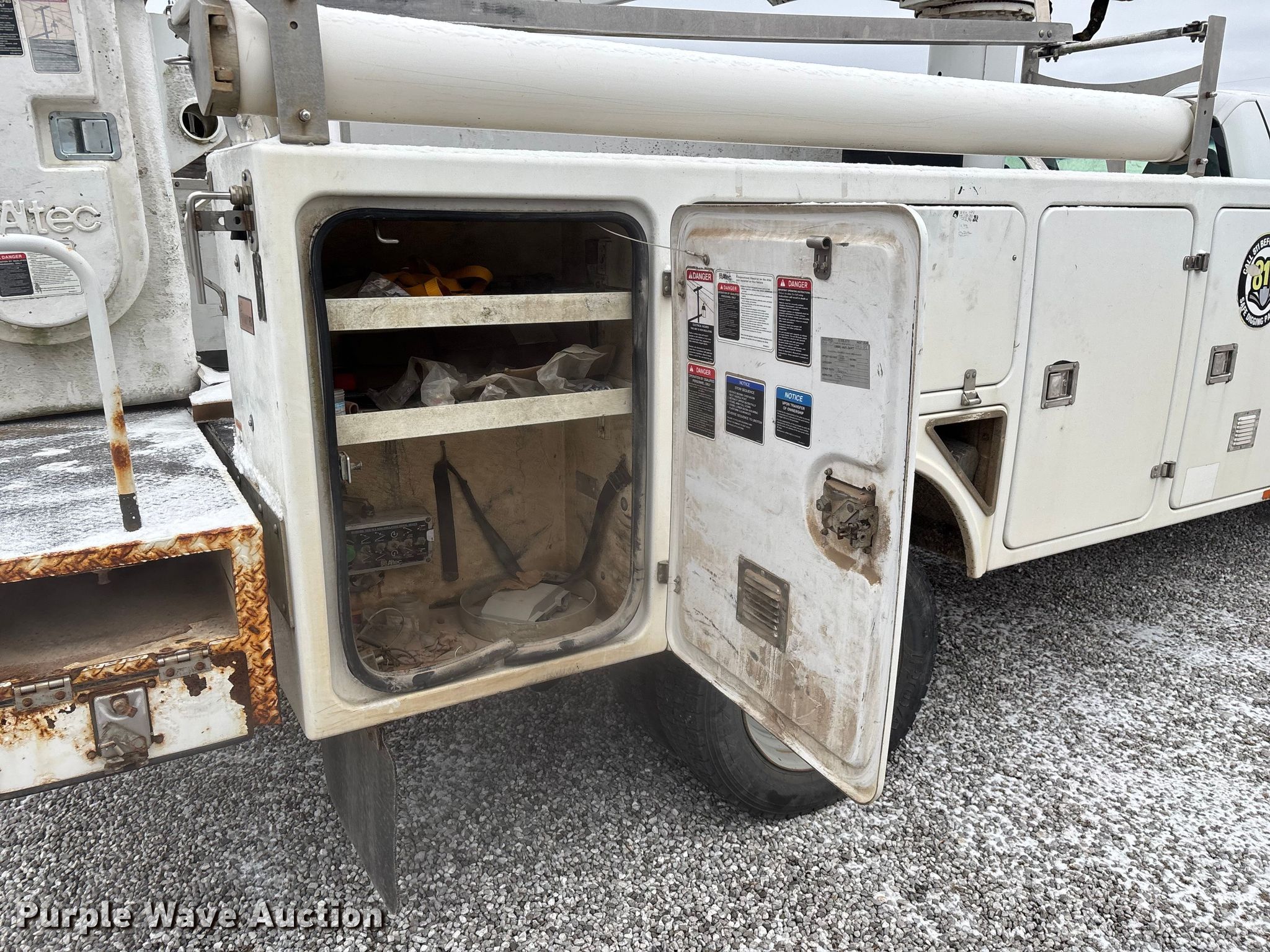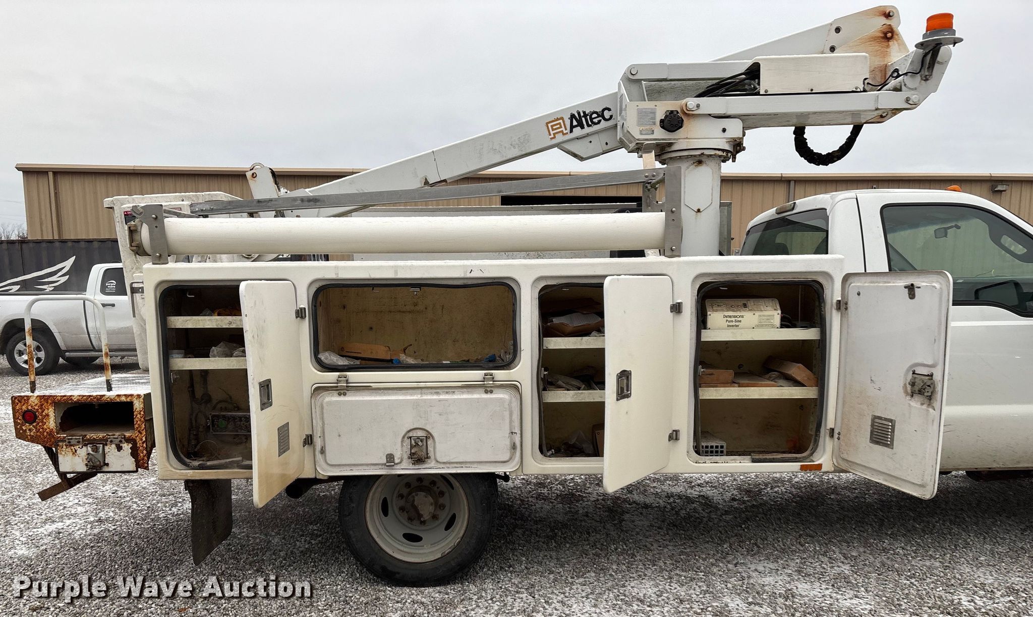 2011 Ford F450 Super Duty bucket truck. Miles: 213,318 on odometer, VIN: 1FDUF4GY2BEB20600, Unit #: 116040. Engine Displacement: 6.8L, Cylinders: 10, Fuel type: Gas. Transmission Automatic. Chassis Axles: Single, Suspension: Spring, Brakes: Hydraulic, PTO, GVWR: 16,500 lbs, Wheelbase: 165". Interior AC, Heat, Auxiliary controls, Brake controller. Features Bed Utility bed, BrandFX, Serial: 10 28371, Length: 11', Width: 97", Height: 58", Boom Altec AT235, Serial: 1110BX4310, Boom length: 13', Maximum lift capacity: 350 lbs, Maximum lift height: 35', Boom type: Articulating, Telescopic, Man basket, Boom controls Ground, Platform/ basket.. Tires Size: 225/70R19.5. Notes Contents not included, Toolbox damage, hole in floor, Driver side seat belt damage, Boom support stand damaged, Jump start required during on-site data collection, Non-operational boom. Missouri title. Title distribution may be delayed up to 30 days from verification of funds. Brightspeed. Ozark, MO 65721