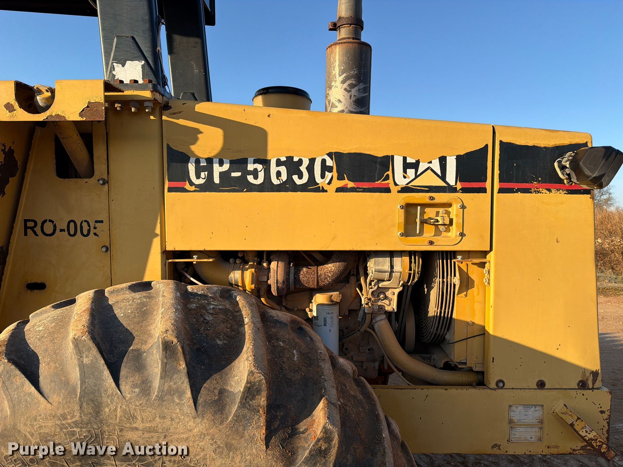 1999 Caterpillar CP-563C single drum vibratory roller. Hours: 7,713 on meter, Serial: 5KN00332. Engine Caterpillar 3116, Serial: 4TF52156, Displacement: 6.6L, Cylinders: 6, Fuel type: Diesel, HP: 170, kW: 127. Transmission Hydrostatic. Operators station OROPS, Vandal cover. Features Drum Drum type: Padfoot, Vibratory system: Two speed, Width: 84", Diameter: 59", Drum scrapers. Tires Size: 23.1-26. Notes Unknown operating condition of two speed travel. Holy Contractors LLC - Open inspection December 11, 2025. Aquilla, TX 76622